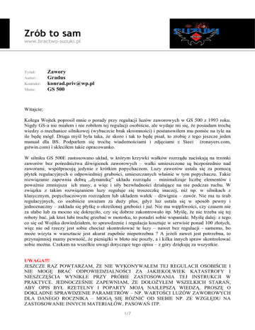 Zrób to sam www.bractwo-suzuki.pl Tytuł: Autor: Kontakt: Moto: Zawory Gradus [email protected] GS 500 Witajcie; Kolega Wojtek poprosił mnie o porady przy regulacji luzów zaworowych w GS 500 z 1993 roku. Nigdy GS-a nie miałem i nie robiłem tej regulacji osobiście, ale wydaje mi się, że posiadam trochę wiedzy o mechanice silnikowej (wybaczcie brak skromności) i postanowiłem mu pomóc na tyle na ile będę mógł. Druga myśl była taka, że skoro i tak to będę pisał, to zrobię z tego jeszcze jeden manual dla BS. Podparłem się trochę wiadomościami i zdjęciami z Sieci (ronayers.com, gstwin.com) i skleciłem takie opracowanko. W silniku GS 500E zastosowano układ, w którym krzywki wałków rozrządu naciskają na trzonki zaworów bez pośrednictwa dźwigienek zaworowych – wałki umieszczone są bezpośrednio nad zaworami, współpracują jedynie z krótkim popychaczem. Luzy zaworów ustala się za pomocą płytek regulacyjnych o odpowiedniej grubości, umieszczanych właśnie w tym popychaczu. Takie rozwiązanie zapewnia dobrą „dynamikę” układu rozrządu – minimalizuje liczbę elementów i poważnie zmniejsza ich masy, a więc i siły bezwładności działające na nie podczas ruchu. W związku z takim rozwiązaniem luzy reguluje się troszeczkę inaczej, niż np. w silnikach z klasycznym, popychaczowym rozrządem lub układem wałek – dźwignia – zawór. Nie ma tu śrub regulacyjnych, co osobiście uważam za duży plus, gdyż luz ustala się w sposób pewny i jednoznaczny – zakłada się płytkę o określonej grubości i już. Nie ma wątpliwości, czy czasem nie za słabo lub za mocno się dokręciło, czy się dobrze zakontrowało itp. Myślę, że nie trzeba się tej roboty bać, jak ktoś lubi trochę grzebać w motorku, to poradzi sobie wspaniale. Myślę dalej: z tego co się od Wojtka dowiedziałem, to sprawdzenie i regulacja kosztuje w serwisie ponad 100 złotych, więc nie od rzeczy jest sobie chociaż skontrolować te luzy – nawet bez regulacji - samemu, bo może wizyta w warsztacie jest akurat zupełnie niepotrzebna ? A jeżeli nawet jest potrzebna, to przynajmniej mamy pewność, że pieniążki w błoto nie poszły, a i kilka innych spraw skontrolować sobie można. Czekam na wszelkie uwagi dotyczące tego opisu – z góry dziękuję za wszystkie. UWAGA!!! JESZCZE RAZ POWTARZAM, ŻE NIE WYKONYWAŁEM TEJ REGULACJI OSOBIŚCIE I NIE MOGĘ BRAĆ ODPOWIEDZIALNOŚCI ZA JAKIEKOLWIEK KATASTROFY I NIESZCZĘŚCIA WYNIKŁE PRZY PRÓBIE ZASTOSOWANIA TEJ INSTRUKCJI W PRAKTYCE. JEDNOCZEŚNIE ZAPEWNIAM, ŻE DOŁOŻYŁEM WSZELKICH STARAŃ, ABY OPIS BYŁ RZETELNY I POPARTY MOJĄ NAJLEPSZĄ WIEDZĄ. PROSZĘ O DOKŁADNE SPRAWDZENIE PARAMETRÓW – NP. WARTOŚCI LUZÓW ZAWOROWYCH DLA DANEGO ROCZNIKA – MOGĄ SIĘ RÓŻNIĆ OD SIEBIE NP. ZE WZGLĘDU NA ZASTOSOWANIE INNYCH MATERIAŁÓW, PASOWAŃ ITP. 1/7 www.Bractwo-Suzuki.pl Zawory Po tych ostrzeżeniach proponuję zaczynać. Na początku zapoznajmy się z układem rozrządu GS 500E – co tu jest co (pominąłem numery części nieistotnych dla nas): 1-2. 3. 8-9. 10. 15. 16. 17. 18. 19. 20. 21. 22. 23. 24. Wałek rozrządu, dla zaworów dolotowych Podkładka regulująca luz osiowy wałka Wałek rozrządu, dla zaworów wydechowych Podkładka regulująca luz osiowy wałka popychacz zaworu dolotowego popychacz zaworu wydechowego zawór dolotowy zawór wydechowy sprężyny zaworów górna miseczka sprężyny kliny zamka zaworu dolna miseczka sprężyny uszczelniacz trzonka zaworu PŁYTKI REGULACYJNE 2/7 www.Bractwo-Suzuki.pl Zawory Aby dostać się do układu rozrządu, należy trochę motorek rozbebeszyć. 1. Demontujemy zbiornik (2 śruby, należy też oczywiście zakręcić zawór pod zbiornikiem i pościągać przewody paliwowe, zapamiętując, jak były podłączone). 2. Zdejmujemy „airbox” – filtr powietrza z obudową – cztery śruby – po jednej z lewej i prawej strony ramy i dwie mocujące filtr do gaźników. Przy okazji można zbadać stan uszczelnienia między gaźnikami a filtrem. Następnie demontujemy zespół gaźników (dwie śruby mocujące go do kolektora dolotowego), uprzednio odłączając linki gazu i ssania oraz rurki paliwowe i podciśnienia (pooznaczać, gdzie co było, potem będzie łatwiej!!!). 3. Zdejmujemy pokrywę głowicy (4 śruby odpowietrznika oraz 6 śrub pokrywy) i oczom naszym ukazuje się prawie kompletny układ rozrządu. 3/7 www.Bractwo-Suzuki.pl Zawory UWAGA!!! TRZEBA ZWRÓCIĆ UWAGĘ NA STAN USZCZELKI POKRYWY GŁOWICY, TO ULUBIONE MIEJSCE WYCIEKÓW OLEJU W STARSZYCH MOTORKACH – OSOBIŚCIE JESTEM ZA TYM, ŻEBY WYMIENIAĆ JĄ ZA KAŻDYM RAZEM, KIEDY SIĘ TO ROZBIERA, NAWET, JEŻELI NIE JEST BARDZO „WYGNIECIONA”, ALE MOŻE ONA CHYBA KOSZTOWAĆ PARĘ ZŁOTYCH – TAK WIĘC PRZEDE WSZYSTKIM DOKŁADNA KONTROLA I W RAZIE POTRZEBY WYMIANKA. 4. Teraz troszke teorii. Nieważne, jaka jest konstrukcja układu rozrządu – przy kontroli luzów zaworowych istotne jest uchwycenie momentu, kiedy zawór jest całkowicie zamknięty – wtedy właśnie kontroluje się luzy. Układ w GS500 jest prosty i nie nastręcza trudności w ustaleniu tego położenia: A – zawór całkowicie zamknięty, można mierzyć luz B – zawór całkowicie otwarty, jak widać nie ma nawet czego mierzyć C – zawór częściowo otwarty, luzu też nie ma Zdejmujemy prawą pokrywę silnika i za pomocą klucza 19mm obracamy wałem silnika tak, aby wałek rozrządu znalazł się w odpowiednim ustawieniu (rysunek powyżej). 4/7 www.Bractwo-Suzuki.pl Zawory Wsuwamy blaszkę szczelinomierza między popychacz a krzywkę wałka rozrządu i sprawdzamy luzik. Układ skonstruowany w ten sposób co w GS 500 charakteryzuje się generalnie bardzo małymi luzami w stosunku do innych rozwiązań, a to ze względu na małą liczbę współpracujących ze sobą części - luzy na połączeniu każdej „pary” się sumują. Gdzieś wynalazłem, że dla GS 500E to 0,03 – 0,08 mm (dla wszystkich zaworów),