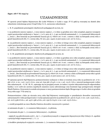 Sygn. akt V Kz 234/14 UZASADNIENIE W sprawie przed Sądem Rejonowym dla Lodzi Widzewa w Łodzi o sygn. IV K 398/13 wszczętej na skutek aktu oskarżenia wniesionego przez Urząd Celny I w Ł. zarzucono oskarżonym: 1. R. N. popełnienie przestępstw skarbowych polegających na tym, że: I. na podstawie umowy najmu (...) oraz umowy najmu (...) w dniu 13 grudnia 2011 roku urządzał, poprzez wynajęcie części powierzchni użytkowej w barze (...) w Ł. przy ul. (...), gry na dwóch automatach (...) o numerach fabrycznych (...)oraz (...)bez koncesji na prowadzenie kasyna gry tj. wbrew art. 6 ust. 1 ustawy z dnia 19 listopada 2009 roku o grach hazardowych (Dz. U. z 2009 roku, Nr 201, poz. 1540), to jest czynu z art. 107 § 1 k.k.s.; II. na podstawie umowy najmu (...) oraz umowy najmu (...) w dniu 10 lutego 2012 roku urządzał, poprzez wynajęcie części powierzchni użytkowej w barze (...) w Ł. przy ul. (...), gry na dwóch automatach (...) o numerach fabrycznych (...)oraz (...)bez koncesji na prowadzenie kasyna gry tj. wbrew art. 6 ust. 1 ustawy z dnia 19 listopada 2009 roku o grach hazardowych (Dz. U. z 2009 roku, Nr 201, poz. 1540), to jest czynu z art. 107 § 1 k.k.s.; 2. G. M. popełnienie przestępstw skarbowych polegających na tym, że: I. na podstawie umowy najmu (...) oraz umowy najmu (...) w dniu 13 grudnia 2011 roku urządzał, poprzez wynajęcie części powierzchni użytkowej w barze (...) w Ł. przy ul. (...), gry na dwóch automatach (...) o numerach fabrycznych (...)oraz (...)bez koncesji na prowadzenie kasyna gry tj. wbrew art. 6 ust. 1 ustawy z dnia 19 listopada 2009 roku o grach hazardowych (Dz. U. z 2009 roku, Nr 201, poz. 1540), to jest czynu z art. 107 § 1 k.k.s.; II. na podstawie umowy najmu (...) oraz umowy najmu (...) w dniu 10 lutego 2012 roku urządzał, poprzez wynajęcie części powierzchni użytkowej w barze (...) w Ł. przy ul. (...), gry na dwóch automatach (...) o numerach fabrycznych (...)oraz(...)bez koncesji na prowadzenie kasyna gry tj. wbrew art. 6 ust. 1 ustawy z dnia 19 listopada 2009 roku o grach hazardowych (Dz. U. z 2009 roku, Nr 201, poz. 1540), to jest czynu z art. 107 § 1 k.k.s. W opisanej sprawie Sąd Rejonowy postanowieniem wydanym w dniu 9 września 2013 roku na podstawie art. 17 § 1 pkt 2 k.k. w zw. z art. 113 § 1 k.k.s. oraz art. 632 pkt 2 k.p.k. w zw. z art. 113 § 1 k.k.s. umorzył postępowanie wobec obu oskarżonych – G. M. i R. N., opierając się na przyjętej ocenie, że żaden z czynów inkryminowanych odpowiednio każdej z w/w osób nie zawiera zupełnych znamion czynu zabronionego oraz kosztami tego postępowania obciążył Skarb Państwa. Orzeczenie to zostało utrzymane w mocy postanowieniem Sądu Okręgowego w Łodzi z dnia 20 grudnia 2013 roku sygn. V Kz 909/13. Postanowieniem z dnia 30 stycznia 2014 roku Sąd Rejonowy rozstrzygając w przedmiocie dowodów rzeczowych zatrzymanych w toku postępowania w wyżej opisanej sprawie na podstawie art. 420 § 1 k.p.k. w zw. z art. 113 § 1 k.k.s., art. 22 § 3 pkt 6 k.k.s., art. 43 § 1 pkt 4 k.k.s, art. 230 § 2 k.p.k. w zw. z art. 113 § 1 k.k.s.: 1. orzekł przepadek na rzecz Skarbu Państwa dowodów rzeczowych w postaci: a) automatu do gier (...) o numerze fabrycznym (...)z pilotem, b) automatu do gier (...) o numerze fabrycznym (...)z pilotem - zajętych wg pokwitowania serii (...)nr (...) i przechowywanych w magazynie depozytowym Izby Celnej w Ł. zgodnie z pozycją księgi magazynowej (...) (...); c) środków pieniężnych wyjętych z automatu (...) o numerze fabrycznym (...)w kwocie 600 zł, d) środków pieniężnych wyjętych z automatu (...) o numerze fabrycznym (...)w kwocie 450 zł - przechowywanych na koncie sum depozytowych Izby Celnej w Ł. zgodnie z pozycją księgi magazynowej (...) (...); e) automatu do gier (...) o numerze fabrycznym (...), f) automatu do gier (...) o numerze fabrycznym (...), g) dwóch pilotów na podczerwień - zajętych zgodnie z pokwitowaniem(...) (...) i przechowywanych w magazynie depozytowym Izby Celnej w Ł. pod pozycją księgi magazynowej (...) (...); h) środków pieniężnych wyjętych z automatu (...) o numerze fabrycznym (...)w kwocie 8 320,00 zł, i) środków pieniężnych wyjętych z automatu (...) o numerze fabrycznym (...)w kwocie 3 280,00 zł - przechowywanych na koncie sum depozytowych Izby Celnej w Ł. zgodnie z pozycją księgi magazynowej (...) (...); 2. zwrócić R. N. dowody rzeczowe w postaci: a) zeszytu z napisem (...) notes”, b) ośmiu sztuk luźnych kartek opatrzonych odręcznymi zapiskami - przechowywanych na karcie 26 akt sprawy. Zażalenia na powyższe postanowienie z dnia 30 stycznia 2014 roku w zakresie rozstrzygnięć zawartych w punkcie 1 w całości – o przepadku na rzecz Skarbu Państwa wymienionych i opisanych tam dowodów rzeczowych, złożyli pełnomocnik interwenienta (...) spółka z o.o. oraz obrońca G. M.. W zażaleniu pełnomocnika interwenienta (...) spółka z o.o. zarzucono skarżonemu orzeczeniu: 1. obrazę prawa materialnego, a to art. 43 § 1 pkt 4 k.k.s. przez jego błędne zastosowanie i orzeczenie tytułem środka zabezpieczającego przepadku automatów do gier zręcznościowych uprzednio zatrzymanych, z uwagi na fakt, iż zachodzi okoliczność wyłączająca ukaranie sprawcy czynu zabronionego, podczas gdy postępowanie przeciwko oskarżonym umorzono z uwagi z uwagi na brak przestępstwa, a więc w oparciu o treść art. 17 § 1 pkt 2 in proncipio k.p.k. tj. przesłankę negatywną, niestanowiącą okoliczności wyłączających ukaranie sprawcy czynu zabronionego, 2. obrazę prawa materialnego, a to art. 22 § 2 pkt 2 k.k.s. przez jego błędną wykładnię i nieprawidłowe przyjęcie, iż środki pieniężne pochodzące z zabezpieczonych automatów do gier zręcznościowych są „dowodami rzeczowymi” podlegającymi przepadkowi, 3. obrazę prawa procesowego, a to art. 420 § 4 k.p.k. przez niepouczenie skarżącego, że na wydane przez Sąd Rejonowy postanowienie z dnia