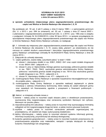 UCHWAŁA Nr IX.81.2015 RADY GMINY NADARZYN z dnia 24 czerwca 2015 r. w sprawie uchwalenia miejscowego planu zagospodarowania przestrzennego dla części wsi Wolica w Gminie Nadarzyn dla obszarów I, II, IV Na podstawie art. 18 ust. 2 pkt 5 ustawy z dnia 8 marca 1990 r. o samorządzie gminnym (Dz. U. z 2013 r. poz. 594 ze zmianami), art. 20 ust. 1 ustawy z dnia 27 marca 2003 r. o planowaniu i zagospodarowaniu przestrzennym (Dz. U. z 2015 r. poz. 199) oraz w związku z podjęciem Uchwały Nr XLVI/464/2014 z dnia 30 lipca 2014 r. w sprawie przystąpienia do sporządzenia miejscowego planu zagospodarowania przestrzennego dla części wsi Wolica w Gminie Nadarzyn, Rada Gminy Nadarzyn uchwala, co następuje: §1. 1. Uchwala się miejscowy plan zagospodarowania przestrzennego dla części wsi Wolica w Gminie Nadarzyn dla obszarów I, II, IV, zwany dalej „planem”, po stwierdzeniu że nie narusza on ustaleń studium uwarunkowań i kierunków zagospodarowania przestrzennego gminy Nadarzyn uchwalonego Uchwałą Nr XLII/420/2014 Rady Gminy Nadarzyn z dnia 26 marca 2014 r. 2. Załączniki do uchwały stanowią: 1) części graficzne, zwane dalej „rysunkami planu” w skali 1:1000: a) obszar I, stanowiący działki nr ew. 638/1, 638/2 i 641 oraz część działek drogowych nr ew. 640/4 i 854 - załącznik nr 1, b) obszar II, przy ul. Sękocińskiej, którego granice wyznaczają: północne granice działek nr ew. 795/1, 793/2, 794/2, wschodnia granica administracyjna Gminy Nadarzyn, północna i wschodnia granica działki drogowej nr ew. 781/4 oraz wschodnia granica działki drogowej nr ew. 781/3 - załącznik nr 2, c) obszar IV, stanowiący działkę nr ew. 471 - załącznik nr 3; 2) rozstrzygnięcie Rady Gminy Nadarzyn o sposobie rozpatrzenia nieuwzględnionych uwag do projektu planu - załącznik nr 4; 3) rozstrzygnięcie Rady Gminy Nadarzyn o sposobie realizacji zapisanych w planie inwestycji z zakresu infrastruktury technicznej, które należą do zadań własnych gminy oraz zasadach ich finansowania, zgodnie z przepisami o finansach publicznych załącznik nr 5. §2. Ilekroć w niniejszej uchwale mowa o: 1) terenie – należy przez to rozumieć część obszaru planu o określonym przeznaczeniu, wyznaczoną linią rozgraniczającą oraz oznaczoną symbolem literowym lub cyfrowoliterowym na rysunku planu; 2) nieprzekraczalnej linii zabudowy – należy przez to rozumieć linię wyznaczającą minimalną odległość od linii rozgraniczającej drogę lub teren, w jakiej można sytuować budynek; 3) szyldzie – należy przez to rozumieć oznaczenia jednostki organizacyjnej lub przedsiębiorcy, ich siedzib lub miejsc wykonywanej działalności; 4) tablicy informacyjnej – należy przez to rozumieć element systemu informacji gminnej, informacji turystycznej, przyrodniczej lub edukacji ekologicznej; 5) budynku garażowo-gospodarczym – należy przez to rozumieć budynek przeznaczony do przechowywania pojazdów oraz materiałów, narzędzi i sprzętu służących do obsługi budynku mieszkalnego lub usługowego; 1 6) zieleni ozdobnej – należy przez to rozumieć kształtowane przez człowieka skupiska drzew i krzewów wraz z pozostałymi składnikami szaty roślinnej, podnoszące walory estetyczne przestrzeni; 7) zieleni niskiej - należy przez to rozumieć trawy oraz krzewy i drzewa o wysokości do 1,5 m; 8) zieleni izolacyjnej – należy przez to rozumieć pasy zieleni wysokiej, średniej złożone z drzew i krzewów, głównie zimozielonych, o zwartej strukturze i ukształtowane w taki sposób, aby minimalizować uciążliwości wynikające z zagospodarowania i przeznaczenia terenu; 9) ogrodzeniu pełnym – należy przez to rozumieć ogrodzenie, w którym udział powierzchni ażurowej jest mniejszy niż 25%; 10) sięgaczu dojazdowym – należy przez to rozumieć wysuniętą część działki o szerokości co najmniej 5,0 m i długości maksymalnie 60,0 m, przez którą odbywa się dostęp z działki budowlanej do drogi; 11) infrastrukturze towarzyszącej – należy przez to rozumieć wszelkie urządzenia techniczne, w tym między innymi lokalne obiekty oczyszczania ścieków bytowych oraz przyzakładowe obiekty podczyszczania ścieków przemysłowych, sieci i inne urządzenia infrastruktury technicznej oraz dojazdy, place manewrowe, place postojowe i parkingi związane z użytkowaniem obiektu budowlanego. §3. Ustala się następujące przeznaczenie terenów: 1) tereny zabudowy mieszkaniowej jednorodzinnej oznaczone na rysunku planu symbolami 1MN, 2MN; 2) tereny zabudowy mieszkaniowej jednorodzinnej wraz z zabudową usługową oznaczone na rysunku planu symbolami 1MN/U, 2MN/U, 3MN/U; 3) tereny zabudowy usługowej oraz obiektów produkcyjnych, składów i magazynów oznaczone na rysunku planu symbolami 1U/P, 2U/P, 3U/P; 4) teren wód powierzchniowych śródlądowych oznaczony na rysunku planu symbolem WS; 5) tereny komunikacji: a) teren drogi publicznej klasy zbiorczej oznaczony na rysunku planu symbolem KDZ, b) tereny dróg publicznych klasy lokalnej oznaczone na rysunku planu symbolami 1KDL, 2KDL, c) teren drogi publicznej klasy dojazdowej oznaczony na rysunku planu symbolem KDD, d) teren publicznego ciągu pieszo-jezdnego oznaczony na rysunku planu symbolem KDX. §4. W zakresie zasad ochrony i kształtowania ładu przestrzennego ustala się: 1) nakaz sytuowania budynków przy uwzględnieniu nieprzekraczalnych linii zabudowy, zgodnie z rysunkiem planu z dopuszczeniem wysunięcia poza tę linię na odległość nie większą niż: a) 1,5 m - okapów, gzymsów, balkonów, tarasów, schodów zewnętrznych, b) 3,0 m – pochylni i spoczników; 2) dopuszczenie remontu, rozbudowy, przebudowy, nadbudowy i odbudowy istniejących obiektów budowlanych z zachowaniem parametrów określonych w planie oraz rozbiórki; 3) dopuszczenie zachowania liczby kondygnacji, geometrii dachu oraz kolorystyki elewacji i kolorystyki pokrycia dachowego w przypadku rozbudowy; 4) dopuszczenie remontów istniej