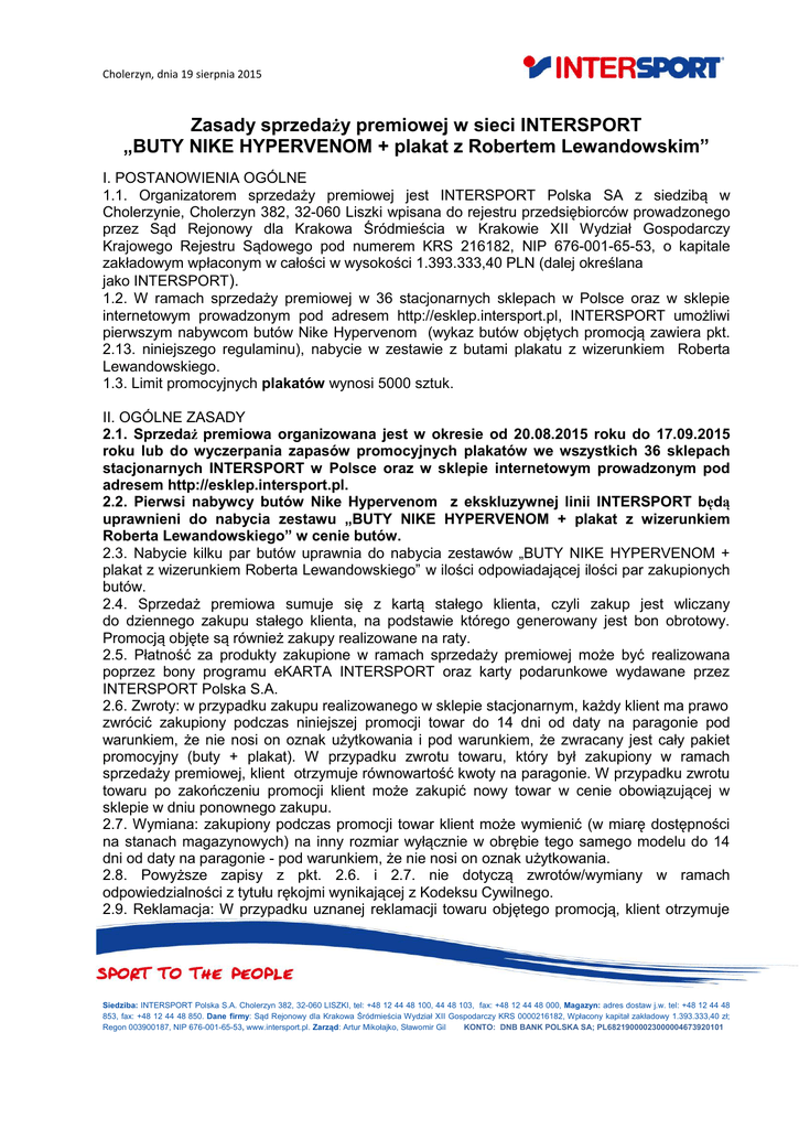Cholerzyn, dnia 19 sierpnia 2015 Zasady sprzedaży premiowej w sieci INTERSPORT „BUTY NIKE HYPERVENOM + plakat z Robertem Lewandowskim” I. POSTANOWIENIA OGÓLNE 1.1. Organizatorem sprzedaży premiowej jest INTERSPORT Polska SA z siedzibą w Cholerzynie, Cholerzyn 382, 32-060 Liszki wpisana do rejestru przedsiębiorców prowadzonego przez Sąd Rejonowy dla Krakowa Śródmieścia w Krakowie XII Wydział Gospodarczy Krajowego Rejestru Sądowego pod numerem KRS 216182, NIP 676-001-65-53, o kapitale zakładowym wpłaconym w całości w wysokości 1.393.333,40 PLN (dalej określana jako INTERSPORT). 1.2. W ramach sprzedaży premiowej w 36 stacjonarnych sklepach w Polsce oraz w sklepie internetowym prowadzonym pod adresem http://esklep.intersport.pl, INTERSPORT umożliwi pierwszym nabywcom butów Nike Hypervenom (wykaz butów objętych promocją zawiera pkt. 2.13. niniejszego regulaminu), nabycie w zestawie z butami plakatu z wizerunkiem Roberta Lewandowskiego. 1.3. Limit promocyjnych plakatów wynosi 5000 sztuk. II. OGÓLNE ZASADY 2.1. Sprzedaż premiowa organizowana jest w okresie od 20.08.2015 roku do 17.09.2015 roku lub do wyczerpania zapasów promocyjnych plakatów we wszystkich 36 sklepach stacjonarnych INTERSPORT w Polsce oraz w sklepie internetowym prowadzonym pod adresem http://esklep.intersport.pl. 2.2. Pierwsi nabywcy butów Nike Hypervenom z ekskluzywnej linii INTERSPORT będą uprawnieni do nabycia zestawu „BUTY NIKE HYPERVENOM + plakat z wizerunkiem Roberta Lewandowskiego” w cenie butów. 2.3. Nabycie kilku par butów uprawnia do nabycia zestawów „BUTY NIKE HYPERVENOM + plakat z wizerunkiem Roberta Lewandowskiego” w ilości odpowiadającej ilości par zakupionych butów. 2.4. Sprzedaż premiowa sumuje się z kartą stałego klienta, czyli zakup jest wliczany do dziennego zakupu stałego klienta, na podstawie którego generowany jest bon obrotowy. Promocją objęte są również zakupy realizowane na raty. 2.5. Płatność za produkty zakupione w ramach sprzedaży premiowej może być realizowana poprzez bony programu eKARTA INTERSPORT oraz karty podarunkowe wydawane przez INTERSPORT Polska S.A. 2.6. Zwroty: w przypadku zakupu realizowanego w sklepie stacjonarnym, każdy klient ma prawo zwrócić zakupiony podczas niniejszej promocji towar do 14 dni od daty na paragonie pod warunkiem, że nie nosi on oznak użytkowania i pod warunkiem, że zwracany jest cały pakiet promocyjny (buty + plakat). W przypadku zwrotu towaru, który był zakupiony w ramach sprzedaży premiowej, klient otrzymuje równowartość kwoty na paragonie. W przypadku zwrotu towaru po zakończeniu promocji klient może zakupić nowy towar w cenie obowiązującej w sklepie w dniu ponownego zakupu. 2.7. Wymiana: zakupiony podczas promocji towar klient może wymienić (w miarę dostępności na stanach magazynowych) na inny rozmiar wyłącznie w obrębie tego samego modelu do 14 dni od daty na paragonie - pod warunkiem, że nie nosi on oznak użytkowania. 2.8. Powyższe zapisy z pkt. 2.6. i 2.7. nie dotyczą zwrotów/wymiany w ramach odpowiedzialności z tytułu rękojmi wynikającej z Kodeksu Cywilnego. 2.9. Reklamacja: W przypadku uznanej reklamacji towaru objętego promocją, klient otrzymuje Siedziba: INTERSPORT Polska S.A. Cholerzyn 382, 32-060 LISZKI, tel: +48 12 44 48 100, 44 48 103, fax: +48 12 44 48 000, Magazyn: adres dostaw j.w. tel: +48 12 44 48 853, fax: +48 12 44 48 850. Dane firmy: Sąd Rejonowy dla Krakowa Śródmieścia Wydział XII Gospodarczy KRS 0000216182, Wpłacony kapitał zakładowy 1.393.333,40 zł; Regon 003900187, NIP 676-001-65-53, www.intersport.pl. Zarząd: Artur Mikołajko, Sławomir Gil KONTO: DNB BANK POLSKA SA; PL68219000023000004673920101 Cholerzyn, dnia 19 sierpnia 2015 równowartość kwoty na paragonie, zaś różnica od ceny regularnej rekompensowana jest bonem wartościowym na kolejne zakupy w sklepach stacjonarnych INTERSPORT Polska S.A. 2.10. W przypadku zakupu realizowanego w sklepie internetowym prowadzonym przez INTERSPORT pod adresem http://esklep.intersport.pl, zgodnie z Ustawą z dnia 30 maja 2014 roku o prawach konsumenta, Uczestnik Promocji będący Konsumentem, może odstąpić od umowy bez podania przyczyny w ciągu 14 dni od daty odebrania przesyłki. Uczestnik promocji nie będący konsumentem może dokonać zwrotu towaru zakupionego w sklepie internetowym prowadzonym przez INTERSPORT, na warunkach określonych w pkt. 2.6 powyżej. 2.11. W sprzedaży premiowej nie mogą brać udziału pracownicy INTERSPORT oraz ich rodziny. 2.12. Promocja nie sumuje się z innymi promocjami. 2.13. Wykaz butów objętych promocją: 747213-888 HYPERVENOM PHANTOM II FG 749901-888 HYPERVENOM PHINISH FG 749893-888 HYPERVENOM PHATAL II FG 747214-888 HYPERVENOM PHATAL II DF FG 749889-888 HYPERVENOM PHADE II FG 749890-888 HYPERVENOM PHADE II IC 749891-888 HYPERVENOM PHADE II TF 749896-888 HYPERVENOM PHELON II FG 749898-888 HYPERVENOM PHELON II IC 749899-888 HYPERVENOM PHELON II TF 744943-888 JR HYPERVENOM PHELON II FG 744942-888 JR HYPERVENOM PHADE II FG-R 749911-888 JR HYPERVENOM PHADE II IC 749912-888 JR HYPERVENOM PHADE II TF 2.15. W przypadku gdy klient dokonuje zakupu w ramach promocji w e-sklepie prowadzonym przez INTERSPORT promocji pod adresem http://esklep.intersport.pl to do tej transakcji mają również zastosowanie zapisy regulaminu e-sklepu dostępne na stronie http://esklep.intersport.pl/pl/regulamin-nowy. 2.16. Niniejszy Regulamin jest dostępny w sklepach stacjonarnych i na witrynie INTERSPORT do dnia 2 października 2015 roku. 2.17 Wszelkie zapytania związane z Promocją powinny być kierowane na adres [email protected] Siedziba: INTERSPORT Polska S.A. Cholerzyn 382, 32-060 LISZKI, tel: +48 12 44 48 100, 44 48 103, fax: +48 12 44 48 000, Magazyn: adres dostaw j.w. tel: +48 12 44 48 853, fax: +48 12 44 48 850. Dane firmy: Sąd Rejonowy dla Krakowa Śródmieścia Wydział XII Gospodarczy KRS 0000216182, Wpłacony kapitał zakładowy 1.393.333,40 zł; Regon 00