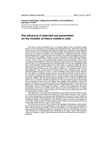 Inżynieria i Ochrona Środowiska 2012, t. 15, nr 1, s. 81-92 Krzysztof FIJAŁKOWSKI, Małgorzata KACPRZAK, Anna GROBELAK* Agnieszka PLACEK Czestochowa University of Technology, Institute of Environmental Engineering Brzeźnicka 60a, 42-200 Częstochowa * e-mail: [email protected] The influence of selected soil parameters on the mobility of heavy metals in soils The activity of zinc-lead industry has a very negative impact on the environment, mainly because of the accumulation of post-mining and metallurgical waste, which in the long term leads to an adverse transformation of natural environment due to migration of dust and metals to soils, surface waters and groundwater. Metals and their compounds present in the soil fractions vary in the degree of mobility. Their bioavailability is regulated by physical, chemical and biological processes and interactions between them. The method of binding heavy metals, and hence their bioavailability, depends on several soil properties, which include: granulometric composition, organic matter content, occurrence and form of cations, pH value, sorption capacity, content of macro and micronutrients, oxidation-reduction potential, activity of microorganisms, bioavailability for plants and animals, resistance of the soil. Mechanical composition of soil is one of the important factors determining the extent of soil contamination with heavy metals and their content in plant tissues. Heavy soils, as compared to light soils, due to large amounts of suspended fraction, have a greater ability to retain metallic elements. On the other hand, light soil does not have such ability of sorption. At a comparable state of heavy metal pollution, it may contain metals in dissolved form, easily available for plants. All soils with high sorption capacity for cations, i.e. land containing a large amount of clay minerals, have the ability to accumulate metallic elements. Increasing the amount of organic matter in the soil, helps to minimize the absorption of heavy metals by plants. Land rich in organic matter actively retains metallic elements. Forms of occurrence of heavy metals in soil significantly affect their mobility. The most mobile elements include the Cd, Zn and Mo, while the least mobile are Cr, Ni and Pb. Soil pH is considered one of the most important factors determining the concentration of metals in the soil solution, their mobility and availability to plants. The increase of hydrogen ion concentration affects the mobilisation intensity of heavy metals. In highly acidic soils, the mobility of metallic elements is much higher than in soils with neutral and alkaline reaction. The potential of oxidation - reduction of soil significantly determines participation in the form of a mobile element, which can enter the biological cycle, in relation to the total element content. Lack of oxygen in the soil causes start-up and increase the mobility of the large part of heavy metals. Each plant needs for growth and development the appropriate amounts of mineral salts, i.e. macronutrients and micronutrients. Plants draw heavy metals from the soil in a similar way as the macronutrients and micronutrients through the root system. The rate of uptake by the roots of metallic elements depends on the chemical form in which they appear in the soil. Insufficient amount of micronutrients in the soil often results in excessive accumulation of several heavy metals in plants. Properly balanced and well chosen level of nutrients in the soil, ensures high yields with a low content of heavy metals. Stress caused by an excess of heavy metals is the beginning of disturbances in the metabolism of plants and can lead to disturbances in the collection, transport and assimilation of macro-and micronutrients. Metallic elements accumulated in the soil inhibit the growth of microorganisms that inhabit it, leading to a distortion of their basic life functions, and especially the processes of decomposition and transformation of organic matter. Microorganism activity in ryzosphere is also a major determinant of growth of the plant and its resistance to pathogens. 82 K. Fijałkowski, M. Kacprzak, A. Grobelak, A. Placek Soil contamination processes are constant, but compared to other elements of the environment, they are the most capable to defend themselves, acting as a buffer for pollutants. Resistance to contamination, regarding the pressure of degrading factors, land owes to its physical, chemical and biological properties. Resistance of soil is biochemical, because it results from the ability of plants to absorb and neutralize chemically active pollutants. Keywords: heavy metal, soil contamination, bioavailability heavy metals, granulometric composition, occurrence and form of cations, pH value, sorption capacity, macronutrients, micronutrients, oxidation-reduction potential, activity of microorganisms, resistance of the soil The activity of zinc-lead industry has a very negative impact on the environment, mainly because of the accumulation of post-mining and metallurgical waste, which in the long term leads to an adverse transformation of natural environment due to migration of dust and metals to soils, surface waters and groundwater. Such actions have led to the contamination of large areas by heavy metals, in particular by cadmium, zinc and lead as well as dangerous metalloids. The elements introduced into the environment are subject to biological accumulation. Disruption of the existing balance in the soil usually leads to a reduction in its productivity and the quality of agricultural products [1-4]. A characteristic feature of soil contamination by heavy metals is their slow pace of change, especially of those in the cationic form. In general, these elements are rather insusceptible to leaching, and they stay in soil for a long time [5-9]. Metals and their compounds present in the soil fractions vary in the degree of mobility. Their bioavailability is regulated by physical, chemical and biolo