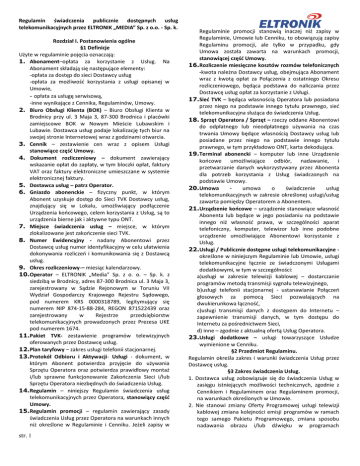 Regulamin świadczenia publicznie dostępnych usług telekomunikacyjnych przez ELTRONIK „MEDIA” Sp. z o.o. - Sp. k. Rozdział I. Postanowienia ogólne §1 Definicje Użyte w regulaminie pojęcia oznaczają: 1. Abonament–opłata za korzystanie z Usług. Na Abonament składają się następujące elementy: -opłata za dostęp do sieci Dostawcy usług -opłata za możliwość korzystania z usługi opisanej w Umowie, - opłata za usługę serwisową, -inne wynikające z Cennika, Regulaminów, Umowy. 2. Biuro Obsługi Klienta (BOK) – Biuro Obsługi Klienta w Brodnicy przy ul. 3 Maja 3, 87-300 Brodnica i placówki zamiejscowe BOK w Nowym Mieście Lubawskim i Lubawie. Dostawca usług podaje lokalizację tych biur na swojej stronie Internetowej wraz z godzinami otwarcia. 3. Cennik – zestawienie cen wraz z opisem Usługi stanowiące część Umowy. 4. Dokument rozliczeniowy – dokument zawierający wskazanie opłat do zapłaty, w tym bloczki opłat, faktury VAT oraz faktury elektroniczne umieszczane w systemie elektronicznej faktury. 5. Dostawca usług – patrz Operator. 6. Gniazdo abonenckie – fizyczny punkt, w którym Abonent uzyskuje dostęp do Sieci TVK Dostawcy usług, znajdujący się w Lokalu, umożliwiający podłączenie Urządzenia końcowego, celem korzystania z Usług, są to urządzenia bierne jak i aktywne typu ONT. 7. Miejsce świadczenia usług – miejsce, w którym zlokalizowane jest zakończenie sieci TVK. 8. Numer Ewidencyjny - nadany Abonentowi przez Dostawcę usług numer identyfikacyjny w celu ułatwienia dokonywania rozliczeń i komunikowania się z Dostawcą usług. 9. Okres rozliczeniowy-– miesiąc kalendarzowy. 10.Operator – ELTRONIK „Media” Sp. z o. o. – Sp. k. z siedzibą w Brodnicy, adres 87-300 Brodnica ul. 3 Maja 3, zarejestrowany w Sądzie Rejonowym w Toruniu VII Wydział Gospodarczy Krajowego Rejestru Sądowego, pod numerem KRS 0000318789, legitymujący się numerem NIP 874-15-88-284, REGON 871522439 oraz zarejestrowany w Rejestrze przedsiębiorstw telekomunikacyjnych prowadzonych przez Prezesa UKE pod numerem 1674. 11.Pakiet TVK- zestawienie programów telewizyjnych oferowanych przez Dostawcę usług. 12.Plan taryfowy – zakres usługi telefonii stacjonarnej. 13.Protokół Odbioru i Aktywacji- Usługi - dokument, w którym Abonent potwierdza przyjęcie do używania Sprzętu Operatora oraz potwierdza prawidłowy montaż i/lub sprawne funkcjonowanie Zakończenia Sieci i/lub Sprzętu Operatora niezbędnych do świadczenia Usług. 14.Regulamin – niniejszy Regulamin świadczenia usług telekomunikacyjnych przez Operatora, stanowiący część Umowy. 15.Regulamin promocji – regulamin zawierający zasady świadczenia Usług przez Operatora na warunkach innych niż określone w Regulaminie i Cenniku. Jeżeli zapisy w str. 1 Regulaminie promocji stanowią inaczej niż zapisy w Regulaminie, Umowie lub Cenniku, to obowiązują zapisy Regulaminu promocji, ale tylko w przypadku, gdy Umowa została zawarta na warunkach promocji, stanowiącej część Umowy. 16.Rozliczenie miesięczne kosztów rozmów telefonicznych -kwota należna Dostawcy usług, obejmująca Abonament wraz z kwotą opłat za Połączenia z ostatniego Okresu rozliczeniowego, będąca podstawa do naliczania przez Dostawcę usług opłat za korzystanie z Usługi. 17.Sieć TVK – będąca własnością Operatora lub posiadana przez niego na podstawie innego tytułu prawnego, sieć telekomunikacyjna służąca do świadczenia Usług. 18. Sprzęt Operatora / Sprzęt – rzeczy oddane Abonentowi do odpłatnego lub nieodpłatnego używania na czas trwania Umowy będące własnością Dostawcy usług lub posiadane przez niego na podstawie innego tytułu prawnego, w tym przykładowo ONT, karta dekodująca. 19.Terminal abonencki – komputer lub inne Urządzenie końcowe umożliwiające odbiór, nadawanie, i przetwarzanie danych wykorzystywany przez Abonenta dla potrzeb korzystania z Usług świadczonych na podstawie Umowy. 20.Umowa umowa o świadczenie usług telekomunikacyjnych w zakresie określonej usługi/usług zawarta pomiędzy Operatorem a Abonentem. 21.Urządzenie końcowe – urządzenie stanowiące własność Abonenta lub będące w jego posiadaniu na podstawie innego niż własność prawa, w szczególności aparat telefoniczny, komputer, telewizor lub inne podobne urządzenie umożliwiające Abonentowi korzystanie z Usług. 22.Usługi / Publicznie dostępne usługi telekomunikacyjne określone w niniejszym Regulaminie lub Umowie, usługi telekomunikacyjne łącznie ze świadczonymi Usługami dodatkowymi, w tym w szczególności: a)usługi w zakresie telewizji kablowej – dostarczanie programów metodą transmisji sygnału telewizyjnego, b)usługi telefonii stacjonarnej - ustanawianie Połączeń głosowych za pomocą Sieci pozwalających na dwukierunkowa łączność, c)usługi transmisji danych z dostępem do Internetu – zapewnienie transmisji danych, w tym dostępu do Internetu za pośrednictwem Sieci, d) inne – zgodnie z aktualną ofertą Usług Operatora. 23.Usługi dodatkowe – usługi towarzyszące Usłudze wymienione w Cenniku. §2 Przedmiot Regulaminu. Regulamin określa zakres i warunki świadczenia Usług przez Dostawcę usług. §3 Zakres świadczenia Usług. 1. Dostawca usług zobowiązuje się do świadczenia Usług w zasięgu istniejących możliwości technicznych, zgodnie z Cennikiem i Regulaminem oraz Regulaminem promocji, na warunkach określonych w Umowie. 2. Nie stanowi zmiany Oferty Programowej usługi telewizji kablowej zmiana kolejności emisji programów w ramach tego samego Pakietu Programowego, zmiana sposobu nadawania obrazu i/lub dźwięku w programach telewizyjnych. Dostawca usług może udostępnić Abonentowi bez dodatkowych opłat dodatkowe programy w ramach Oferty Programowej, w szczególności w okresach testowych lub promocyjnych. Udostępnienie, jak i wycofanie takiego programu nie wymaga zmiany Umowy. Rozdział II. Zawieranie Umowy. 