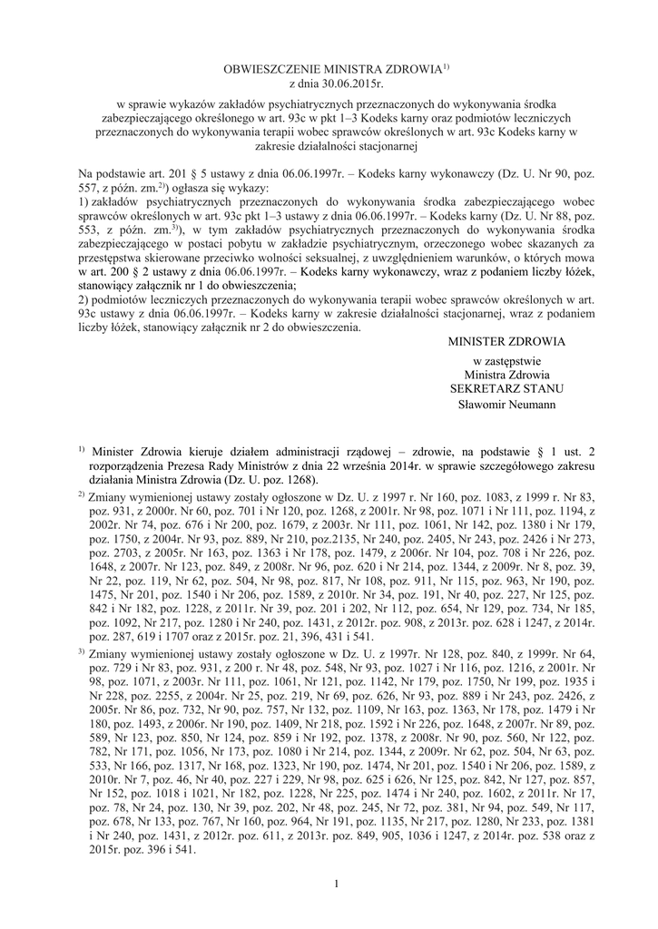 OBWIESZCZENIE MINISTRA ZDROWIA1) z dnia 30.06.2015r. w