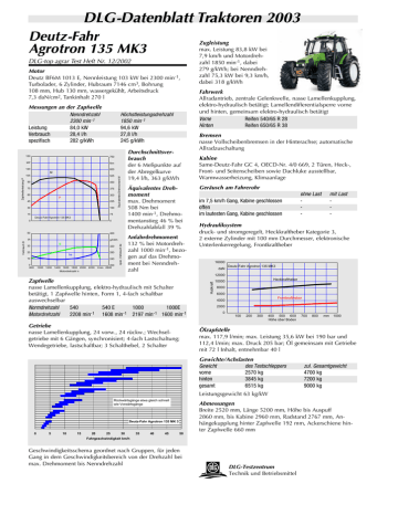 DLG-Datenblatt Traktoren 2003 Deutz-Fahr Agrotron 135 MK3 DLG-top agrar Test Heft Nr. 12/2002 Motor Deutz BF6M 1013 E, Nennleistung 103 kW bei 2300 min -1, Turbolader, 6 Zylinder, Hubraum 7146 cm3, Bohrung 108 mm, Hub 130 mm, wassergekühlt, Arbeitsdruck 7,3 daN/cm2, Tankinhalt 270 l Messungen an der Zapfwelle Nenndrehzahl 2300 min -1 Leistung 84,0 kW Verbrauch 28,4 l/h spezifisch 282 g/kWh Höchstleistungsdrehzahl 1850 min -1 94,6 kW 27,8 l/h 245 g/kWh 150 750 kW Nm 120 Durchschnittsverbrauch der 6 Meßpunkte auf der Abregelkurve 19,4 l/h, 363 g/kWh 600 525 90 450 75 375 60 300 P 45 225 30 150 15 Äquivalentes Drehmoment M Äquivalentes Drehmoment max. Drehmoment 508 Nm bei 1400 min-1, Drehmomentanstieg 46 % bei Drehzahlabfall 39 % 75 Deutz-Fahr Agrotron 135 MK3 0 0 50 400 g/kWh B 320 20 280 be 10 240 0 800 200 1000 1200 1400 1600 1800 2000 2200 1/min 2600 Motordrehzahl n spez. Verbrauch be Verbrauch B l/h 30 Anfahrdrehmoment 132 % bei Motordrehzahl 1000 min-1, bezogen auf das Drehmoment bei Nenndrehzahl Fahrwerk Allradantrieb, zentrale Gelenkwelle, nasse Lamellenkupplung, elektro-hydraulisch betätigt; Lamellendifferentialsperre vorne und hinten, gemeinsam elektro-hydraulisch betätigt Vorne Reifen 540/65 R 28 Hinten Reifen 650/65 R 38 Bremsen nasse Vollscheibenbremsen in der Hinterachse; automatische Allradzuschaltung Kabine Same-Deutz-Fahr GC 4, OECD-Nr. 4/0 669, 2 Türen, Heck-, Front- und Seitenscheiben sowie Dachluke ausstellbar, Warmwasserheizung, Klimaanlage Geräusch am Fahrerohr im 7,5 km/h Gang, Kabine geschlossen offen im lautesten Gang, Kabine geschlossen ohne Last - mit Last - Hydrauliksystem druck- und stromgeregelt, Heckkraftheber Kategorie 3, 2 externe Zylinder mit 100 mm Durchmesser, elektronische Unterlenkerregelung, Frontkraftheber 16000 daN Deutz-Fahr Agrotron 135 MK3 12000 Zapfwelle nasse Lamellenkupplung, elektro-hydraulisch mit Schalter betätigt, 1 Zapfwelle hinten, Form 1, 4-fach schaltbar auswechselbar Normdrehzahl 540 540 E 1000 1000E Motordrehzahl 2208 min-1 1608 min-1 2197 min-1 1600 min-1 Getriebe nasse Lamellenkupplung, 24 vorw., 24 rückw.; Wechselgetriebe mit 6 Gängen, synchronisiert; 4-fach Lastschaltung; Wendegetriebe, lastschaltbar; 3 Schalthebel, 2 Schalter Hubkraft Zapfwellenleistung P M 105 Zugleistung max. Leistung 83,8 kW bei 7,9 km/h und Motordrehzahl 1850 min-1, dabei 279 g/kWh; bei Nenndrehzahl 75,3 kW bei 9,3 km/h, dabei 318 g/kWh Heckkraftheber 10000 8000 6000 Frontkraftheber 4000 2000 0 100 200 300 400 500 600 Höhe über Boden 700 800 mm 1000 Ölzapfstelle max. 117,9 l/min; max. Leistung 35,6 kW bei 190 bar und 112,4 l/min; max. Druck 205 bar; Öl gemeinsam mit Getriebe mit 72 l Inhalt, entnehmbar 40 l Gewichte/Achslasten Gewicht des Testschleppers vorne 2570 kg hinten 3845 kg gesamt 6515 kg zul. Gesamtgewicht 4700 kg 7200 kg 9000 kg Leistungsgewicht 63 kg/kW Rückwärtsgänge etwa gleich schnell wie Vorwärtsgänge Deutz-Fahr Agrotron 135 MK 3 0 5 10 15 20 25 30 35 40 45 50 Abmessungen Breite 2520 mm, Länge 5200 mm, Höhe bis Auspuff 2860 mm, bis Kabine 2960 mm, Radstand 2767 mm, Anhängekupplung hinter Zapfwelle 192 mm, Ackerschiene hinter Zapfwelle 660 mm Fahrgeschwindigkeit km/h Geschwindigkeitsschema geordnet nach Gruppen, für jeden Gang in dem Geschwindigkeitsbereich von der Drehzahl bei max. Drehmoment bis Nenndrehzahl DLG-Testzentrum Technik und Betriebsmittel