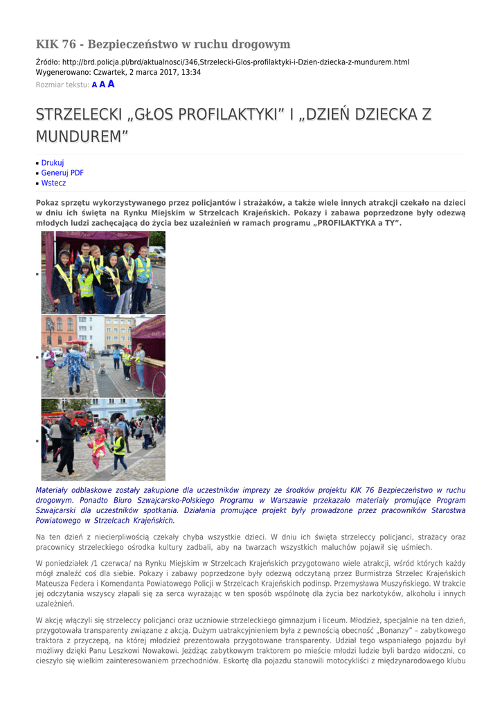 KIK 76 - Bezpieczeństwo w ruchu drogowym Źródło: http://brd.policja.pl/brd/aktualnosci/346,Strzelecki-Glos-profilaktyki-i-Dzien-dziecka-z-mundurem.html Wygenerowano: Czwartek, 2 marca 2017, 13:34 Rozmiar tekstu: A A A STRZELECKI „GŁOS PROFILAKTYKI” I „DZIEŃ DZIECKA Z MUNDUREM” ■ ■ ■ Drukuj Generuj PDF Wstecz Pokaz sprzętu wykorzystywanego przez policjantów i strażaków, a także wiele innych atrakcji czekało na dzieci w dniu ich święta na Rynku Miejskim w Strzelcach Krajeńskich. Pokazy i zabawa poprzedzone były odezwą młodych ludzi zachęcającą do życia bez uzależnień w ramach programu „PROFILAKTYKA a TY”. ■ ■ ■ Materiały odblaskowe zostały zakupione dla uczestników imprezy ze środków projektu KIK 76 Bezpieczeństwo w ruchu drogowym. Ponadto Biuro Szwajcarsko-Polskiego Programu w Warszawie przekazało materiały promujące Program Szwajcarski dla uczestników spotkania. Działania promujące projekt były prowadzone przez pracowników Starostwa Powiatowego w Strzelcach Krajeńskich. Na ten dzień z niecierpliwością czekały chyba wszystkie dzieci. W dniu ich święta strzeleccy policjanci, strażacy oraz pracownicy strzeleckiego ośrodka kultury zadbali, aby na twarzach wszystkich maluchów pojawił się uśmiech. W poniedziałek /1 czerwca/ na Rynku Miejskim w Strzelcach Krajeńskich przygotowano wiele atrakcji, wśród których każdy mógł znaleźć coś dla siebie. Pokazy i zabawy poprzedzone były odezwą odczytaną przez Burmistrza Strzelec Krajeńskich Mateusza Federa i Komendanta Powiatowego Policji w Strzelcach Krajeńskich podinsp. Przemysława Muszyńskiego. W trakcie jej odczytania wszyscy złapali się za serca wyrażając w ten sposób wspólnotę dla życia bez narkotyków, alkoholu i innych uzależnień. W akcję włączyli się strzeleccy policjanci oraz uczniowie strzeleckiego gimnazjum i liceum. Młodzież, specjalnie na ten dzień, przygotowała transparenty związane z akcją. Dużym uatrakcyjnieniem była z pewnością obecność „Bonanzy” – zabytkowego traktora z przyczepą, na której młodzież prezentowała przygotowane transparenty. Udział tego wspaniałego pojazdu był możliwy dzięki Panu Leszkowi Nowakowi. Jeżdżąc zabytkowym traktorem po mieście młodzi ludzie byli bardzo widoczni, co cieszyło się wielkim zainteresowaniem przechodniów. Eskortę dla pojazdu stanowili motocykliści z międzynarodowego klubu motocyklowego stróżów prawa „Blue Knights Poland IX”, którzy na swoich wspaniałych maszynach pilotowali przejazdy. Jedynym minusem była pogoda. Jednak pomimo deszczu z każdą minutą strzelecki rynek zapełniał się i każdy chciał być pasażerem „Bonanzy” i wyrazić w ten sposób swoją aprobatę dla tak szczytnej inicjatywy. Z kolei najmłodszym najbardziej do gustu przypadł pokaz umiejętności Berty - policyjnego psa patrolowo-tropiącego. Dużym zainteresowaniem cieszyły się również pozostałe atrakcje przygotowane przez policjantów takie jak: łódź motorowa, radiowozy, stanowisko policyjne, czy też pokaz przygotowany przez strzeleckich strażaków. O różnego rodzaju gry i zabawy zadbali pracownicy Strzeleckiego Ośrodka Kultury i Zbigniew Roszczyk z Radia Zachód. Ocena tekstu: Tagi: Ocena: 0/5 (0) Poleć artykuł: powiat strzelecko-drezdenecki Kategorie: