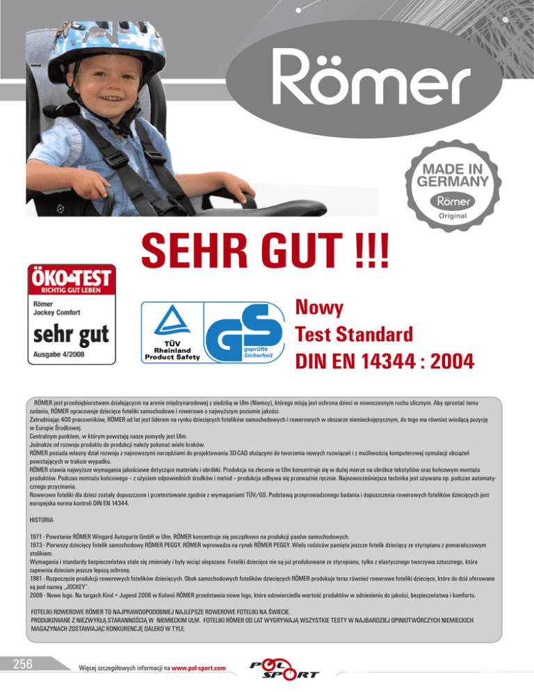 SEHR GUT !!! Nowy Test Standard DIN EN 14344 : 2004 RÖMER jest przedsiębiorstwem działającycm na arenie międzynarodowej z siedzibą w Ulm (Niemcy), którego misją jest ochrona dzieci w nowoczesnym ruchu ulicznym. Aby sprostać temu zadaniu, RÖMER opracowuje dziecięce foteliki samochodowe i rowerowe o najwyższym poziomie jakości. Zatrudniając 400 pracowników, RÖMER od lat jest liderem na rynku dziecięcych fotelików samochodowych i rowerowych w obszarze niemieckojęzycznym, do tego ma również wiodącą pozycję w Europie Środkowej. Centralnym punktem, w którym powstają nasze pomysły jest Ulm. Jednakże od rozwoju produktu do produkcji należy pokonać wiele kroków. RÖMER posiada własny dział rozwoju z najnowszymi narzędziami do projektowania 3D-CAD służącymi do tworzenia nowych rozwiązań i z możliwością komputerowej symulacji obciążeń powstających w trakcie wypadku. RÖMER stawia najwyższe wymagania jakościowe dotyczące materiału i obróbki. Produkcja na zlecenie w Ulm koncentruje się w dużej mierze na obróbce tekstyliów oraz końcowym montażu produktów. Podczas montażu końcowego – z użyciem odpowiednich środków i metod – produkcja odbywa się przeważnie ręcznie. Najnowocześniejsza technika jest używana np. podczas automatycznego przycinania. Rowerowe foteliki dla dzieci zostały dopuszczone i przetestowane zgodnie z wymaganiami TÜV/GS. Podstawą przeprowadzonego badania i dopuszczenia rowerowych fotelików dziecięcych jest europejska norma kontroli DIN EN 14344. HISTORIA 1971 - Powstanie RÖMER Wingard Autogurte GmbH w Ulm. RÖMER koncentruje się początkowo na produkcji pasów samochodowych. 1973 - Pierwszy dziecięcy fotelik samochodowy RÖMER PEGGY. RÖMER wprowadza na rynek RÖMER PEGGY. Wielu rodziców pamięta jeszcze fotelik dziecięcy ze styropianu z pomarańczowym stolikiem. Wymagania i standardy bezpieczeństwa stale się zmieniały i były wciąż ulepszane. Foteliki dziecięce nie są już produkowane ze styropianu, tylko z elastycznego tworzywa sztucznego, które zapewnia dzieciom jeszcze lepszą ochronę. 1981 - Rozpoczęcie produkcji rowerowych fotelików dziecięcych. Obok samochodowych fotelików dziecięcych RÖMER produkuje teraz również rowerowe foteliki dziecięce, które do dziś oferowane są pod nazwą „JOCKEY“. 2006 - Nowe logo. Na targach Kind + Jugend 2006 w Kolonii RÖMER przedstawia nowe logo, które odzwierciedla wartość produktów w odniesieniu do jakości, bezpieczeństwa i komfortu. FOTELIKI ROWEROWE RÖMER TO NAJPRAWDOPODOBNIEJ NAJLEPSZE ROWEROWE FOTELIKI NA ŚWIECIE. PRODUKOWANE Z NIEZWYKŁĄ STARANNOŚCIĄ W NIEMIECKIM ULM. FOTELIKI RÖMER OD LAT WYGRYWAJĄ WSZYSTKIE TESTY W NAJBARDZIEJ OPINIOTWÓRCZYCH NIEMIECKICH MAGAZYNACH ZOSTAWIAJĄC KONKURENCJĘ DALEKO W TYLE. 256 Więcej szczegółowych informacji na www.pol-sport.com bezpieczne jak nigdy dotąd foteliki foteliki Regulacja oparcia fotelika w 9 płaszczyznach, ochrona barków za pomocą miękkiej osłony pasów regulowana wysokość oparcia fotelika - patent RÖMER Nogi dziecka są chronione odpowiednim zabezpieczeniem nóg i regulowanymi podnóżkami. JEŚLI KOCHASZ SWOJE DZIECKO WYBÓR JEST PROSTY...RÖMER. Aby mali pasażerowie mogli być przewożeni bezpiecznie na rowerze, RÖMER opracował dla fotelików dziecięcych JOCKEY nową, dużą osłonę na szprychy. Fotelik został tak opracowany, że spełnia europejską normą kontroli DIN EN 14344 badania TÜV/GS. Osłona na szprychy mocowana bezpośrednio do fotelika dziecięcego zapobiega dostaniu się stóp dziecka w szprychy i w ten sposób znacznie minimalizuje ryzyko odniesienia obrażeń. Oparcie z możliwością ustawienia w położenie siedzenia i spoczynkową przy pomocy uchwytu. Dzięki temu dzieci mogą się wygodnie oprzeć i czerpać przyjemność z jazdy. FOTELIKI ROMER MONTUJEMY W NASTĘPUJĄCY SPOSÓB: - zgodnie z kierunkiem jazdy - do rury siodełka z tyłu - za kierowcą - niezależnie od bagażnika - przy pomocy klucza imbusowego (rozmiar 5) i klucza widełkowego (rozmiar 13) PORADNIK DLA PODRÓŻUJĄCYCH Z DZIECKIEM - NA CO NALEŻY ZWRÓCIĆ UWAGĘ ? Przejażdżka rowerem staje się przyjemnością, jeśli udział w niej bierze cała rodzina, również najmłodsi. Również przy wyborze fotelika dziecięcego na rower warto jest kierować się bezpieczeństwem dziecka. Zwracamy uwagę, aby fotelik (w obszarze siedzenia) posiadał wybrzuszenia, które w połączeniu z szelkami lub pasem biodrowym zapewniają, że dziecko na skutek gwałtownego hamowania lub zderzenia pozostanie w foteliku. aby nogi dziecka były chronione odpowiednim zabezpieczeniem nóg i regulowanymi podnóżkami. Należy wówczas zapewnić odpowiednią osłonę przed wciągnięciem w szprychy. Od lipca 2005 obowiązuje norma DIN EN 14344, która przewiduje osłonę na szprychy o dużej powierzchni. aby uchwyty na rączki dziecka były zintegrowane w foteliku. Nieosłonięte sprężyny siodełka muszą być zasłonięte pokrywą. aby mocowanie (podpórka), które utrzymuje fotelik był mocno zamontowany w taki sposób, by nie mógł wyskoczyć podczas jazdy po wyboistych terenach. aby fotelik był anatomicznie wyprofilowany, stabilny oraz wyposażony w pasy odpowiednie do danego wieku. czy fotelik był przetestowany oraz czy spełnia normę DIN EN 14344. Jeśli chodzi o obsługę, należy zwrócić uwagę: aby fotelik można było przekładać z roweru na rowerek, wykonując jedynie kilka czynności. aby możliwe było łatwe zmienienie regulacji taśmy nożnej i podnóżków. RÖMER JOCKEY jest odpowiedni do rowerów turystycznych i sportowych 26’’ i 28’’ o średnicy rury wynoszącej od 28 do 40 mm i szerokości bagażnika wynoszącej do 150 mm. 257 dla tych, których kochasz najbardziej foteliki Jockey Relax - Laura Model: LAURA Opis: do 22kg Duża osłona na szprychy Mocowanie niezależne od bagażnika Stabilny pałąk sprężynowy Regulowane oparcie Regulowane podnóżki Komfo