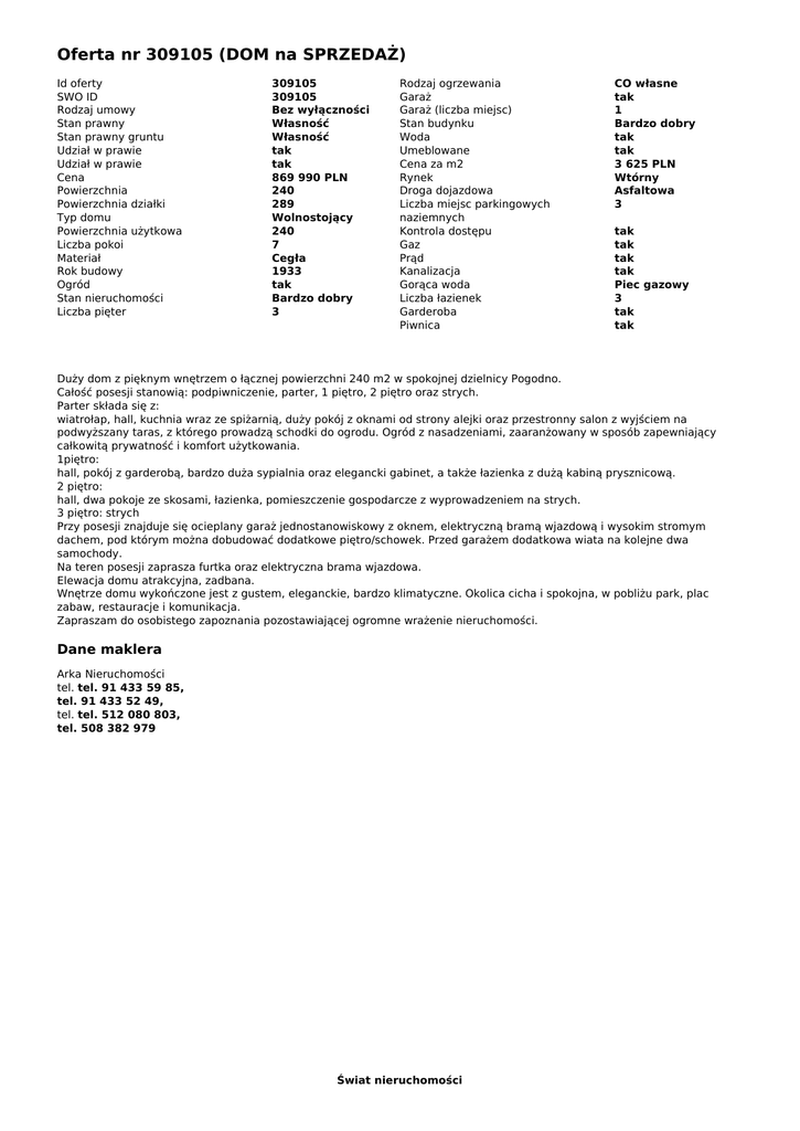 Oferta nr 309105 (DOM na SPRZEDAŻ) Id oferty SWO ID Rodzaj umowy Stan prawny Stan prawny gruntu Udział w prawie Udział w prawie Cena Powierzchnia Powierzchnia działki Typ domu Powierzchnia użytkowa Liczba pokoi Materiał Rok budowy Ogród Stan nieruchomości Liczba pięter 309105 309105 Bez wyłączności Własność Własność tak tak 869 990 PLN 240 289 Wolnostojący 240 7 Cegła 1933 tak Bardzo dobry 3 Rodzaj ogrzewania Garaż Garaż (liczba miejsc) Stan budynku Woda Umeblowane Cena za m2 Rynek Droga dojazdowa Liczba miejsc parkingowych naziemnych Kontrola dostępu Gaz Prąd Kanalizacja Gorąca woda Liczba łazienek Garderoba Piwnica CO własne tak 1 Bardzo dobry tak tak 3 625 PLN Wtórny Asfaltowa 3 tak tak tak tak Piec gazowy 3 tak tak Duży dom z pięknym wnętrzem o łącznej powierzchni 240 m2 w spokojnej dzielnicy Pogodno. Całość posesji stanowią: podpiwniczenie, parter, 1 piętro, 2 piętro oraz strych. Parter składa się z: wiatrołap, hall, kuchnia wraz ze spiżarnią, duży pokój z oknami od strony alejki oraz przestronny salon z wyjściem na podwyższany taras, z którego prowadzą schodki do ogrodu. Ogród z nasadzeniami, zaaranżowany w sposób zapewniający całkowitą prywatność i komfort użytkowania. 1piętro: hall, pokój z garderobą, bardzo duża sypialnia oraz elegancki gabinet, a także łazienka z dużą kabiną prysznicową. 2 piętro: hall, dwa pokoje ze skosami, łazienka, pomieszczenie gospodarcze z wyprowadzeniem na strych. 3 piętro: strych Przy posesji znajduje się ocieplany garaż jednostanowiskowy z oknem, elektryczną bramą wjazdową i wysokim stromym dachem, pod którym można dobudować dodatkowe piętro/schowek. Przed garażem dodatkowa wiata na kolejne dwa samochody. Na teren posesji zaprasza furtka oraz elektryczna brama wjazdowa. Elewacja domu atrakcyjna, zadbana. Wnętrze domu wykończone jest z gustem, eleganckie, bardzo klimatyczne. Okolica cicha i spokojna, w pobliżu park, plac zabaw, restauracje i komunikacja. Zapraszam do osobistego zapoznania pozostawiającej ogromne wrażenie nieruchomości. Dane maklera Arka Nieruchomości tel. tel. 91 433 59 85, tel. 91 433 52 49, tel. tel. 512 080 803, tel. 508 382 979 Świat nieruchomości Powered by TCPDF (www.tcpdf.org)