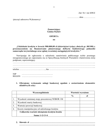 1 Zał. Nr 1 do SIWZ ……………. dnia ……………. /pieczęć adresowa Wykonawcy/ Zamawiający Gmina Pęcław OFERTA na „Udzielenie kredytu w kwocie 900.000,00 zł (dziewięćset tysięcy złotych gr. 00/100) z przeznaczeniem na finansowanie planowanego deficytu budżetowego jednostki samorządu terytorialnego oraz spłatę wcześniej zaciągniętych kredytów.” Nawiązując do ogłoszenia o udzielenie zamówienia publicznego trybie przetargu nieograniczonego po zapoznaniu się ze Specyfikacją Istotnych Warunków Zamówienia niżej podpisani, reprezentujący …………………………………………………………………………………………………... …………………………………………………………………………………………………... …………………………………………………………………………………………………... telefon ………………………..……., fax ………………………..…………. NIP ……………………………………. REGON …………………………………… 1. Oferujemy wykonanie usługi bankowej zgodnie z zestawieniem elementów składowych ceny: Wyszczególnienie Wartości wyrażone % 1. Wysokość zmiennej stopy procentowej WIBOR 1M 2. Wysokość marży bankowej 3. Wartości prowizji bankowej 4. Koszty manipulacyjne od udzielonego kredytu Całkowita wartość obciążenia kredytu brutto zł Suma 1+2+3+4 2. Słownie zł ……………………………………………………………………………… …………………………………………………………………………………………... 2 Oświadczamy, że: 1. Uzyskaliśmy informacje konieczne do przygotowania i złożenia ofert. 2. Specyfikacje Istotnych Warunków Zamówienia i wszystkie inne otrzymane od Zamawiającego informacje przyjmujemy bez zastrzeżeń i oferujemy gotowość, zrealizowania przedmiotu zamówienia, zgodnie z warunkami określonymi w SIWZ. 3. Spełniamy wymogi określone w art. 22 ust.1 ustawy z dnia 29 stycznia 2004r. – Prawo zamówień publicznych (tekst jednolity z 2010 r. Dz. U. Nr 113, poz. 759 z późn. zm.) oraz spełniamy pozostałe warunki udziału w niniejszym postępowaniu określone w Rozdziale VIII Specyfikacje Istotnych Warunków Zamówienia. 4. Zobowiązujemy się do realizacji zamówcie w terminie I transza – od dnia podpisania umowy do dnia 15 lipca 2012 r. – kwota 250.000,00 zł II transza – od dnia 16 lipca 2012 r. do 15 października 2012 r. – kwota 400.000,00 zł III transza - od dnia 16 października 2012 r. do 20 grudnia 2012 r. – kwota 250.000,00 zł 5. Oferowana przez nas cena zawiera wszystkie koszty związane z wykonaniem usługi. 6. Uważamy się za związanych ofertą przez okres 30 dni od daty upływu terminu składania ofert. 7. W razie wybrania naszej oferty, zobowiązujemy się do podpisania umowy na warunkach określonych w SIWZ z uwzględnieniem zapisów zawartych we wzorze umowy, w miejscu i terminie wskazanym przez Zamawiającego. 8. Upoważniamy Zamawiającego bądź upoważnionych przez niego przedstawicieli do prowadzenia wszelkich badań mających na celu sprawdzenie dokumentów przedłożonych informacji oraz wyjaśnienia formalnych i technicznych aspektów naszej oferty. Do tych celów upoważniamy każdą osobę publiczną, bank lub przedsiębiorstwo wymienione w naszej ofercie do dostarczenia stosownej informacji uznanej przez Zamawiającego za konieczną i wymaganą w celu sprawdzenia dokumentów oświadczeń zawartych w naszej ofercie. Pieczęcie i podpisy osób uprawnionych do składania oświadczeń woli w imieniu Wykonawcy ………………….dnia…………………. Na niniejszą ofertę składa się …………… kolejno ponumerowanych stron.