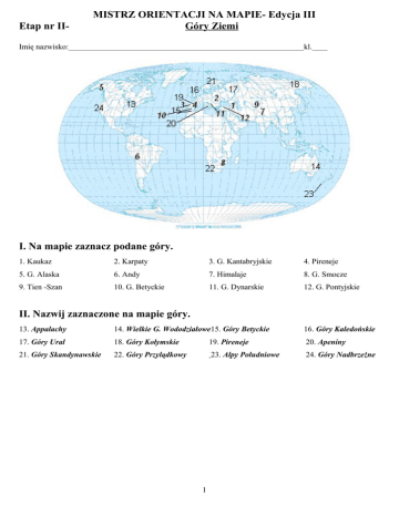 Etap nr II- MISTRZ ORIENTACJI NA MAPIE- Edycja III Góry Ziemi Imię nazwisko: kl. I. Na mapie zaznacz podane góry. 1. Kaukaz 2. Karpaty 3. G. Kantabryjskie 4. Pireneje 5. G. Alaska 6. Andy 7. Himalaje 8. G. Smocze 9. Tien -Szan 10. G. Betyckie 11. G. Dynarskie 12. G. Pontyjskie II. Nazwij zaznaczone na mapie góry. 13. Appalachy 14. Wielkie G. Wododziałowe15. Góry Betyckie 16. Góry Kaledońskie 17. Góry Ural 18. Góry Kołymskie 19. Pireneje 20. Apeniny 21. Góry Skandynawskie 22. Góry Przylądkowy 23. Alpy Południowe 24. Góry Nadbrzeżne 1 Bonus- Unia Europejska Wymień kraje członkowskie Unii Europejskiej, podaj ich stolicę oraz zaznacz te państwa na mapie. 1.Austria- Wiedeń 2.Belgia- Bruksela 4.Czechy- Praga 5.Dania- Kopenhaga 6.Estonia- Tallin 7.Finlandia- Helsinki 8.Francja- Paryż 9.Grecja- Ateny 10.Hiszpania- Madryt 14.Malta- Valletta 15.Holandia- Amsterdam 17.Polska- Warszawa 18.Portugalia Lizbona19.Włochy- Rzym 20.Słowacja- Bratysława 11.Irlandia- Dublin 12.Litwa- Wilno 16.Niemcy- Berlin 3.Cypr- Nikozja 13.Łotwa- Ryga 21.Słowenia- Lublana22.Szwecja- Sztokholm23.Węgry- Budapeszt 24.Bułgaria- Sofia 25. Rumunia- Bukareszt 26.Wielka Brytania- Londyn 27. Luksemburg- Luksemburg Złoty bonus!!! Podkreśl te państwa, które wstąpiły do Unii Europejskiej wraz z Polską!!! 2