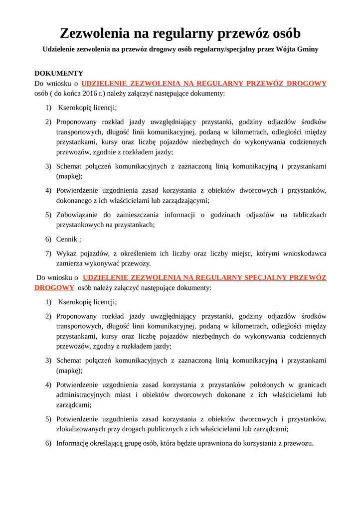 Zezwolenia na regularny przewóz osób Udzielenie zezwolenia na przewóz drogowy osób regularny/specjalny przez Wójta Gminy DOKUMENTY Do wniosku o UDZIELENIE ZEZWOLENIA NA REGULARNY PRZEWÓZ DROGOWY osób ( do końca 2016 r.) należy załączyć następujące dokumenty: 1) Kserokopię licencji; 2) Proponowany rozkład jazdy uwzględniający przystanki, godziny odjazdów środków transportowych, długość linii komunikacyjnej, podaną w kilometrach, odległości między przystankami, kursy oraz liczbę pojazdów niezbędnych do wykonywania codziennych przewozów, zgodnie z rozkładem jazdy; 3) Schemat połączeń komunikacyjnych z zaznaczoną linią komunikacyjną i przystankami (mapkę); 4) Potwierdzenie uzgodnienia zasad korzystania z obiektów dworcowych i przystanków, dokonanego z ich właścicielami lub zarządzającymi; 5) Zobowiązanie do zamieszczania informacji o godzinach odjazdów na tabliczkach przystankowych na przystankach; 6) Cennik ; 7) Wykaz pojazdów, z określeniem ich liczby oraz liczby miejsc, którymi wnioskodawca zamierza wykonywać przewozy. Do wniosku o UDZIELENIE ZEZWOLENIA NA REGULARNY SPECJALNY PRZEWÓZ DROGOWY osób należy załączyć następujące dokumenty: 1) Kserokopię licencji; 2) Proponowany rozkład jazdy uwzględniający przystanki, godziny odjazdów środków transportowych, długość linii komunikacyjnej, podaną w kilometrach, odległości między przystankami, kursy oraz liczbę pojazdów niezbędnych do wykonywania codziennych przewozów, zgodny z rozkładem jazdy; 3) Schemat połączeń komunikacyjnych z zaznaczoną linią komunikacyjną i przystankami (mapkę); 4) Potwierdzenie uzgodnienia zasad korzystania z przystanków położonych w granicach administracyjnych miast i obiektów dworcowych dokonane z ich właścicielami lub zarządcami; 5) Potwierdzenie uzgodnienia zasad korzystania z obiektów dworcowych i przystanków, zlokalizowanych przy drogach publicznych z ich właścicielami lub zarządcami; 6) Informację określającą grupę osób, która będzie uprawniona do korzystania z przewozu. Do wniosku o ZMIANĘ ZEZWOLENIA należy dołączyć: w przypadku zmiany nazwy, siedziby i adresu przedsiębiorcy 1) kserokopię decyzji wydanej przez organ udzielający licencji, stwierdzającej zmianę. 2) aktualny rozkład jazdy w przypadku zmiany przebiegu trasy : 1) Proponowany rozkład jazdy uwzględniający przystanki, godziny odjazdów środków transportowych, długość linii komunikacyjnej, podaną w kilometrach, odległości między przystankami, kursy oraz liczbę pojazdów niezbędnych do wykonywania codziennych przewozów, zgodnie z rozkładem jazdy; 2) Schemat połączeń komunikacyjnych z zaznaczoną linią komunikacyjną i przystankami 3) Potwierdzenie uzgodnienia zasad korzystania z obiektów dworcowych i przystanków dokonanego z ich właścicielami lub zarządzającymi; 4) Cennik; 5) Zobowiązanie do umieszczenia informacji o godzinach odjazdów na tablicach przystankowych na przystankach; 6) Wykaz pojazdów, z określeniem ich liczby oraz liczby miejsc, którymi wnioskodawca zamierza wykonywać przewozy. Wniosek o WYDANIE ODSTĘPSTWA OD WARUNKÓW OKREŚLONYCH W ZEZWOLENIU na wykonywanie regularnych/specjalnych przewozów osób w krajowym transporcie drogowym, wymagane załączniki: 1) Rozkład jazdy uwzględniający przystanki, godziny odjazdów środków transportowych, długość linii komunikacyjnej, podaną w kilometrach, i odległości między przystankami, kursy oraz liczbę pojazdów niezbędnych do wykonywania codziennych przewozów, zgodnie z rozkładem jazdy; 2) Potwierdzenie uzgodnienia zasad korzystania z obiektów dworcowych i przystanków, dokonanego z ich właścicielami lub zarządzającymi. Decyzję w sprawie odstępstwa wydaje się w przypadku wystąpienia niezależnych od przedsiębiorcy okoliczności uniemożliwiających wykonywanie przewozów zgodnie z określonym w zezwoleniu przebiegiem trasy, w szczególności awarii sieci, robót drogowych lub blokad drogowych trwających dłużej niż 14 dni. Decyzja nie może być wydana na okres dłuższy niż okres ważności zezwolenia. Wniosek o wydanie WTÓRNIKA ZEZWOLENIA/WYPISU Z ZEZWOLENIA, wymagane załączniki: 1. Oświadczenie, że odnalezione zezwolenie/wypis z zezwolenia zostanie niezwłocznie zwrócony organowi, który go wydał. Uwaga: W przypadku kserokopii należy okazać oryginał do wglądu bądź kopię poświadczoną notarialnie. OPŁATY Wpłat można dokonać na konto: Urzędu Gminy Gorzyce Bank Spółdzielczy w Gorzycach 55 8469 0009 0000 0257 2000 0003 * Za wydanie zezwolenia na wykonywanie regularnych przewozów osób pobiera się następujące opłaty: Okres ważności zezwolenia Wysokość opłaty dla obszaru gminy dla przewozu regularnego dla przewozu specjalnego do 1 roku 100 zł 50 zł do 2 lat 150 zł 75 zł do 3 lat 200 zł 100 zł do 4 lat 250 zł 125 zł do 5 lat 300 zł 150 zł * za wydanie wypisu z zezwolenia, dla każdego pojazdu zgłoszonego we wniosku o udzielenie zezwolenia pobiera się opłatę w wysokości 1% opłaty jak za wydanie zezwolenia. * za wydanie wypisu z zezwolenia, w przypadku zmiany zezwolenia, pobiera się opłatę w wysokości 5% opłaty jak za wydanie zezwolenia. * za wydanie wypisu z zezwolenia, w przypadku utraty albo zniszczenia wypisu, pobiera się opłatę w wysokości 1% opłaty jak za wydanie zezwolenia. * za wydanie wypisu z zezwolenia, na każdy pojazd niezgłoszony we wniosku o udzielenie zezwolenia, jeżeli zgłoszenie kolejnego pojazdu nie wymaga wydania nowego lub zmiany zezwolenia, pobiera się opłatę w wysokości 11% opłaty jak za wydanie zezwolenia. * za wydanie wtórnika zezwolenia, w przypadku jego utraty na skutek okoliczności niezależnych od przedsiębiorcy, pobiera się opłatę w wysokości 10% opłaty jak za wydanie zezwolenia. * za wydanie wtórnika zezwolenia, w przypadku jego utraty na skutek okoliczności zależnych od przedsiębiorcy, pobiera się opłatę w wysokości 25% o