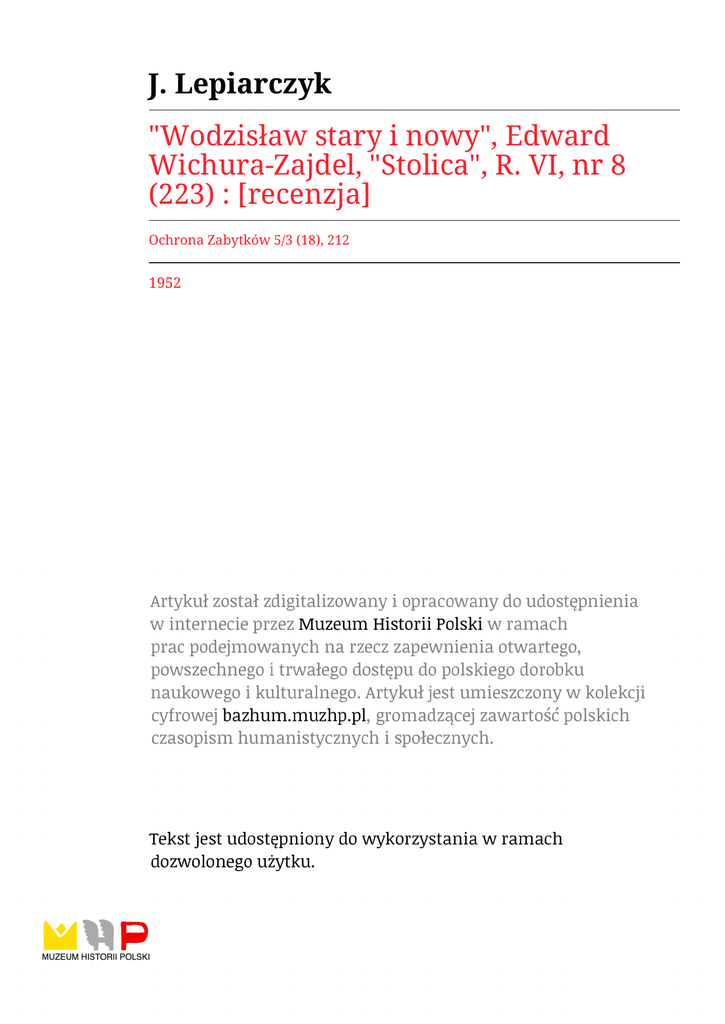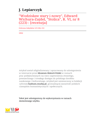 J. Lepiarczyk "Wodzisław stary i nowy", Edward Wichura-Zajdel, "Stolica", R. VI, nr 8 (223) : [recenzja] Ochrona Zabytków 5/3 (18), 212 1952 MIASTO R. II L i p o w c z a n W., Siewierz. Notatka monograficzna (nr 1, str. 22—28, il.). — Za rys historii rozwoju i zabudowy m iastecz ka oraz prac nad planem zagospodarowa nia przestrzennego ze szczególnym uw zglę dnieniem zabytków. T o ł w i ń s k i T., Przebudowa dzielnic śródmiejskich Krakowa nowoczesnego (nr 2, str. 1—14, il.). — Omawia m. in. histo ryczny rozwój układu miasta i sieci ulicz nej oraz sprawę zabezpieczenia i ochrony zabytków w nowym planie urbanistycz nym. S z a r y Ernest, Pyskowice. Notatka mo nograficzna (nr 3, str. 21—29, il.). — Krót ka historia rozwoju miasta oraz om ów ie nie wytycznych i realizacji odbudowy za bytkowego ośrodka staromiejskiego (G. Śląsk). A d a m c z e w s k a H., Prace planistycz ne przy odbudowie Starego Miasta Olszty na (nr 5, str. 12—8, il.). — Omówienie sta nu istniejącego, w ytycznych planu odbudo w y ze szczególnym uwzględnieniem roz wiązania ul. Warszawskiej, placu przed katedrą i terenów zielonych. K w i a t k o w s k i A., Ochrona prawna zabytków (nr 6, str. 29—31, il.). — Oma w ia główne postanowienia ustaw y z dn. 6. II. 1928 oraz ustaw powojennych (defi nicja prawna zabytku, funkcje opieki nad zabytkami, rejestr zabytków itd.). K a n c l e r z F. i K w i a t k o w s k i A., Służba konserwatorska (nr 9, str. 17—21, il.). — Omówienie organizacji polskiej słu żby konserwatorskiej w św ietle obowiązu jących przepisów, specyficznej roli konser watora w naszej rzeczywistości z przyto czeniem charakterystycznych przykładów pracy oraz postawienie postulatów doty czących usprawnienia tej pracy. O 1 g i n Jan, Odbudowa dworu obron nego w Szymbarku (nr 9, str. 35, il.). — Omówienie trudnych prac technicznych, mających na celu zm onolitowanie podłoża skalnego zamku, grożącego runięciem na skutek podmywania skaty przez rzekę Ropę. O f g i n Jan, Rynek w Jarosławiu (nr 10, str. 39—40 il.). — Om ówienie przyczyn geologicznych, powodujących osiadanie i niszczenie zabytkowych domów rynko wych. U społecznione zabytki archi tektury w B i a ł y m s t o k u (nr 10 212 str. 39, il.). — Krótka informacja o odbu dowie zespołu pałacu Branickich z prze znaczeniem na Akadem ię Medyczną. В e n к o Marian Sendom ierz m iasto nieznane (nr 12 str. 18—22 il.). — A utor lokalizuje zapomnianą i nieznaną m iej scowość na obszarze obecnego M ińska M azowieckiego i om awia zasady jego p la nu urbanistycznego STOLICA R. VI Ulica Długa w odbudowie i p r z e b u d o w i e (nr 2 (217), il.). O od budowie zabytkowych pałaców Radzi wiłłów , Raczyńskich, Dückerta, M etryk Ko ronnych, kościoła św. Jacka i kam ienic klasycy stycznych. A rtykuł krótki, b. bo gato ilustrowany. S. B., Ulica Senatorska w odbudow ie (nr 4 (219), il.). — M. in. o odbudowie pa łaców Sołtyka, M ałachowskich, P rym asow skiego, Biblioteki Zamoyskich i t.d., z licz nymi ilustracjami. E. G., Odbudowa Obserwatorium A stro nomicznego (nr 7 (222), il.). — Budynek wzniesiony według planów P. Aignera odbudowano według projektu arch. Jana Dąbrowskiego. R a s s a l s k i Stefan, Św iatow y ośrodek Chopinowski (nr 7 (222), il.). — Odbudowa d. zamku Ostrogskich na Tamce (przero bionego w XVII w. dla Gnińskich przez Tylmana) z przeznaczeniem na siedzibę Towarzystwa im. Chopina (projekt inż. M. Kuzmy). O d b u d o w a z a b y t k ó w Po z n a n i a (nr 7 (222) il.). — Krótka in formacja zilustrowana fotografiam i robót. W i c h u r a - Z a j d e l Edward, Wodzi sław stary i nowy (nr 8 (223), il.). — Krót ka informacja o problemach odbudowy średniowiecznego założenia rynku W odzi sławia w pow. rybnickim na G. Śląsku. A n d r u s z k o Józef, KAM -Konserwacja architektury m onumentalnej (nr 9 (224), il.). — Reportaż fotograficzny z prac konserwatorskich przy dekoracji plastycz nej zabytkowych budow li w W arszawie, wykonywanych przez K.A.M., uzupełniony krótkim zarysem historycznym. К u z m a M ieczysław, Wczoraj i dziś Starego Miasta (nr U (226), il.). — Krótki przegląd prac konserwatorskich na Starym Mieście. Ż a r y n Stanisław, Rekonstrukcja sta rej architektury (nr 11 (226), il.). — Zni-