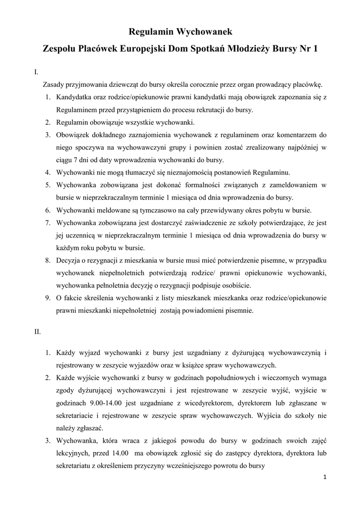 Regulamin Wychowanek Zespołu Placówek Europejski Dom Spotkań Młodzieży Bursy Nr 1 I. Zasady przyjmowania dziewcząt do bursy określa corocznie przez organ prowadzący placówkę. 1. Kandydatka oraz rodzice/opiekunowie prawni kandydatki mają obowiązek zapoznania się z Regulaminem przed przystąpieniem do procesu rekrutacji do bursy. 2. Regulamin obowiązuje wszystkie wychowanki. 3. Obowiązek dokładnego zaznajomienia wychowanek z regulaminem oraz komentarzem do niego spoczywa na wychowawczyni grupy i powinien zostać zrealizowany najpóźniej w ciągu 7 dni od daty wprowadzenia wychowanki do bursy. 4. Wychowanki nie mogą tłumaczyć się nieznajomością postanowień Regulaminu. 5. Wychowanka zobowiązana jest dokonać formalności związanych z zameldowaniem w bursie w nieprzekraczalnym terminie 1 miesiąca od dnia wprowadzenia do bursy. 6. Wychowanki meldowane są tymczasowo na cały przewidywany okres pobytu w bursie. 7. Wychowanka zobowiązana jest dostarczyć zaświadczenie ze szkoły potwierdzające, że jest jej uczennicą w nieprzekraczalnym terminie 1 miesiąca od dnia wprowadzenia do bursy w każdym roku pobytu w bursie. 8. Decyzja o rezygnacji z mieszkania w bursie musi mieć potwierdzenie pisemne, w przypadku wychowanek niepełnoletnich potwierdzają rodzice/ prawni opiekunowie wychowanki, wychowanka pełnoletnia decyzję o rezygnacji podpisuje osobiście. 9. O fakcie skreślenia wychowanki z listy mieszkanek mieszkanka oraz rodzice/opiekunowie prawni mieszkanki niepełnoletniej zostają powiadomieni pisemnie. II. 1. Każdy wyjazd wychowanki z bursy jest uzgadniany z dyżurującą wychowawczynią i rejestrowany w zeszycie wyjazdów oraz w książce spraw wychowawczych. 2. Każde wyjście wychowanki z bursy w godzinach popołudniowych i wieczornych wymaga zgody dyżurującej wychowawczyni i jest rejestrowane w zeszycie wyjść, wyjście w godzinach 9.00-14.00 jest uzgadniane z wicedyrektorem, dyrektorem lub zgłaszane w sekretariacie i rejestrowane w zeszycie spraw wychowawczych. Wyjścia do szkoły nie należy zgłaszać. 3. Wychowanka, która wraca z jakiegoś powodu do bursy w godzinach swoich zajęć lekcyjnych, przed 14.00 ma obowiązek zgłosić się do zastępcy dyrektora, dyrektora lub sekretariatu z określeniem przyczyny wcześniejszego powrotu do bursy 1 4. Każdorazowo wychodząc oraz wchodząc do placówki wychowanka obowiązana jest korzystać z elektronicznej karty dostępu. 5. Najpóźniejszą porą powrotu do bursy jest godzina 21.30. W wyjątkowych sytuacjach związanych z działaniami szkoły, do której uczęszcza wychowanka, po przedstawieniu dokumentu ze szkoły potwierdzającego konieczność późniejszego powrotu i uprzedniej zgodzie wychowawczyni, wychowanka może wrócić później, nie później jednak niż o godzinie 24.00. Każdorazowo w takiej sytuacji wychowanka niepełnoletnia musi przedstawić wychowawczyni pełniącej dyżur w grupie oświadczenie rodziców/opiekunów prawnych potwierdzające przejęcie odpowiedzialności za wychowankę w czasie jej nieobecności w bursie. Oświadczenie ma formę pisemną, może być dostarczone w wersji papierowej, faksem lub przesłane mailem z zadeklarowanego przez rodziców/opiekunów prawnych adresu mailowego. Każdorazowo wychowawczyni potwierdza telefonicznie zgodę rodzica/opiekuna prawnego. 6. W piątki i soboty najpóźniejszą porą powrotu do bursy jest godzina 22.00. W wyjątkowych sytuacjach i po uprzedniej zgodzie wychowawczyni, wychowanka może wrócić później, nie później jednak niż o godzinie 24.00. Wyjątek stanowi powrót ze studniówki. Każdorazowo w takiej sytuacji wychowanka niepełnoletnia musi przedstawić do godziny 20.00 wychowawczyni pełniącej dyżur w grupie oświadczenie rodziców/opiekunów prawnych potwierdzające przejęcie odpowiedzialności za wychowankę w czasie jej nieobecności w bursie, zawierające również informację gdzie wychowanka będzie przebywała (imię, nazwisko, adres, nr telefonu osoby, u której wychowanka będzie przebywała). Każdorazowo wychowawczyni potwierdza telefonicznie zgodę rodzica/opiekuna prawnego. Wychowanka pełnoletnia osobiście przekazuje wychowawczyni pełniącej dyżur informację o tym, gdzie będzie przebywała (imię, nazwisko, adres, nr telefonu osoby, u której wychowanka będzie przebywała) 7. Nocowanie poza bursą od poniedziałku do piątku jest zabronione. W wyjątkowych sytuacjach o zwolnieniu wychowanki niepełnoletniej decydują rodzice/opiekunowie prawni, wychowanki pełnoletnie decydują same i w obu przypadkach na piśmie przedstawiają swoją decyzję, najpóźniej do godziny 20tej w dniu, którego dotyczy nocowanie poza bursą. Każdorazowo wychowawczyni potwierdza telefonicznie zgodę rodzica. 8. Dyrektor może ustalić dni wyjazdowe, w tym weekendy, tym samym zobowiązać wszystkie wychowanki do wyjazdu z bursy. Decyzję taką (poza nadzwyczajnymi przypadkami) dyrektor podejmuje nie później niż tydzień wcześniej i informuje o tym pisemnie – w formie ogłoszenia. 2 III. 1. Wychowanki mają obowiązek uczęszczania do szkoły, nie opuszczania i nie spóźniania się na lekcje oraz osiągania pozytywnych wyników w nauce na miarę swoich możliwości. 2. O nieobecności w szkole i jej przyczynach musi być poinformowana wychowawczyni bursy. Wychowanka pozostająca w domu w dniach zajęć szkolnych powinna niezwłocznie poinformować bursę o przyczynach pobytu w domu i terminie powrotu do bursy. 3. Obowiązkowa cicha nauka w bursie trwa w godzinach 16.30 – 18.30. W tym czasie wszystkie wychowanki obowiązuje cisza, należy ograniczyć odwiedziny w pokojach. 4. W pokoju można uczyć się przy zgaszonym górnym świetle do godziny 24.00 pod warunkiem, że nie przeszkadza to współlokatorkom. Jeżeli koleżanki w pokoju śpią, wychowanka kontynuuje naukę po godzinie 22.00 w uczelni do godziny 24.00. W wyjątkowych sytuacjach, po uzyskaniu zgody wychowawczyni pełniącej dyżur nocny, wycho