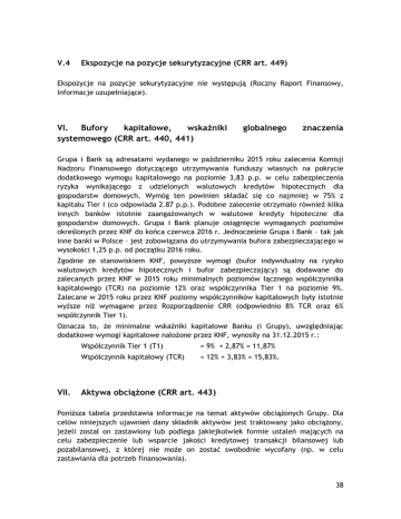 V.4 Ekspozycje na pozycje sekurytyzacyjne (CRR art. 449) Ekspozycje na pozycje sekurytyzacyjne nie występują (Roczny Raport Finansowy, Informacje uzupełniające). VI. Bufory kapitałowe, wskaźniki systemowego (CRR art. 440, 441) globalnego znaczenia Grupa i Bank są adresatami wydanego w październiku 2015 roku zalecenia Komisji Nadzoru Finansowego dotyczącego utrzymywania funduszy własnych na pokrycie dodatkowego wymogu kapitałowego na poziomie 3,83 p.p. w celu zabezpieczenia ryzyka wynikającego z udzielonych walutowych kredytów hipotecznych dla gospodarstw domowych. Wymóg ten powinien składać się co najmniej w 75% z kapitału Tier I (co odpowiada 2.87 p.p.). Podobne zalecenie otrzymało również kilka innych banków istotnie zaangażowanych w walutowe kredyty hipoteczne dla gospodarstw domowych. Grupa i Bank planuje osiągnięcie wymaganych poziomów określonych przez KNF do końca czerwca 2016 r. Jednocześnie Grupa i Bank – tak jak inne banki w Polsce – jest zobowiązana do utrzymywania bufora zabezpieczającego w wysokości 1,25 p.p. od początku 2016 roku. Zgodnie ze stanowiskiem KNF, powyższe wymogi (bufor indywidualny na ryzyko walutowych kredytów hipotecznych i bufor zabezpieczający) są dodawane do zalecanych przez KNF w 2015 roku minimalnych poziomów łącznego współczynnika kapitałowego (TCR) na poziomie 12% oraz współczynnika Tier 1 na poziomie 9%. Zalecane w 2015 roku przez KNF poziomy współczynników kapitałowych były istotnie wyższe niż wymagane przez Rozporządzenie CRR (odpowiednio 8% TCR oraz 6% współczynnik Tier 1). Oznacza to, że minimalne wskaźniki kapitałowe Banku (i Grupy), uwzględniając dodatkowe wymogi kapitałowe nałożone przez KNF, wynosiły na 31.12.2015 r.: VII. Współczynnik Tier 1 (T1) = 9% + 2,87% = 11,87% Współczynnik kapitałowy (TCR) = 12% + 3,83% = 15,83%. Aktywa obciążone (CRR art. 443) Poniższa tabela przedstawia informacje na temat aktywów obciążonych Grupy. Dla celów niniejszych ujawnień dany składnik aktywów jest traktowany jako obciążony, jeżeli został on zastawiony lub podlega jakiejkolwiek formie ustaleń mających na celu zabezpieczenie lub wsparcie jakości kredytowej transakcji bilansowej lub pozabilansowej, z której nie może on zostać swobodnie wycofany (np. w celu zastawiania dla potrzeb finansowania). 38 Według stanu na 31 grudnia 2015 Grupa zabezpieczała aktywami zobowiązania z następujących tytułów: - kredyt lombardowy, - umowa pożyczki, - transakcje na kontraktach terminowych na obligacje, - transakcje na instrumentach pochodnych, - Fundusz Ochrony Środków Gwarantowanych w ramach Bankowego Funduszu Gwarancyjnego, - Fundusz Gwarantowania Rozliczeń Transakcji Terminowych, - Fundusz Zabezpieczający OTC – KDPW CCP Tabela nr 11 Aktywa obciążone, dane w tys. zł na 31 grudnia 2015 Aktywa Grupy Wartość bilansowa aktywów obciążonych Aktywa razem Wartość godziwa obciążonych papierów wartościowych Wartość bilansowa aktywów nieobciążonych 2 671 669 63 563 587 Kredyty na żądanie 1 698 582 Instrumenty kapitałowe Dłużne wartościowe Pozostałe pożyczki papiery kredyty Wartość godziwa nieobciążonych papierów wartościowych i 689 983 689 983 1 981 686 Inne aktywa 228 268 228 268 13 366 323 13 366 323 46 451 744 1 818 670 Dodatkowo Bank był zobowiązany do utrzymywania w okresie od 31 grudnia 2015 r. do 31 stycznia 2016 r. na rachunku bieżącym Banku w NBP średniego salda o wartości 1 891 624 tys. zł. VIII. Ryzyko rynkowe VIII.1 Ekspozycja na ryzyko rynkowe (CRR art. 445) Kwoty wymogów w zakresie funduszy własnych na różne rodzaje ryzyka rynkowego zostały zaprezentowane w punkcie IV.3 Ujawnień. Informacje w zakresie ekspozycji na ryzyko rynkowe zostały przedstawione w Rocznym Raporcie Finansowym, w części dotyczącej zarządzania ryzykiem rynkowym, w rozdziale na temat zarządzania ryzykiem finansowym. 39