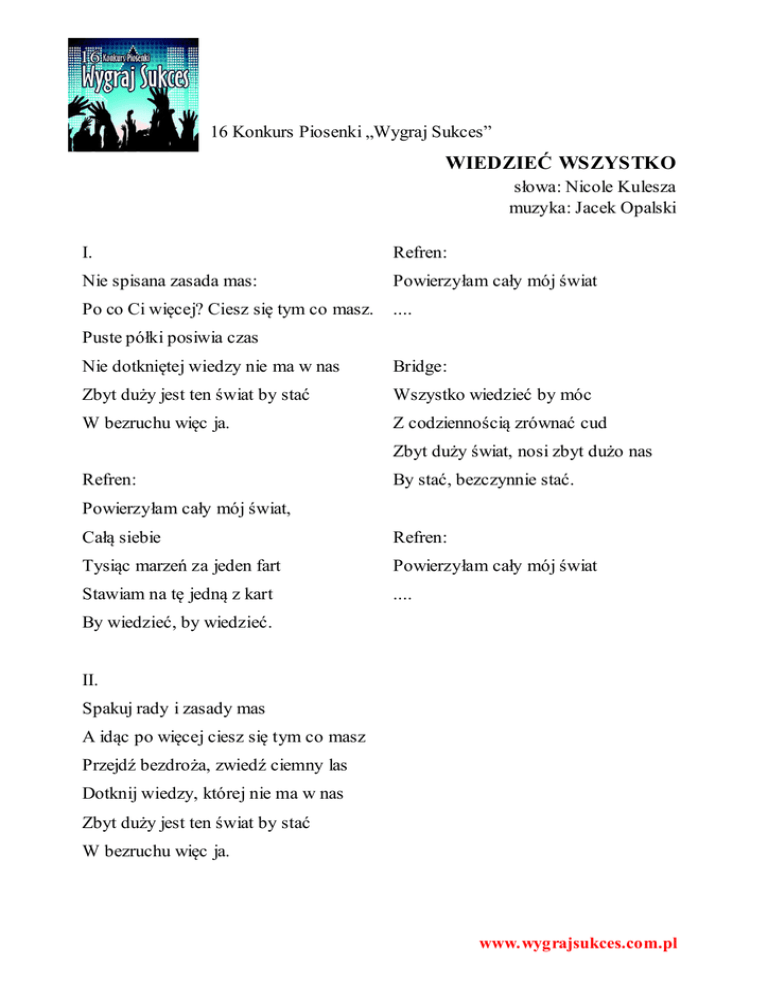 16 Konkurs Piosenki „Wygraj Sukces” WIEDZIEĆ WSZYSTKO słowa: Nicole Kulesza muzyka: Jacek Opalski I. Refren: Nie spisana zasada mas: Powierzyłam cały mój świat Po co Ci więcej? Ciesz się tym co masz. .... Puste półki posiwia czas Nie dotkniętej wiedzy nie ma w nas Bridge: Zbyt duży jest ten świat by stać Wszystko wiedzieć by móc W bezruchu więc ja. Z codziennością zrównać cud Zbyt duży świat, nosi zbyt dużo nas Refren: By stać, bezczynnie stać. Powierzyłam cały mój świat, Całą siebie Refren: Tysiąc marzeń za jeden fart Powierzyłam cały mój świat Stawiam na tę jedną z kart .... By wiedzieć, by wiedzieć. II. Spakuj rady i zasady mas A idąc po więcej ciesz się tym co masz Przejdź bezdroża, zwiedź ciemny las Dotknij wiedzy, której nie ma w nas Zbyt duży jest ten świat by stać W bezruchu więc ja. www.wygrajsukces.com.pl