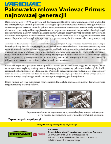 Pakowarka rolowa Variovac Primus najnowszej generacji! Misją powstałego w 1970 Variovaca jest dostarczanie Klientom najnowszych osiągnięć w dziedzinie przemysłowych technik pakowania. Atrakcyjne opakowanie podnosi wartość każdego produktu. Stosowane przez Variovac techniki pakowania są rezultatem kreatywnej i bardzo ścisłej współpracy z klientami poczynając od koncepcji opakowania, poprzez dostosowanie do potrzeb technologicznych i skonstruowanie maszyny lub linii pakującej odpowiadającej rzeczywistym potrzebom użytkownika. Wdrożone rozwiązania i udoskonalenia sprawiły, że firma Variovac stała się godnym zaufania partnerem dla producentów artykułów spożywczych, przemysłowych, jak również dla branży medycznej. Taki model działania zaowocował zaprezentowaną na targach Anuga w marcu najnowszej generacji pakowarką rolową. Została ona zaprojektowana i zbudowana niemal od zera. Konstrukcja maszyny opiera się na nowych, bardzo stabilnych specjalnych profilach, które pozwalają unieść niemal 6-cio metrową maszynę jednym wózkiem widłowym. Zastosowano najnowsze sterowniki i podzespoły spełniające wszystkie najnowsze normy Unii Europejskiej. Maszyna jest najszybsza ze wszystkich w swojej klasie. Dzięki najnowszej generacji zaworom pneumatycznym Rexroth maszyna jest blisko 25% szybsza aniżeli pozostałe dostępne na rynku urządzenia podobnej konfiguracji. Również i ergonomia pracy ma inny wymiar. Maszyna jest bardzo cicha, wygodna w użyciu, dzięki m.in. systemowi szybkiej zmiany matryc. Pokrywę górną wystarczy poluzować i odsunąć do środka maszyny bez konieczności jej zdejmowania. Dostęp do każdego miejsca urządzenia jest bardzo prosty i szybki dzięki uchylnym panelom bocznym. Sterowanie maszyną jest bardzo łatwe z uwagi na zastosowanie nowego dotykowego panelu sterującego w przyjaznej, graficznej formie. Nowy Primus jest więc najlepszym rozwiązaniem dla zakładu szukającego mocnej, trwałej, szybkiej i ergonomicznej maszyny rolowej. Zapraszamy również do zapoznania się z pozostałą ofertą maszyn pakujących, w tym maszyn zamykających tacki w układzie stołu bądź liniowym. Zapraszamy do współpracy! Wszystko dla przemysłu spożywczego PROMAR Przedsiębiorstwo Produkcyjno Handlowe Sp. z o.o. 05-092 Łomianki, ul. 11-go Listopada 96 tel. +48 22 768 64 00 do 09, fax +48 22 768 64 10, [email protected], www.promar.pl