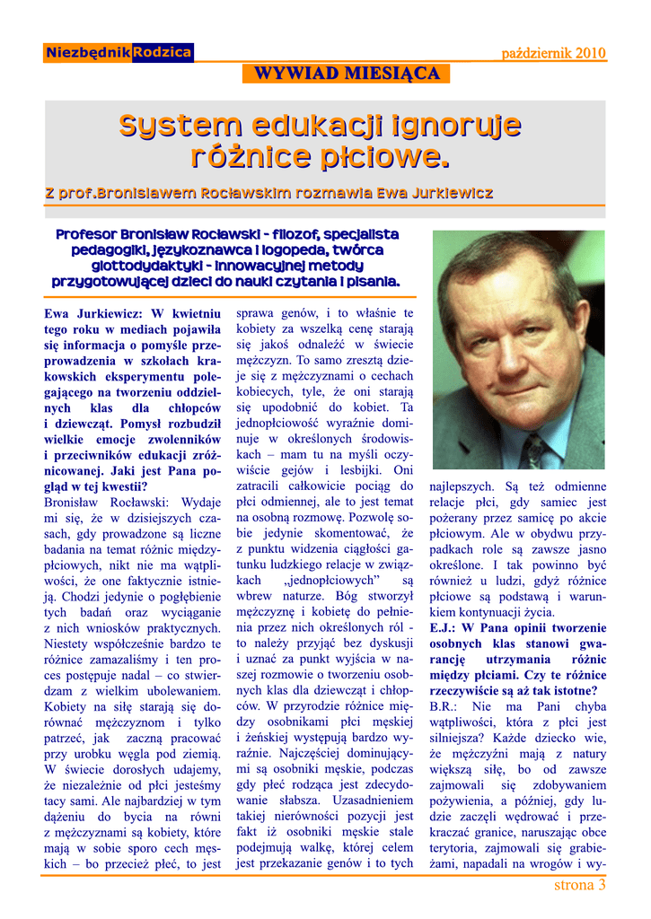 Niezbędnik Rodzica S y s t e m e d u k a c j i i g no r u j e r ó ż n i c e p ł c i ow e. Z p r o f . B r o n i s l a w e m Ro c ł a w s k i m r o z m a w i a E w a J u r k i e w i c z Profesor Bronisław Rocławski - filozof, specjalista pedagogiki, językoznawca i logopeda, twórca glottodydaktyki - innowacyjnej metody przygotowującej dzieci do nauki czytania i pisania. Niezbędnik Rodzica Niezbędnik Rodzica Niezbędnik Rodzica Niezbędnik Rodzica W klasie koedukacyjnej dziewczęta i chłopcy przeszkadzają sobie nawzajem. Niezbędnik Rodzica Zachęcam wszystkich przeciwników klas oddzielnych do lektury III rozdziału książki "Płeć mózgu" autorstwa A.Moir i D.Jessel, gdzie wspaniale zostały przedstawione implikacje wynikające z różnic płciowych dla edukacji.