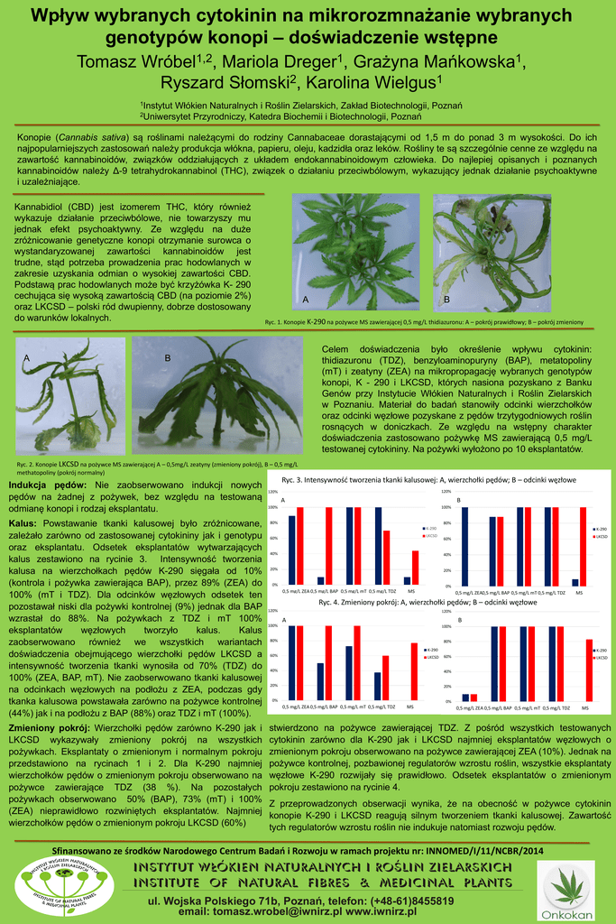 Wpływ wybranych cytokinin na mikrorozmnażanie wybranych genotypów konopi – doświadczenie wstępne Tomasz 1,2 Wróbel , 1 Dreger , 1 Mańkowska , Mariola Grażyna Ryszard Słomski2, Karolina Wielgus1 1Instytut Włókien Naturalnych i Roślin Zielarskich, Zakład Biotechnologii, Poznań 2Uniwersytet Przyrodniczy, Katedra Biochemii i Biotechnologii, Poznań Konopie (Cannabis sativa) są roślinami należącymi do rodziny Cannabaceae dorastającymi od 1,5 m do ponad 3 m wysokości. Do ich najpopularniejszych zastosowań należy produkcja włókna, papieru, oleju, kadzidła oraz leków. Rośliny te są szczególnie cenne ze względu na zawartość kannabinoidów, związków oddziałujących z układem endokannabinoidowym człowieka. Do najlepiej opisanych i poznanych kannabinoidów należy Δ-9 tetrahydrokannabinol (THC), związek o działaniu przeciwbólowym, wykazujący jednak działanie psychoaktywne i uzależniające. Kannabidiol (CBD) jest izomerem THC, który również wykazuje działanie przeciwbólowe, nie towarzyszy mu jednak efekt psychoaktywny. Ze względu na duże zróżnicowanie genetyczne konopi otrzymanie surowca o wystandaryzowanej zawartości kannabinoidów jest trudne, stąd potrzeba prowadzenia prac hodowlanych w zakresie uzyskania odmian o wysokiej zawartości CBD. Podstawą prac hodowlanych może być krzyżówka K- 290 cechująca się wysoką zawartością CBD (na poziomie 2%) oraz LKCSD – polski ród dwupienny, dobrze dostosowany do warunków lokalnych. A A B Ryc. 1. Konopie K-290 na pożywce MS zawierającej 0,5 mg/L thidiazuronu: A – pokrój prawidłowy; B – pokrój zmieniony Celem doświadczenia było określenie wpływu cytokinin: thidiazuronu (TDZ), benzyloaminopuryny (BAP), metatopoliny (mT) i zeatyny (ZEA) na mikropropagację wybranych genotypów konopi, K - 290 i LKCSD, których nasiona pozyskano z Banku Genów przy Instytucie Włókien Naturalnych i Roślin Zielarskich w Poznaniu. Materiał do badań stanowiły odcinki wierzchołków oraz odcinki węzłowe pozyskane z pędów trzytygodniowych roślin rosnących w doniczkach. Ze względu na wstępny charakter doświadczenia zastosowano pożywkę MS zawierającą 0,5 mg/L testowanej cytokininy. Na pożywki wyłożono po 10 eksplantatów. B Ryc. 2. Konopie LKCSD na pożywce MS zawierającej A – 0,5mg/L zeatyny (zmieniony pokrój), B – 0,5 mg/L methatopoliny (pokrój normalny) Indukcja pędów: Nie zaobserwowano indukcji nowych pędów na żadnej z pożywek, bez względu na testowaną odmianę konopi i rodzaj eksplantatu. Kalus: Powstawanie tkanki kalusowej było zróżnicowane, zależało zarówno od zastosowanej cytokininy jak i genotypu oraz eksplantatu. Odsetek eksplantatów wytwarzających kalus zestawiono na rycinie 3. Intensywność tworzenia kalusa na wierzchołkach pędów K-290 sięgała od 10% (kontrola i pożywka zawierająca BAP), przez 89% (ZEA) do 100% (mT i TDZ). Dla odcinków węzłowych odsetek ten pozostawał niski dla pożywki kontrolnej (9%) jednak dla BAP wzrastał do 88%. Na pożywkach z TDZ i mT 100% eksplantatów węzłowych tworzyło kalus. Kalus zaobserwowano również we wszystkich wariantach doświadczenia obejmującego wierzchołki pędów LKCSD a intensywność tworzenia tkanki wynosiła od 70% (TDZ) do 100% (ZEA, BAP, mT). Nie zaobserwowano tkanki kalusowej na odcinkach węzłowych na podłożu z ZEA, podczas gdy tkanka kalusowa powstawała zarówno na pożywce kontrolnej (44%) jak i na podłożu z BAP (88%) oraz TDZ i mT (100%). Zmieniony pokrój: Wierzchołki pędów zarówno K-290 jak i LKCSD wykazywały zmieniony pokrój na wszystkich pożywkach. Eksplantaty o zmienionym i normalnym pokroju przedstawiono na rycinach 1 i 2. Dla K-290 najmniej wierzchołków pędów o zmienionym pokroju obserwowano na pożywce zawierające TDZ (38 %). Na pozostałych pożywkach obserwowano 50% (BAP), 73% (mT) i 100% (ZEA) nieprawidłowo rozwiniętych eksplantatów. Najmniej wierzchołków pędów o zmienionym pokroju LKCSD (60%) Ryc. 3. Intensywność tworzenia tkanki kalusowej: A, wierzchołki pędów; B – odcinki węzłowe 120% 120% A B 100% 100% 80% 80% K-290 LKCSD 60% K-290 40% 40% 20% 20% 0% 0% 0,5 mg/L ZEA 0,5 mg/L BAP 0,5 mg/L mT 0,5 mg/L TDZ LKCSD 60% MS 0,5 mg/L ZEA0,5 mg/L BAP 0,5 mg/L mT 0,5 mg/L TDZ MS Ryc. 4. Zmieniony pokrój: A, wierzchołki pędów; B – odcinki węzłowe 120% 120% A B 100% 100% 80% 80% K-290 60% LKCSD K-290 60% 40% 40% 20% 20% 0% 0% 0,5 mg/L ZEA 0,5 mg/L BAP 0,5 mg/L mT 0,5 mg/L TDZ MS LKCSD 0,5 mg/L ZEA 0,5 mg/L BAP 0,5 mg/L mT 0,5 mg/L TDZ MS stwierdzono na pożywce zawierającej TDZ. Z pośród wszystkich testowanych cytokinin zarówno dla K-290 jak i LKCSD najmniej eksplantatów węzłowych o zmienionym pokroju obserwowano na pożywce zawierającej ZEA (10%). Jednak na pożywce kontrolnej, pozbawionej regulatorów wzrostu roślin, wszystkie eksplantaty węzłowe K-290 rozwijały się prawidłowo. Odsetek eksplantatów o zmienionym pokroju zestawiono na rycinie 4. Z przeprowadzonych obserwacji wynika, że na obecność w pożywce cytokinin konopie K-290 i LKCSD reagują silnym tworzeniem tkanki kalusowej. Zawartość tych regulatorów wzrostu roślin nie indukuje natomiast rozwoju pędów. Sfinansowano ze środków Narodowego Centrum Badań i Rozwoju w ramach projektu nr: INNOMED/I/11/NCBR/2014 ul. Wojska Polskiego 71b, Poznań, telefon: (+48-61)8455819 email: [email protected] www.iwnirz.pl