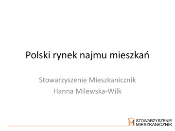 Polski rynek najmu mieszkań Stowarzyszenie Mieszkanicznik Hanna Milewska-Wilk Stowarzyszenie Mieszkanicznik • • • • • • Zrzesza osoby fizyczne, partnerami są firmy Wiedza dla obu stron umowy najmu Sąd arbitrażowy, informacja o usługach Profesjonalizacja obsługi najmu mieszkań Reprezentacja interesów całego sektora najmu Zaangażowanie środowisk naukowych w badania najmu w Polsce Kto potrzebuje nająć mieszkanie? • Studenci • Młode, usamodzielniające się osoby • Pary, jeszcze nie zdecydowane na wieksze formalności • Ludzie zmieniający miejsce pracy i tymczasowo oddelegowani • Osoby z rozpadających się związków Rola najmu w skali makro • Ułatwienie migracji i naturalnego ruchu ludności • Zapobieganie nadmiernemu zadłużaniu się gospodarstw domowych • Stabilizacja cen nieruchomości mieszkalnych (przewidywalność dla deweloperów i kupców) • Dobra inwestycja dla dużych funduszy (najczęściej emerytalnych) Polski rynek najmu – statystyka Polski rynek najmu – statystyka Polski rynek najmu – charakterystyka • Najem (stosunkowo) krótki • Najemcy 20-35 lat • Małe mieszkania, najem na pokoje, bardzo mało domów i mieszkań “premium” • Niewiele profesjonalistów obsługujących • Niezauważany przez statystyki i polityków • Bardzo szybki przyrost i zmiany charakteru najmu Największe problemy • Brak wiedzy -> duże ryzyko strat • Meble • Oczekiwania i przekonania co do najmu – Właściciele: zysk 5% rocznie? – Najemcy: obowiązki dot. przedmiotu najmu • Coraz bardziej skomplikowane prawo – Umowa najmu okazjonalnego – Obostrzenia po “czyścicielach kamienic” • Brak oferty poza największymi ośrodkami https://www.youtube.com/watch?v=Tts9NHL8D8I MODELE DZIAŁALNOŚCI NA RYNKU NAJMU Occasional owners • Podstawa rynku detalicznego • Mieszkania pojawiające się w wyniku naturalnego ruchu ludności • Najem jest przejściowym sposobem wykorzystywania mieszkania • Mieszkania nieprzygotowane do najmu • Nie zastawieni na zysk, ale i mało profesjonalni Prywatni inwestorzy • Mieszkania kupowane i robione “pod wynajem” • Poszukują najemców długoterminowych • Dość dobry standard mieszkań i obsługi • Korzystają z usług – nadal najem prywatny • Inwestują: specjaliści, niższa kadra menedżerska, drobni przedsiębiorcy • Dobrze kalkulują opłacalność Zaawansowane formy inwestycji • • • • • Spółki celowe Crowdfunding Fundusze inwestycyjne nieruchomości Fundusze średniego szczebla Fundusze emerytalne • Apartamenty wakacyjne Usługi dla wynajmujących • Działalność agencji pośrednictwa w obrocie nieruchomościami • Doradztwo i obsługa księgowo-podatkowa • Doradztwo i obsługa prawna • Remonty i naprawy • Sprzątanie • Home staging • Fotografia wnętrz • Ubezpieczenia Podnajem mieszkań • Większe mieszkania wynajmowane w całości od właścicieli podnajmowane np. na pokoje • Wymaga zarejestrowanej działalności gospodarczej • Nie wymaga dużego kapitału na start (~1000zł) • Dużo pracy przy obsłudze i przygotowaniu mieszkań • Bardzo zyskuje na popularności Zarządzanie najmem (długoterminowym) • Usługa dla właścicieli • Zakres w zależności od umowy – od szukania najemców po pełnomocnictwa notarialne do podpisywania umów • Monitorowanie płatności czynszu i opłat • 11-15% czynszu najmu miesięcznie, przy pustostanach w zależności od umowy • Remonty, odświeżanie, monitorowanie stanu technicznego Zarządzanie najmem krótkoterminowym • Jak operatorzy hoteli • Różne modele umów: podział zysków, stała opłata dla właściciela • Uwaga: VAT 23 %, płatny ostatnio również przez właściciela • Źle postrzegany przez wspólnoty – niejasne prawo budowlane Opłacalność • NBP za 2015 rok szacował opłacalność inwestycji mieszkaniowej na ok. 4% rocznie z gwiazdką • Nie ma szacunków dot. kosztów obsługi i utrzymania standardu mieszkania • Bardzo istotny jest sposób wykorzystania nieruchomości (hotelowe – pokoje – zwykły najem) Trendy demograficzne • Migracje do ośrodków miejskich • Coraz więcej gospodarstw domowych, ale coraz mniej licznych • Niechęć do “gniazdowania” • Zdolność kredytowa i coraz większy wkład własny… Trendy polityczne • Mieszkanie+ • Mieszkania socjalne, komunalne i TBSy • Fundusz Mieszkań na Wynajem • Dodatki mieszkaniowe? Trendy inwestycyjne • Wynajem komercyjny mieszkań w Polsce równie opłacalny jak pow. biurowych i handlowych • Brak działających inwestycji tego typu • Brak oferowanych budynków dla dużych inwestorów • Brak polskich funduszy emerytalnych • Słabość funduszy i giełdy Wolność finansowa przy inwestowaniu w mieszkania • • • • Wolność od zobowiązań finansowych – TAK Wolność do robienia tego, co się lubi – TAK Wolność od ryzyka – NIE Wolność od wszelkich obowiązków – NIE Wspieramy prace naukowe związane z rynkiem najmu: merytorycznie i poprzez wykorzystanie bazy adresowej członków i sympatyków, dostęp do firm i praktyków najmu. Zapytaj! ZAPRASZAM NA MIESZKANICZNIK.ORG.PL