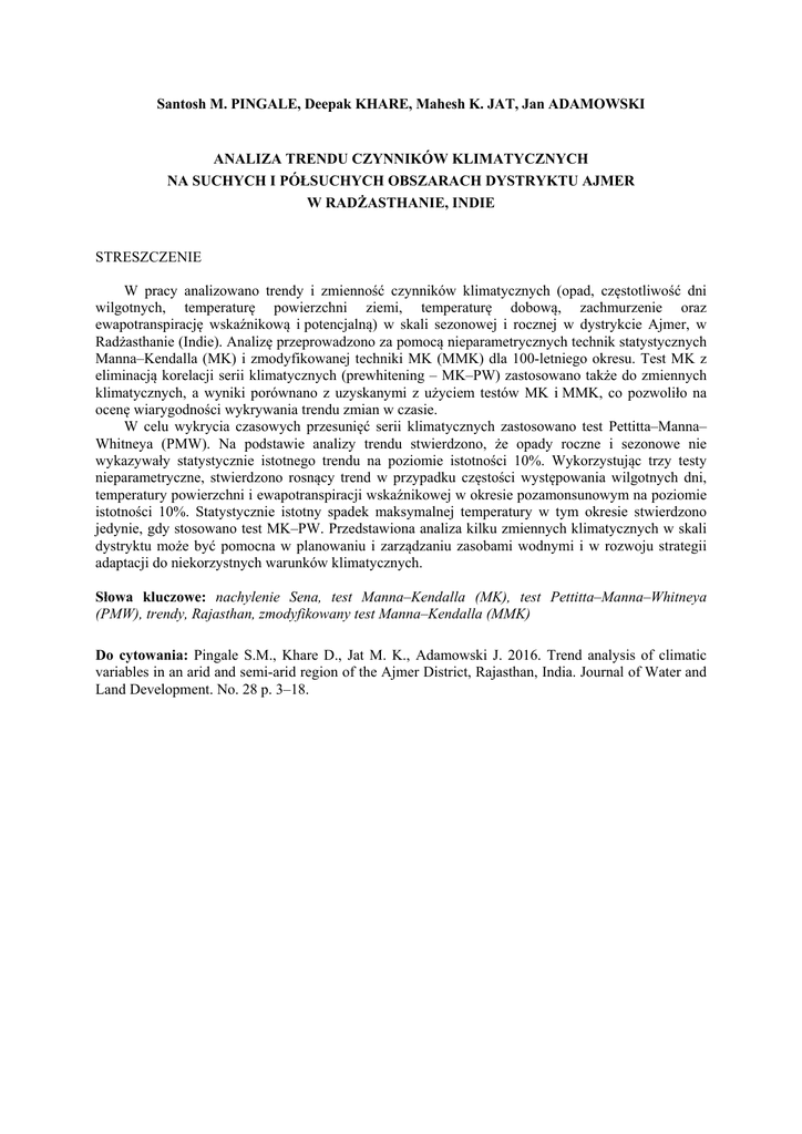 Santosh M. PINGALE, Deepak KHARE, Mahesh K. JAT, Jan ADAMOWSKI ANALIZA TRENDU CZYNNIKÓW KLIMATYCZNYCH NA SUCHYCH I PÓŁSUCHYCH OBSZARACH DYSTRYKTU AJMER W RADŻASTHANIE, INDIE STRESZCZENIE W pracy analizowano trendy i zmienność czynników klimatycznych (opad, częstotliwość dni wilgotnych, temperaturę powierzchni ziemi, temperaturę dobową, zachmurzenie oraz ewapotranspirację wskaźnikową i potencjalną) w skali sezonowej i rocznej w dystrykcie Ajmer, w Radżasthanie (Indie). Analizę przeprowadzono za pomocą nieparametrycznych technik statystycznych Manna–Kendalla (MK) i zmodyfikowanej techniki MK (MMK) dla 100-letniego okresu. Test MK z eliminacją korelacji serii klimatycznych (prewhitening – MK–PW) zastosowano także do zmiennych klimatycznych, a wyniki porównano z uzyskanymi z użyciem testów MK i MMK, co pozwoliło na ocenę wiarygodności wykrywania trendu zmian w czasie. W celu wykrycia czasowych przesunięć serii klimatycznych zastosowano test Pettitta–Manna– Whitneya (PMW). Na podstawie analizy trendu stwierdzono, że opady roczne i sezonowe nie wykazywały statystycznie istotnego trendu na poziomie istotności 10%. Wykorzystując trzy testy nieparametryczne, stwierdzono rosnący trend w przypadku częstości występowania wilgotnych dni, temperatury powierzchni i ewapotranspiracji wskaźnikowej w okresie pozamonsunowym na poziomie istotności 10%. Statystycznie istotny spadek maksymalnej temperatury w tym okresie stwierdzono jedynie, gdy stosowano test MK–PW. Przedstawiona analiza kilku zmiennych klimatycznych w skali dystryktu może być pomocna w planowaniu i zarządzaniu zasobami wodnymi i w rozwoju strategii adaptacji do niekorzystnych warunków klimatycznych. Słowa kluczowe: nachylenie Sena, test Manna–Kendalla (MK), test Pettitta–Manna–Whitneya (PMW), trendy, Rajasthan, zmodyfikowany test Manna–Kendalla (MMK) Do cytowania: Pingale S.M., Khare D., Jat M. K., Adamowski J. 2016. Trend analysis of climatic variables in an arid and semi-arid region of the Ajmer District, Rajasthan, India. Journal of Water and Land Development. No. 28 p. 3–18.