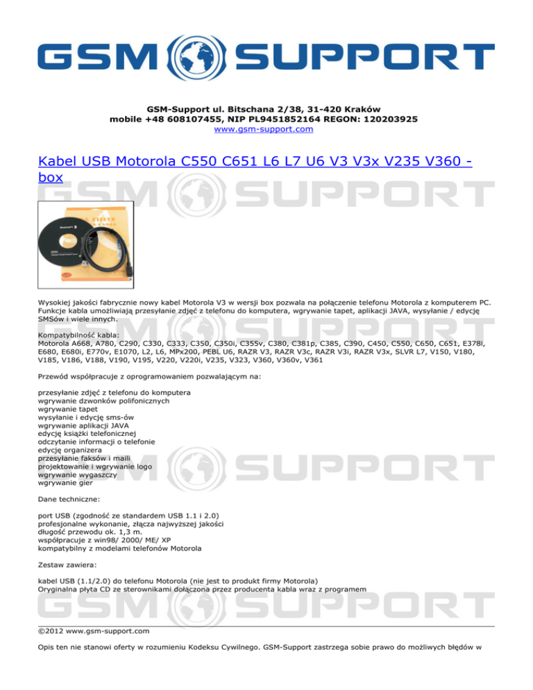 GSM-Support ul. Bitschana 2/38, 31-420 Kraków mobile +48 608107455, NIP PL9451852164 REGON: 120203925 www.gsm-support.com Kabel USB Motorola C550 C651 L6 L7 U6 V3 V3x V235 V360 box Wysokiej jakości fabrycznie nowy kabel Motorola V3 w wersji box pozwala na połączenie telefonu Motorola z komputerem PC. Funkcje kabla umożliwiają przesyłanie zdjęć z telefonu do komputera, wgrywanie tapet, aplikacji JAVA, wysyłanie / edycję SMSów i wiele innych. Kompatybilność kabla: Motorola A668, A780, C290, C330, C333, C350, C350i, C355v, C380, C381p, C385, C390, C450, C550, C650, C651, E378i, E680, E680i, E770v, E1070, L2, L6, MPx200, PEBL U6, RAZR V3, RAZR V3c, RAZR V3i, RAZR V3x, SLVR L7, V150, V180, V185, V186, V188, V190, V195, V220, V220i, V235, V323, V360, V360v, V361 Przewód współpracuje z oprogramowaniem pozwalającym na: przesyłanie zdjęć z telefonu do komputera wgrywanie dzwonków polifonicznych wgrywanie tapet wysyłanie i edycję sms-ów wgrywanie aplikacji JAVA edycję książki telefonicznej odczytanie informacji o telefonie edycję organizera przesyłanie faksów i maili projektowanie i wgrywanie logo wgrywanie wygaszczy wgrywanie gier Dane techniczne: port USB (zgodność ze standardem USB 1.1 i 2.0) profesjonalne wykonanie, złącza najwyższej jakości długość przewodu ok. 1,3 m. współpracuje z win98/ 2000/ ME/ XP kompatybilny z modelami telefonów Motorola Zestaw zawiera: kabel USB (1.1/2.0) do telefonu Motorola (nie jest to produkt firmy Motorola) Oryginalna płyta CD ze sterownikami dołączona przez producenta kabla wraz z programem ©2012 www.gsm-support.com Opis ten nie stanowi oferty w rozumieniu Kodeksu Cywilnego. GSM-Support zastrzega sobie prawo do możliwych błędów w opisie produktu. Prosimy o weryfikację z Państwa strony, a w razie wątpliwości o kontakt. GSM-Support ul. Bitschana 2/38 31-420 Kraków POLSKA tel. 608107455 e-mail: [email protected] Powered by TCPDF (www.tcpdf.org)