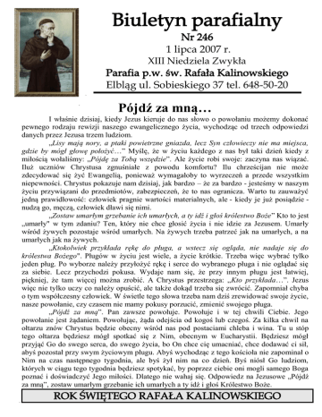 Biuletyn parafialny Nr 246 1 lipca 2007 r. XIII Niedziela Zwykła Parafia p.w. św. Rafała Kalinowskiego Elbląg ul. Sobieskiego 37 tel. 648-50-20 „ Pójdź za mną… I właśnie dzisiaj, kiedy Jezus kieruje do nas słowo o powołaniu możemy dokonać pewnego rodzaju rewizji naszego ewangelicznego życia, wychodząc od trzech odpowiedzi danych przez Jezusa trzem ludziom. „Lisy mają nory, a ptaki powietrzne gniazda, lecz Syn człowieczy nie ma miejsca, gdzie by mógł głowę położyć…” Myślę, że w życiu każdego z nas był taki dzień kiedy z miłością wołaliśmy: „Pójdę za Tobą wszędzie”. Ale życie robi swoje: zaczyna nas wiązać. Iluż uczniów Chrystusa zgnuśniałe z powodu komfortu? Ilu chrześcijan nie może zdecydować się żyć Ewangelią, ponieważ wymagałoby to wyrzeczeń a przede wszystkim niepewności. Chrystus pokazuje nam dzisiaj, jak bardzo – że za bardzo - jesteśmy w naszym życiu przywiązani do przedmiotów, zabezpieczeń, że to nas ogranicza. Warto tu zauważyć jedną prawidłowość: człowiek pragnie wartości materialnych, ale - kiedy je już posiądzie nudzą go, męczą, człowiek dławi się nimi. „Zostaw umarłym grzebanie ich umarłych, a ty idź i głoś królestwo Boże” Kto to jest „umarły" w tym zdaniu? Ten, który nie chce głosić życia i nie idzie za Jezusem. Umarły wśród żywych pozostaje wśród umarłych. Na żywych trzeba patrzeć jak na umarłych, a na umarłych jak na żywych. „Ktokolwiek przykłada rękę do pługa, a wstecz się ogląda, nie nadaje się do królestwa Bożego". Pługów w życiu jest wiele, a życie krótkie. Trzeba więc wybrać tylko jeden pług. Po wyborze należy przyłożyć rękę i serce do wybranego pługa i nie oglądać się za siebie. Lecz przychodzi pokusa. Wydaje nam się, że przy innym pługu jest łatwiej, piękniej, że tam więcej można zrobić. A Chrystus przestrzega: „Kto przykłada…”. Jezus więc nie tylko uczy co należy opuścić, ale także dokąd trzeba się zwrócić. Zapomniał chyba o tym współczesny człowiek. W świetle tego słowa trzeba nam dziś zrewidować swoje życie, nasze powołanie, czy czasem nie mamy pokusy porzucić, zmienić swojego pługa. „Pójdź za mną”. Pan zawsze powołuje. Powołuje i w tej chwili Ciebie. Jego powołanie jest żądaniem. Powołując, żąda odejścia od kogoś lub czegoś. Za kilka chwil na ołtarzu znów Chrystus będzie obecny wśród nas pod postaciami chleba i wina. Tu u stóp tego ołtarza będziesz mógł spotkać się z Nim, obecnym w Eucharystii. Będziesz mógł przyjąć Go do swego serca, do swego życia, bo On chce cię umacniać, chce dodawać ci sił, abyś pozostał przy swym życiowym pługu. Abyś wychodząc z tego kościoła nie zapominał o Nim na czas następnego tygodnia, ale byś żył nim na co dzień. Byś niósł Go ludziom, których w ciągu tego tygodnia będziesz spotykać, by poprzez ciebie oni mogli samego Boga poznać i doświadczyć Jego miłości. Dlatego nie wahaj się. Odpowiedz na Jezusowe „Pójdź za mną”, zostaw umarłym grzebanie ich umarłych a ty idź i głoś Królestwo Boże. ROK ŚWIĘTEGO RAFAŁA KALINOWSKIEGO Ogłoszenia Parafialne 1) Od 7 lipca po każdej Mszy św. wieczornej w naszej parafii odmawiać będziemy Nowennę przed Świętem Matki Bożej Szkaplerznej. Zapraszamy wszystkich, a szczególnie Bractwo Szkaplerza Świętego. 2) W tym tygodniu przypada pierwszy czwartek, piątek i sobota miesiąca. Zapraszamy do wspólnej modlitwy: w pierwszy czwartek miesiąca zapraszamy o godz. 18.00 na Mszę św. a po niej na nabożeństwo przed Najświętszym Sakramentem w intencji powołań kapłańskich i zakonnych z naszej parafii. w pierwszy piątek miesiąca spowiedź i Adoracja Najświętszego Sakramentu od godz. 17.30. Zapraszamy wszystkich czcicieli Najświętszego Serca Pana Jezusa i praktykujących I piątki miesiąca na Mszę Św. o godz. 18.00. 3) 4) 5) 6) 7) 8) 9) w pierwszą sobotę miesiąca zapraszamy Żywy Różaniec i czcicieli Matki Bożej na nabożeństwo wyjątkowo po Mszy św. W tym dniu zmiana tajemnic Różańca Trwają zapisy na pielgrzymkę autokarową z okazji IX Ogólnopolskiego Spotkania Rodziny Szkaplerznej i Roku Św. Rafała Kalinowskiego. Informacje na tablicy ogłoszeń i ostatniej stronie biuletynu. Caritas Parafialna zebrała do puszek w ubiegłą niedzielę 372 zł. Za złożone ofiary dziękujemy. Przypominamy, że w czasie wakacji punkt Caritas będzie nieczynny za wyjątkiem dnia jutrzejszego od godz. 16.00 do 17.00. Zapraszamy – jest możliwość otrzymania mąki. Rozpoczęliśmy przygotowania do XV Pieszej Pielgrzymki na Jasną Górę Za tydzień na ten cel będą zbierane przed kaplicą ofiary do puszek. Można również odbierać karty zgłoszeń oraz karty Duchowego Pielgrzyma. Zachęcamy do składania intencji, które pielgrzymi zaniosą przed tron Pani Jasnogórskiej. Osoby, które chciałyby wspomóc materialnie dzieło Pielgrzymki na Jasną Górę proszę o kontakt z ks. Piotrem Dzieciom i młodzieży życzymy udanych i bezpiecznych wakacji polecając opiece Aniołów Stróżów. Szczęść Boże. Pragniemy powiadomić, że nasz parafianin Br. Marcin Tomaszewski 8 września 2007r. złoży w Zakonie Karmelitów Bosych w Poznaniu śluby wieczyste a 6 października przyjmie święcenia diakonatu. Otoczmy Go modlitwą. Przed kaplicą można jeszcze nabyć książeczki wydane z okazji 15-lecia Diecezji w cenie 2,50 zł. Numer Konta Parafialnego PKO BP 72 1020 1752 0000 0102 0069 6047 1 lipca 7.00 9.00 9.00 10.30 INTENCJE MSZALNE Łk 9,51-62 XIII NIEDZIELA ZWYKŁA Śp. Karolina i Józef Śp. Emilia i zmarli z rodz. MRÓZ Z okazji 16 urodzin Grzegorza z prośbą o potrzebne łaski i dary Ducha Św. Śp. Stanisław GUTOWSKI w 35 r. śm. oraz Śp. Anna GUTOWSKA w 8 rocz. śm. Dziękczynna za 5 lat posługi Proboszcza w naszej parafii int od Wspólnoty Odnowy 15.00 KORONKA DO BOŻEGO MIŁOSIERDZIA 18.00 Śp. Rudolf BR