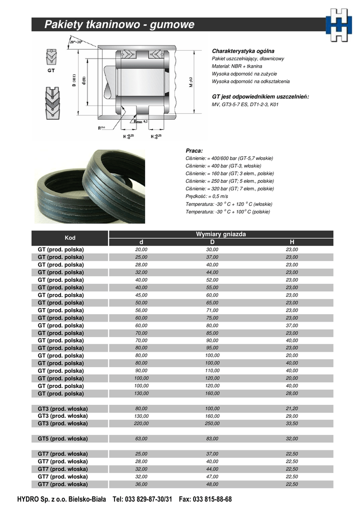 Pakiety tkaninowo - gumowe Charakterystyka ogólna Pakiet uszczelniaj cy, dławnicowy Materiał: NBR + tkanina Wysoka odporno na zu ycie Wysoka odporno na odkształcenia GT jest odpowiednikiem uszczelnie : MV, GT3-5-7 ES, DT1-2-3, K01 Praca: Ci nienie: = 400/600 bar (GT-5,7 włoskie) Ci nienie: = 400 bar (GT-3, włoskie) Ci nienie: = 160 bar (GT; 3 elem., polskie) Ci nienie: = 250 bar (GT; 5 elem., polskie) Ci nienie: = 320 bar (GT; 7 elem., polskie) Pr dko : = 0,5 m/s Temperatura: -30 o C + 120 o C (włoskie) Temperatura: -30 o C + 100 o C (polskie) Kod GT (prod. GT (prod. GT (prod. GT (prod. GT (prod. GT (prod. GT (prod. GT (prod. GT (prod. GT (prod. GT (prod. GT (prod. GT (prod. GT (prod. GT (prod. GT (prod. GT (prod. GT (prod. GT (prod. GT (prod. polska) polska) polska) polska) polska) polska) polska) polska) polska) polska) polska) polska) polska) polska) polska) polska) polska) polska) polska) polska) d Wymiary gniazda D H 20,00 30,00 23,00 25,00 37,00 23,00 28,00 40,00 23,00 32,00 44,00 23,00 40,00 52,00 23,00 40,00 55,00 23,00 45,00 60,00 23,00 50,00 65,00 23,00 56,00 71,00 23,00 60,00 75,00 23,00 60,00 80,00 37,00 70,00 85,00 23,00 70,00 90,00 40,00 80,00 95,00 23,00 80,00 100,00 20,00 80,00 100,00 40,00 90,00 110,00 40,00 100,00 120,00 20,00 100,00 120,00 40,00 130,00 160,00 28,00 GT3 (prod. włoska) GT3 (prod. włoska) GT3 (prod. włoska) 80,00 100,00 21,20 130,00 160,00 29,00 220,00 250,00 33,50 GT5 (prod. włoska) 63,00 83,00 32,00 GT7 (prod. GT7 (prod. GT7 (prod. GT7 (prod. GT7 (prod. 25,00 37,00 22,50 28,00 40,00 22,50 32,00 44,00 22,50 32,00 47,00 22,50 36,00 48,00 22,50 włoska) włoska) włoska) włoska) włoska) HYDRO Sp. z o.o. Bielsko-Biała Tel: 033 829-87-30/31 Fax: 033 815-88-68 Kod GT7 (prod. GT7 (prod. GT7 (prod. GT7 (prod. GT7 (prod. GT7 (prod. GT7 (prod. GT7 (prod. GT7 (prod. GT7 (prod. GT7 (prod. GT7 (prod. GT7 (prod. GT7 (prod. GT7 (prod. GT7 (prod. GT7 (prod. GT7 (prod. GT7 (prod. MV (prod. MV (prod. MV (prod. MV (prod. MV (prod. MV (prod. MV (prod. MV (prod. włoska) włoska) włoska) włoska) włoska) włoska) włoska) włoska) włoska) włoska) włoska) włoska) włoska) włoska) włoska) włoska) włoska) włoska) włoska) angielska) angielska) angielska) angielska) angielska) angielska) angielska) angielska) d Wymiary gniazda D H 40,00 52,00 22,50 45,00 60,00 22,50 50,00 65,00 22,50 50,00 70,00 30,00 55,00 70,00 22,50 56,00 71,00 22,50 60,00 75,00 22,50 60,00 80,00 37,00 63,00 78,00 22,50 63,00 83,00 37,00 65,00 85,00 41,00 70,00 85,00 22,50 70,00 90,00 40,00 80,00 95,00 22,50 80,00 100,00 41,00 90,00 110,00 41,00 100,00 120,00 41,00 110,00 125,00 30,00 160,00 190,00 60,00 25,00 35,00 19,60 25,00 37,00 22,50 30,00 42,00 22,50 32,00 44,00 22,50 55,00 70,00 22,50 63,00 83,00 32,00 63,00 83,00 37,00 90,00 110,00 41,50 HYDRO Sp. z o.o. Bielsko-Biała Tel: 033 829-87-30/31 Fax: 033 815-88-68