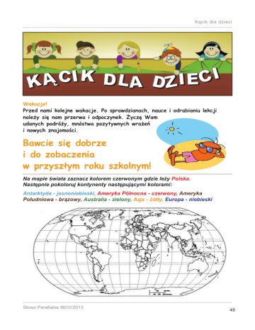 Kącik dla dzieci I K C I C D I E L Ą D A Z K Wakacje! Przed nami kolejne wakacje. Po sprawdzianach, nauce i odrabianiu lekcji należy się nam przerwa i odpoczynek. Życzę Wam udanych podróży, mnóstwa pozytywnych wrażeń i nowych znajomości. Bawcie się dobrze i do zobaczenia w przyszłym roku szkolnym! Na mapie świata zaznacz kolorem czerwonym gdzie leży Polska. Następnie pokoloruj kontynenty następującymi kolorami: Antarktyda - jasnoniebieski, Ameryka Północna - czerwony, Ameryka Południowa - brązowy, Australia - zielony, Azja - żółty, Europa - niebieski Słowo Parafialne 86/VI/2013 45 Wakacje 2013 Czy wiesz kto w Nowym Testamencie najwięcej podróżował? Apostoł Paweł! Był Żydem urodzonym w Tarsie, który początkowo prześladował chrześcijan. W dordze do Damaszku doświadczył jednak nawrócenia. Od tego momentu zaczął głosić ewangelię. Stał się nauczycielem i opiekunem chrześcijan. Odbył wiele podróży misyjnych, które bardzo często były niebezpieczne. W jednym z listów napisał: Trzy razy statek mój się rozbił, raz spędziłem dzień i noc płynąc wpław wśród fal… Zrobiłem wiele długich podróży piechotą, wśród niebezpieczeństw wezbranych rzek i rabusiów… (2 Kor 25b–26a) Apostoł Paweł był m.in. w Azji Mniejszej, Grecji, Rzymie, na Cyprze, na Krecie 46 Słowo Parafialne 86/VI/2013 Czy wiesz jak podróżowano w antyku? Kącik dla dzieci W starożytnym świecie nie było statków pasażerskich. Podróżni chcący płynąć statkiem, szli do portu i szukali statków towarowych, które płynęły w kierunku dla nich dogodnym. W Ostii niedaleko Rzymu, znajdował się nawet specjalny plac, na którym zgromadzone były biura różnych spedytorów i tutaj można było szukać miejsca na statkach płynących w różnych kierunkach. Statki towarowe przeznaczone były do przewożenia ładunków i pasażerów zabierały niejako „przy okazji”. Nie było więc na nich wygód, obsługi, wyżywienia i kajut z łóżkami. Podróżny musiał być zaopatrzony we własną żywność i służbę do pomocy. Rezerwacji rejsu mógł dokonać u oficera „magistra navis” zajmującego się handlowymi interesami właściciela statku. Dowodzenie na okręcie należało do kapitana („gubernator”). Kabiny na statku posiadali tylko oni i kilku najbogatszych pasażerów lub gości. Reszta podróżnych dostawała miejsce na pokładzie. Ludzie spali na powietrzu lub w małych namiotach rozkładanych na noc. Na statkach znajdowały się też kuchnie z których korzystała załoga i pasażerowie. http://alehistoria.blox.pl/2011/11/PODROZE-MORSKIE-W-STAROZYTNOSCI.html Podróże odbywano również na piechotę Ze względu na gorący klimat chodzono przede wszystkim w sandałach. Nogi zawsze były zakurzone, więc przed wejściem do domu należało je umyć. Robił to niewolnik lub pan domu, by uhonorować gościa. Służyła do tego specjalna misa. Zwierzęta, które ułatwiały podróżowanie osły Słowo Parafialne 86/VI/2013 woły wielbłądy muły 47 Wakacje 2013 A czym Ty najbardziej lubisz podróżować? Pokoloruj ulubiony środek transporu (może być więcej niż jeden) Apostoł Paweł spędził wiele czasu na Cyprze Małe państwo - duża wyspa - gościnna, egzotyczna, położona na przecięciu szlaków łączących Azję, Afrykę oraz Europę. Najłagodniejszy i najbardziej słoneczny klimat w basenie Morza Śródziemnego. Sezon na Cyprze trwa cały rok! Chociaż Cypr jest państwem małym, dzięki bogatej ofercie dla turystów, cieszy się ogromną popularnością wśród miłośników wakacyjnych przygód i wypoczynku. 48 Cypr Słowo Parafialne 86/VI/2013 Kącik dla dzieci Cypr, to nie tylko piaszczyste, złote plaże - to również bogactwo zabytków kultury i starannie pielęgnowana tradycja, widoczna w tańcu, śpiewie i przekazywanych przez starsze pokolenia legendach. Atrakcją mogą być parki wodne, pola golfowe, akwarium oceaniczne w Protaras czy parki tematyczne: Świat Strusia w Agios Ioannis Malountas; Park Wielbłąda w Larnace, Sanktuarium Osiołka. Dużo satys- fakcji na Cyprze znajdą miłośnicy sportów, szczególnie wodnych: surfingu, nurkowania, kajaków. Dodatkową atrakcją są liczne imprezy organizowane zwłaszcza w sezonie letnim, największym zainteresowaniem turystów cieszy się organizowany we wrześniu Festiwal Wina, w trakcie którego można posmakować najbardziej wykwintnych, cypryjskich trunków oraz win domowej roboty. Ciekawe wydarzenia na Cyprze: kwiecień-maj - Festiwal Dzikich Kwiatów Cypru maj - świętowanie Wielkanocy lipiec i wrzesień - Festiwal Truskawek, radosnym obchodom towarzyszy oczywiście konsumpcja :) przełom sierpnia i września - koncerty przy Pełni Księżyca w Limassol, Pafos i innych miastach wrzesień Festiwal Lefkary oraz Festiwal Wina w Limassol - tradycyjna, coroczna impreza, której celem jest celebrowanie kultu wina. Obchodom towarzyszy bezpłatna degustacja każdego rodzaju wina. fot. Flickr.com październik - Festiwal Afrodyty w Pafos Słowo Parafialne 86/VI/2013 49 Wakacje 2013 Znalezione w sieci Na lekcji języka polskiego nauczyciel pyta: - Czym będzie wyraz „chętnie” w zdaniu - „Uczniowie chętnie wracają do szkoły po wakacjach“? Zgłasza się Jasiu: - Kłamstwem, panie profesorze. Boże, nie dodawaj mi sił, pozwól mi odpocząć Lekcja przysposobienia obronnego: - Które krwotoki są groźniejsze: zewnętrzne czy wewnętrzne? - Wewnętrzne. - A dlaczego? - Bo trudniej pacjenta obandażować. Idźcie pobawić się na zewnątrz 50 Kto nie lubi lodów? Znajdź drogę do smakołyków Szkoła to telewizja - Geografia - Discovery Channel - WF - Szkoła przetrwania - Religia - Dotyk anioła - Chemia - Szklana pułapka - Matematyka - 5*5 - Historia - Sensacje XX wieku - Język polski - Magia liter - Lekcja muzyki - Jaka to melodia - Lekcja wychowawcza - Na każdy temat - Poprawka - Stawka większa niż życie - Test - Milionerzy - Ostatnia Ławka - Róbta co