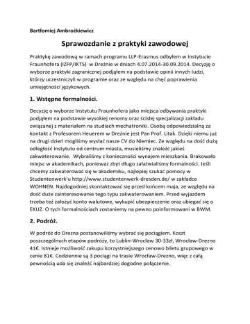 Bartłomiej Ambrożkiewicz Sprawozdanie z praktyki zawodowej Praktykę zawodową w ramach programu LLP-Erasmus odbyłem w Instytucie Fraunhofera (IZFP/IKTS) w Dreźnie w dniach 4.07.2014-30.09.2014. Decyzję o wyborze praktyki zagranicznej podjąłem na podstawie opinii innych ludzi, którzy uczestniczyli w programie oraz ze względu na chęć poprawienia umiejętności językowych. 1. Wstępne formalności. Decyzję o wyborze Instytutu Fraunhofera jako miejsca odbywania praktyki podjąłem na podstawie wysokiej renomy oraz ścisłej specjalizacji zakładu związanej z materiałem na studiach mechatroniki. Osobą odpowiedzialną za kontakt z Profesorem Heuerem w Dreźnie jest Pan Prof. Litak. Dzięki niemu już na drugi dzień mogliśmy wysłać nasze CV do Niemiec. Ze względu na dość dużą odległość Instytutu od centrum miasta, musieliśmy znaleźć jakieś zakwaterowanie. Wybraliśmy z konieczności wynajem mieszkania. Brakowało miejsc w akademikach, ponieważ zbyt długo załatwialiśmy formalności. Jeśli chcemy zakwaterować się w akademiku, najlepiej szukać pomocy w Studentenwerk'u http://www.studentenwerk-dresden.de/ w zakładce WOHNEN. Najdogodniej skontaktować się przed końcem maja, ze względu na dość duże zainteresowanie tego typu zakwaterowaniem. Przed wyjazdem trzeba też założyć konto walutowe, wykupić ubezpieczenie oraz ubiegać się o EKUZ. O tych formalnościach zostaniemy na pewno poinformowani w BWM. 2. Podróż. W podróż do Drezna postanowiliśmy wybrać się pociągiem. Koszt poszczególnych etapów podróży, to Lublin-Wrocław 30-33zł, Wrocław-Drezno 41€. Istnieje możliwość zakupu korzystniejszego cenowo biletu grupowego w cenie 81€. Codziennie są 3 pociągi na trasie Wrocław-Drezno, więc z całą pewnością uda się znaleźć najbardziej dogodne połączenie. 3. Pierwsze dni w mieście. Po przybyciu na miejsce, najpierw zapoznaliśmy się z miastem. Następnego dnia musieliśmy stawić się w Instytucie. Prof. Heuer zapoznał nas z tematyką oraz z tym, czym ogólnie zajmują się Instytuty Fraunhofera w Niemczech i w innych częściach świata. Następnie spotkaliśmy się ze swoimi koordynatorami praktyk, którzy oprowadzili nas po Instytucie, a także wstępnie zapoznali z przydzielonymi projektami. Po pierwszym dniu w zakładzie postanowiliśmy załatwić konieczne formalności związane z pobytem w Niemczech. Musieliśmy się zameldować w oddziale meldunkowym tzw. Bürgeramt. Kolejnym krokiem był zakup biletu miesięcznego w DVB (odpowiednik polskiego MPK Lublin). Cena takiego biletu to 41,50€. Posiadając go, mamy szereg możliwości: możemy korzystać z tramwajów, autobusów, pociągów, kolejek górskich oraz statków. Oprócz dobrej organizacji transportu publicznego byliśmy zaskoczeni również łatwym dostępem do różnego rodzaju usług. Większość z nich mieściła się na dole bloku, w którym mieszkaliśmy. Były to m.in. sklep spożywczy, sieć drogeryjna DM, czy też telefonia komórkowa Vodafone. Do najbliższych supermarketów mieliśmy 5-10 minut piechotą. Były to znane z Polski Lidl czy Kaufland, ale również miejscowe Penny oraz Rewe. Ceny, w przeliczeniu na złotówki, są bardzo zbliżone do polskich. Droższe są z całą pewnością mięso, ser, pieczywo. 4. Zabytki i inne atrakcje. Drezno jest miastem barokowym i pomimo bombardowania w 1945r. posiada bardzo dobrze zachowaną starówkę. Godne uwagi są przede wszystkim Zwinger, Semperoper, Frauenkirche oraz bulwar drezdeński. Pozostałe zabytki znajdują się już w dalszej odległości od centrum. Z biletem miesięcznym dojedziemy do dworku Pillnitz, możemy również przejechać się historyczną kolejką górską w dzielnicy Loschwitz. W Dreźnie zwiedzimy wiele ciekawych muzeów. Wstęp do niektórych jest za darmo w określonych dniach i godzinach. Jednak miejsca godne uwagi znajdują się nie tylko w mieście, ale również w jego najbliższej okolicy. Warto zobaczyć skałki w Pirnie oraz zamki w Moritzburgu czy Meissen. Aby się tam dostać, należy nabyć dodatkowy bilet, gdyż nie leżą one w strefie Drezna. 5. Praktyka w Instytucie. Po wspomnianym pierwszym dniu nadeszła pora na zapoznanie się ze wstępem teoretycznym do realizowanego projektu. Celem mojego projektu było narysowanie w programie Solid Edge końcówki montowanej na ramię skanera 3D a następnie wydrukowanie jej w drukarni 3D. Pracę nad projektem rozpocząłem od sporządzenia szkicu rysunku. Po zaakceptowaniu kształtu i formy przez opiekuna praktyk, mogłem przystąpić do narysowania go w programie. Tutaj z całą pewnością przydały mi się umiejętności nabyte podczas zajęć na politechnice, ale również sam musiałem odkryć pewne opcje. Po narysowaniu końcówki, kolejnym krokiem było znalezienie najbardziej lukratywnej oferty wydruku. Wraz z moim koordynatorem wysłaliśmy maila do drukarni 3D w Chemnitz. Cały koszt projektu zamknął się w kwocie 10€. Ze względu na dużą ilość czasu do końca mojej praktyki, przydzielono mi drugi projekt. Był on bardziej złożony od poprzedniego, gdyż polegał na skonstruowaniu systemu mechatronicznego podpinanego również pod robot 3D, lecz wspomniana końcówka była tylko jednym z wielu elementów wchodzących w jego skład. Po sporządzeniu kilku prototypów, mój koordynator zaakceptował rozmieszczenie poszczególnych elementów i zabrałem się do ich wymiarowania. System miał się składać z dostępnych w laboratorium części, takich jak elektryczny wyłącznik, szyny na których oparta była cała konstrukcja, czy złączki HWA. Po narysowaniu systemu w programie, sporządziłem jego dokumentację techniczną wraz z opisem funkcjonowania czy łatwego montażu na ramię robota. Zadanie nie było łatwe, ale ostatecznie udało mi się je sfinalizować. Na koniec każdy z nas miał przygotować prezentację na temat wykonanych projektów, którą należało wygłosić przed całym zespołe