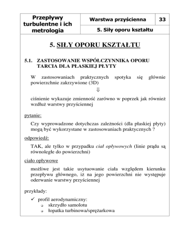 Przepływy t u rb u l en t n e i i c h m et ro l o g i a Warstwa przyścienna 3 3 5 . S ił y o po ru k ształ tu 5. SIŁY OPORU KSZTAŁTU 5.1. ZASTOSOWANIE WSPÓŁCZYNNIKA OPORU TARCIA DLA PŁASKIEJ PŁYTY W zastosowaniach praktycznych powierzchnie zakrzywione (3D) spotyka się głównie ⇓ ciśnienie wykazuje zmienność zarówno w poprzek jak również wzdłuż warstwy przyściennej pytanie: Czy wyprowadzone dotychczas zależności (dla płaskiej płyty) mogą być wykorzystane w zastosowaniach praktycznych ? odpowiedź: TAK, ale tylko w przypadku ciał opływowych (linie prądu są równoległe do powierzchni) ciało opływowe możliwe jest takie usytuowanie ciała względem kierunku przepływu głównego, iż na jego powierzchni nie występuje oderwanie warstwy przyściennej przykłady: profil aerodynamiczny: skrzydło samolotu łopatka turbinowa/sprężarkowa Przepływy t u rb u l en t n e i i c h m et ro l o g i a Warstwa przyścienna 3 4 5 . S ił y o po ru k ształ tu ryba kropla deszczu Siła oporu tarcia ciała opływowego Ff = c f ρU ∞2 2 A ( 5.1 ) A - pole przekroju rzutu ciała na kierunek normalny do przepływu cf jest określane z tablic/wykresów dla płaskiej płyty o tej samej chropowatości ostrzeżenie: jeśli na powierzchni ciała wystąpi oderwanie warstwy przyściennej metoda ta prowadzi do znacznych błędów !!! Przepływy t u rb u l en t n e i i c h m et ro l o g i a Warstwa przyścienna 3 5 5 . S ił y o po ru k ształ tu wpływ usytuowania profilu na wystąpienie oderwania warstwy przyściennej A) brak oderwania B) zwiększony kąt natarcia ⇒ oderwanie WP w tylnej części profilu po stronie wypukłej Przepływy t u rb u l en t n e i i c h m et ro l o g i a Warstwa przyścienna 3 6 5 . S ił y o po ru k ształ tu Całkowita siła oporu: siła oporu tarcia siła oporu kształtu – powstająca w wyniku sił ciśnieniowych Fk = ck ρU ∞2 2 A ( 5.2 ) współczynnik ck jest określany eksperymentalnie Ftot = F f + Fk Ftot = ctot ρU ∞2 2 A ( 5.3 ) ( 5. 4 ) przykład współczynnika ctot : dobrze znany współczynnik cx będący miarą "jakości" kształtu (z aerodynamicznego punktu widzenia) dla ciał opływowych F f ≈ Fk dla ciał nieopływowych ( 5.5 ) Przepływy t u rb u l en t n e i i c h m et ro l o g i a Warstwa przyścienna 3 7 5 . S ił y o po ru k ształ tu ślad aerodynamiczny – obszar przepływu za ciałem charakteryzujący się poprzecznym gradientem prędkości (intensywne procesy mieszania ⇒ duże straty energii) w praktyce F f << Fk ≈ Ftot ( 5. 6 ) F f = ( 1 ÷ 2%) Ftot ( 5.7 ) Przepływy t u rb u l en t n e i i c h m et ro l o g i a kształt ciała tarcza kołowa ( ⊥ do kierunku przepływu) układ tarcz kołowych ( ⊥ do kierunku prądu) płyta prostokątna ( ⊥ do kierunku przepływu) (l - długość płyty) walec kołowy o osi ║ do kierunku przepływu półkula wydrąż ona zwrócona wklęsłością przeciw kierunkowi przepływu półkula wydrąż ona zwrócona wklęsłością w kierunku przepływu walec kołowy o osi ⊥ do kierunku przepływu kula Warstwa przyścienna 3 8 5 . S ił y o po ru k ształ tu l/d Re cx - > 103 1.12 > 103 1.12 0.93 1.04 1.52 0 1 2 3 1 5 20 ∞ > 10 1.16 1.20 1.50 2.00 0 1 2 4 7 > 103 1.12 0.91 0.85 0.87 0.99 - > 103 1.33 - > 103 0.34 5 3 1 5 20 ∞ 10 ÷ 10 0.63 0.74 0.90 1.20 5 ∞ > 5⋅105 0.35 0.33 - 103 ÷ 105 > 3⋅105 0.47 0.20 - > 2⋅105 0.04 profil aerodynamiczny 3 Przepływy t u rb u l en t n e i i c h m et ro l o g i a Warstwa przyścienna 5 . S ił y o po ru k ształ tu 3 9