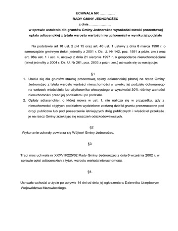 UCHWAŁA NR ………….. RADY GMINY JEDNOROŻEC z dnia ………………. w sprawie ustalenia dla gruntów Gminy Jednorożec wysokości stawki procentowej opłaty adiacenckiej z tytułu wzrostu wartości nieruchomości w wyniku jej podziału Na podstawie art 18 ust. 2 pkt 15 oraz art. 40 ust. 1 ustawy z dnia 8 marca 1990 r. o samorządzie gminnym (tekst jednolity z 2001 r. Dz. U. Nr 142, poz. 1591 z późn. zm.) oraz art. 98a ust. 1 i ust. 4, ustawy z dnia 21 sierpnia 1997 r. o gospodarce nieruchomościami (tekst jednolity z 2004 r. Dz. U. Nr 261, poz. 2603 z późn. zm.) uchwala się co następuje: §1 1. Ustala się dla gruntów stawkę procentową opłaty adiacenckiej płatnej na rzecz Gminy Jednorożec z tytułu wzrostu wartości nieruchomości w wyniku jej podziału dokonanego na wniosek właściciela lub użytkownika wieczystego w wysokości 30% różnicy wartości nieruchomości przed jej podziałem i po podziale. 2. Opłaty adiacenckiej, o której mowa w ust. 1, nie nalicza się w przypadku, gdy z nieruchomości objętych podziałem wydzielone zostaną działki gruntu przeznaczone pod drogi publiczne lub pod poszerzenie istniejących dróg publicznych i właściciel przekaże je na rzecz Gminy zrzekając się roszczeń odszkodowawczych. §2 Wykonanie uchwały powierza się Wójtowi Gminy Jednorożec. §3 Traci moc uchwała nr XXXVIll/225/02 Rady Gminy Jednorożec z dnia 6 września 2002 r. w sprawie opłat adiacenckich z tytułu wzrostu wartości nieruchomości. §4. Uchwała wchodzi w życie po upływie 14 dni od dnia jej ogłoszenia w Dzienniku Urzędowym Województwa Mazowieckiego.