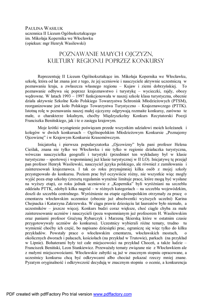 PAULINA WASILUK uczennica II Liceum Ogólnokształcącego im. Mikołaja Kopernika we Włocławku (opiekun: mgr Henryk Wasilewski) Poznawanie małych Ojczyzn, Kultury regionu poprzez konkursy Reprezentuję II Liceum Ogólnokształcące im. Mikołaja Kopernika we Włocławku, szkołę, która od lat znana jest z tego, że jej uczniowie i nauczyciele aktywnie uczestniczą w poznawaniu kraju, a zwłaszcza własnego regionu – Kujaw i ziemi dobrzyńskiej. To poznawanie odbywa się poprzez krajoznawstwo i turystykę – wycieczki, rajdy, obozy wędrowne. W latach 1993 – 1997 funkcjonowała w naszej szkole klasa turystyczna, obecnie działa aktywnie Szkolne Koło Polskiego Towarzystwa Schronisk Młodzieżowych (PTSM), reorganizowane jest koło Polskiego Towarzystwa Turystyczno – Krajoznawczego (PTTK). Istotną rolę w poznawaniu naszej małej ojczyzny odgrywają rozmaite konkursy, zarówno te małe, o charakterze lokalnym, choćby Międzyszkolny Konkurs Recytatorski Poezji Franciszka Benińskiego, jak i te o zasięgu krajowym. Moje krótki wystąpienie poświęcam przede wszystkim udziałowi moich koleżanek i kolegów w dwóch konkursach – Ogólnopolskim Młodzieżowym Konkursie „Poznajemy Ojcowiznę” i w Krajowym Konkursie Krasomówczym. Inicjatorką i pierwsza popularyzatorka „Ojcowizny” była pani profesor Helena Cieślak, znana nie tylko we Włocławku i nie tylko w regionie działaczka turystyczna, wówczas nauczycielka geografii i turystyki (przedmiot ten wykładany był w klasie turystyczno – sportowej i wspomnianej już klasie turystycznej w II LO). Inicjatywę tę przejął pan profesor Henryk Wasilewski, nauczyciel języka polskiego, ale również z zamiłowania i zainteresowań krajoznawca. I tak co roku przynajmniej kilka osób z mojej szkoły przystępowało do konkursu. Poziom prac był oczywiście różny, nie wszystkie więc mogły wyjść poza etap szkolny (zresztą regulamin wyraźnie limituje prace, które mogą być wysłane na wyższy etap), co roku jednak uczniowie z „Kopernika” byli wyróżniani na szczeblu oddziału PTTK, zdobyli kilka nagród – w różnych kategoriach – na szczeblu wojewódzkim, doszli do szczebla centralnego. Wyróżnienie na etapie ogólnopolskim otrzymały za pracę o cmentarzu włocławskim uczennice (obecnie już absolwentki wyższych uczelni) Karina Chojnacka i Katarzyna Zakrzewska. W ciągu prawie dziesięciu lat laureatów było niemało, a uczestników – jeszcze więcej. Konkurs budzi coraz większe, choć ciągle chyba za małe zainteresowanie uczniów i nauczycieli (poza wspomnianym już profesorem H. Wasilewskim oraz paniami profesor Grażyną Rybarczyk i Marzeną Skierską które w ostatnim czasie przygotowywały uczniów do konkursu). Uczestnicy wybierali różne tematy, trudno tu wymienić choćby ich część, bo napisano dziesiątki prac, ograniczę się więc tylko do kilku przykładów. Powstały prace o włocławskim cmentarzu, włocławskich mostach, o okolicznych dworach i pałacach, kościołach (na przykład w Trutowie), parkach (na przykład w Lipnie). Bohaterami były też całe miejscowości na przykład Choceń, a także ludzie – Franciszek Beniński, Leon Stankiewicz. Przeważały tematy związane nie z Włocławkiem ale z małymi miejscowościami. Włocławskie zabytki są już w znacznym stopniu opracowane, a uczestnicy konkursu chcą być odkrywcami albo chociaż pokazać rzeczy mniej znane. Pyzatym oryginalność i odkrywczość decydują w znacznym stopniu o ocenie, a konkurencja PDF created with pdfFactory Pro trial version www.pdffactory.com jest coraz większa, poziom z roku na rok coraz wyższy. Liczy się nie tylko treść, lecz również dokumentacja fotograficzna, poprawny i ładny musi być też język. Wiele osób pisze o miejscach z którymi są jakoś – bezpośredni o czy pośrednio – związane. Nierzadko są to miejscowości, w których mieszkają bądź mieszkali z których pochodzą ich dziadkowie, rodzice, krewni. Można odkrywać i opisywać swój region, swoją miejscowość, ciekawego „tutejszego” człowieka. Można też wyrażać siebie. Przez kilka lat uczennice II LO brały udział w Krajowym Konkursie Krasomówczym Przewodników PTTK i Młodzieży Szkolnej (ściślej: w części młodzieżowej tego konkursu, bo przewodnikami mamy szansę zostać dopiero po maturze). Konkursowi temu przyświeca hasło: Pięknie opowiedzieć Ojczyznę, a jednym z celów jest, jak to określa regulamin „zachęcanie do poznawania własnego regionu, jego historii i dorobku”. Nie każdy potrafi pięknie mówić, opowiadać, ale chyba większość ludzi lubi słuchać wspaniałych, pobudzających wyobraźnię opowieści. Pamiętam, z jakim zainteresowaniem – cecha nie zawsze wyróżniająca uczniów – słuchaliśmy wystąpień na szkolnych uroczystościach, a nawet na zwykłych próbach, naszej starszej koleżanki Wiktorii Siedleckiej, obecnie już studentki Akademii Teatralnej w Warszawie. Wiktoria trzy razy startowała w konkursie krasomówczymi trzykrotnie dochodziła do najwyższego szczebla, tzn. do etapu ogólnopolskiego (oficjalnie nawet międzynarodowego). Trzykrotnie występowała na zamku w Golubiu – Dobrzyniu, wśród najlepszych młodych krasomówców z całej Polski (uczestniczyła w tym konkursie także młodzież polskiego pochodzenia z zagranicy). W 1999 roku zdobyła w Golubiu – Dobrzyniu drugie miejsce, przegrywając nieznacznie z dziewczyną z Wilna. Fascynował nie tylko sposób mówienia Wiktorii, ale i tematy jej wypowiedzi. Opowiadała o Marii Wodzińska, muzie Juliusza Słowackiego i Fryderyka Chopina, o wielkiej aktorce Poli Negri, o włocławskim artyście Stanisławie Zagajewskim. Wiktoria odniosła w tym konkursie największy sukces, ale nie tyko ona pięknie opowiadała o swoim regionie. Jej poprzedniczka Kasia Sowńska, która tez doszła do etapu w Gołubiu – Dobrzyniu (wiem o tym już tylko ze „szkolnej legendy” i z opowieści opiekuna