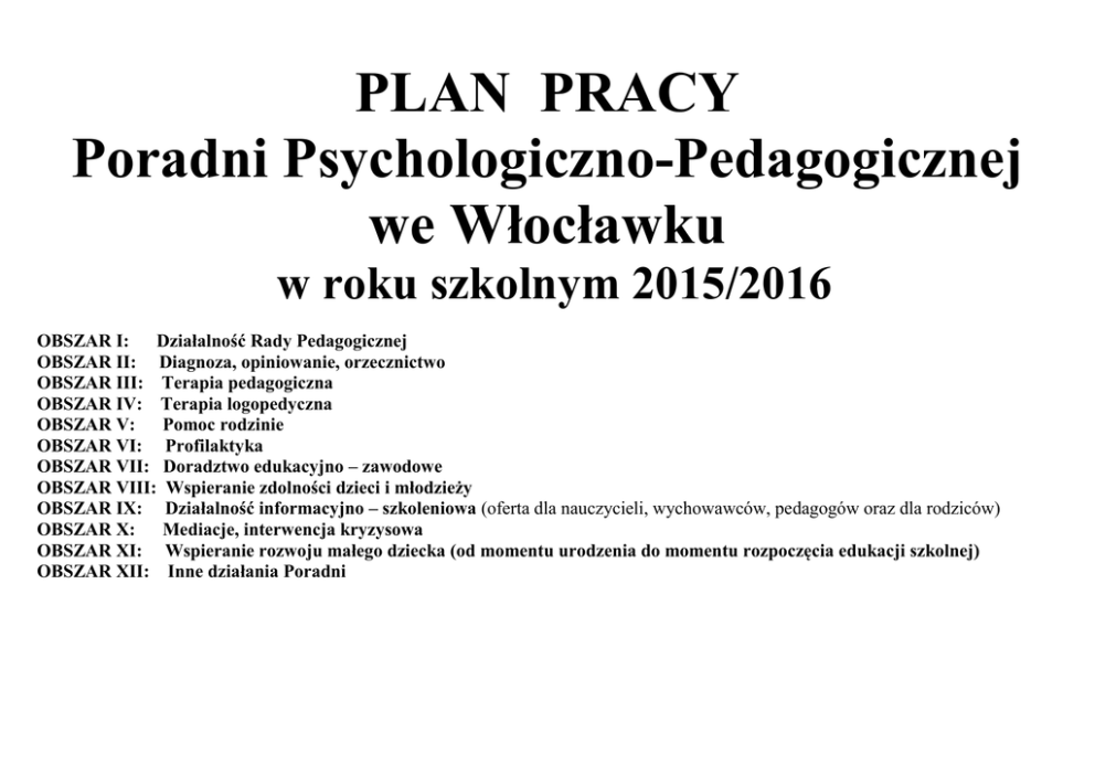 PLAN PRACY Poradni Psychologiczno-Pedagogicznej we Włocławku w roku szkolnym 2015/2016 OBSZAR I: Działalność Rady Pedagogicznej OBSZAR II: Diagnoza, opiniowanie, orzecznictwo OBSZAR III: Terapia pedagogiczna OBSZAR IV: Terapia logopedyczna OBSZAR V: Pomoc rodzinie OBSZAR VI: Profilaktyka OBSZAR VII: Doradztwo edukacyjno – zawodowe OBSZAR VIII: Wspieranie zdolności dzieci i młodzieży OBSZAR IX: Działalność informacyjno – szkoleniowa (oferta dla nauczycieli, wychowawców, pedagogów oraz dla rodziców) OBSZAR X: Mediacje, interwencja kryzysowa OBSZAR XI: Wspieranie rozwoju małego dziecka (od momentu urodzenia do momentu rozpoczęcia edukacji szkolnej) OBSZAR XII: Inne działania Poradni OBSZAR I: Działalność Rady Pedagogicznej Osoby realizujące Zadania 1. Posiedzenie Rady Pedagogicznej w sprawie organizacji pracy w roku szkolnym 2015/2016. Dyrektor Osoby, instytucje współpracujące Wicedyrektor 2. Analiza pracy Poradni Dyrektor Wicedyrektor 3. Udział w różnych formach doskonalenia zawodowego podnoszących kwalifikacje i umiejętności zawodowe Członkowie Rady pedagogicznej Dyrektor 4. Szkoleniowe Rady Pedagogiczne: - Zmiany w przepisach prawa oświatowego Dyrektor Termin 28.08.2015 11.09.2015 styczeń 2016 czerwiec 2016 Zgodnie z planem doskonalenia zawodowego W zależności od wprowadzanych zmian - Zespół stresu pourazowego i zespół ostrego stresu G.Cudna Dyrektor I sem. - Zaburzenia centralnego przetwarzania słuchowego M.Latecka Dyrektor II sem. OBSZAR II: Diagnoza, opiniowanie, orzecznictwo Zadania Osoby realizujące 1. Diagnoza dzieci z trudnościami edukacyjnymi w tym dzieci z zaburzeniami typu dyslektycznego. Pracownicy zgodnie przydziałem zadań na rok szkolny 2015/16 2. Diagnoza dzieci ze specyficznymi trudnościami w liczeniu - dyskalkulia I. Sałacka, M. Latecka T.Wojciechowska, I. Wojciechowska, J. Głuszkowska, M. Novaković, L. Włodarczyk, M. Żbikowska, D. Bukowska, E.Sobczak-Nęcka, J. Krysiak, I. Ryniec-Januszek A. Anczakowska, A.Sokołowska, M. Biesiacka, H.Łagodzińska, J.Kwiecińska, M.Napierała Osoby, instytucje Termin współpracujące Dyrekcje szkół, W zależności od pedagodzy nauczyciele, zgłoszeń lekarze j.w. j.w. 3. Diagnoza dzieci niewidomych i słabowidzących. I. Ryniec-Januszek, M.Lenartowska j.w. j.w. 4. Diagnoza dzieci niesłyszących i słabosłyszących. H. Łagodzińska, M. Novaković M. Biesiacka E. Jakubowska I. Ryniec-Januszek J. Krysiak, K. Szczepańska I. Kwiatkowska, M. Latecka A. Ziółkowska, I.Ryniec-Januszek I. Kwiatkowska,M. Kramkowska, I. Ryniec-Januszek, I. Pałucka I. Wojciechowska, A.Anczakowska j.w. j.w. j.w. j.w. j.w. j.w. j.w. j.w. j.w. j.w. psycholodzy j.w. j.w. I.Sałacka, psycholodzy j.w. M. Biesiacka j.w. 12. Przesiewowe badania słuchu na terenie Poradni M.Latecka oraz w wybranych przedszkolach. Badania audiometryczne i centralnego M.Novaković przetwarzania słuchowego j.w. W zależności od zgłoszeń W zależności od zgłoszeń 4 x tygodniowo zgodnie z planem tyg. 13. Przesiewowe badania wzroku M. Lenartowska j.w. 14. Diagnoza logopedyczna na potrzeby diagnozy trudności edukacyjnych J.Adamczyk, D.Bukowska j.w. J.Zygadlińska, A.Wilmańska, J.Zielińska, E.Gawłowska-Czyżewska, J.Głuszkowska, J. Kaczyńska 5. Diagnoza dzieci niepełnosprawnych intelektualnie 6. Diagnoza dzieci w zakresie wczesnego wspomagania rozwoju dziecka 7. Diagnoza dzieci z autyzmem 8. Diagnoza dzieci niepełnosprawnych (ruchowo, intelektualnie i niepełnosprawnościami sprzężonymi) 9. Diagnoza dzieci i młodzieży z zaburzeniami w sferze zachowania i emocji. 10. Diagnoza dzieci i młodzieży uzdolnionej poznawczo (ocena rozwoju intelektualnego i społeczno-emocjonalnego) 11. Diagnoza psychologiczna na potrzeby służby zdrowia 15. Wspomaganie szkół w zakresie udzielania zdiagnozowanym uczniom pomocy psychologiczno-pedagogicznej w macierzystych placówkach. D.Bukowska, M.Żbikowska, T.Wojciechowska, J.Krysiak, J.Głuszkowska Dyrektor i osoby diagnozujące W zależności od zgłoszeń W ramach codziennych dyżurów logop. wg. hormon.; w ramach diagnozy psych.-ped. Dyrekcje szkół, W zależności od pedagodzy nauczyciele. potrzeb 16. Opiniowanie 17. Działalność Zespołów Orzekających na podstawie Zarządzenia Nr 1 Dyrektora Poradni Psychologiczno-Pedagogicznej we Włocławku. Orzekanie: - o potrzebie kształcenia specjalnego, - o potrzebie zajęć rewalidacyjno-wychowawczych zespołowych lub indywidualnych, - o potrzebie indywidualnego obowiązkowego rocznego przygotowania przedszkolnego, - o potrzebie nauczania indywidualnego, - o potrzebie wczesnego wspomagania rozwoju dziecka. Członkowie zespołów ds. pom.uczniom z niepowodzeniami edukacyjnymi, opieki logop., doradztwa eduk.-zaw., wspier.zdolności dzieci i młodz. Przewodniczący zespołów orzekających Dyrektor, widedyrektor Cały rok Pozostali członkowie zespołów orzekających Posiedzenia zespołów w piątki dr MaciaśJonczykneurolog dziec. dr Piechocka – pediatra OBSZAR III: Terapia pedagogiczna Zadania 1. Terapia pedagogiczna dzieci ze sprzężonymi deficytami i nasilonymi trudnościami w czytaniu i pisaniu 2. Terapia pedagogiczna dzieci z ryzyka dysleksji 3. Terapia małego dziecka 4. Treningi ortograficzne dla dzieci i młodzieży Osoby realizujące J. Głuszkowska, T.Wojciechowska, I.Wojciechowska, E. Nęcka, M. Żbikowska, I. Sałacka, M.Latecka, L.Włodarczyk, H.Łagodzińska, A.Ziółkowska, T.Borowiak, M.Novaković, E.Jakubowska, M. Latecka inni pedagodzy E.Nęcka, Ter.Wojciechowska, M.Latecka, A.Ziółkowska J. Głuszkowska, T.Wojciechowska E. Nęcka, I.Wojciechowska, M. Żbikowska, I. Sałacka, L.Włodarczyk, E.Jakubowska H.Łagodzińska, A.Ziółkowska, M.Novaković Osoby, instytucje współpracujące Rodzice Termin od paźdz.2015 do czerw.2016 j.w. j.w. j.w. j.w. j.w. j.w. 5. Realizacja programu edukacyjno-terapeutycznego „Ortograffiti” (dla uczniów kl. IV, V, VI, gimnazjów, szkół ponadgimn.) 6. Terapia dzieci z autyzmem J.