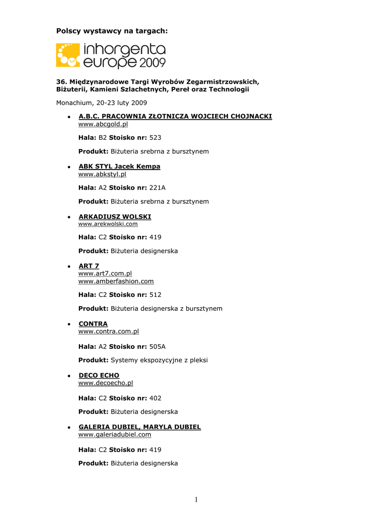 Polscy wystawcy na targach: 36. Międzynarodowe Targi Wyrobów Zegarmistrzowskich, Biżuterii, Kamieni Szlachetnych, Pereł oraz Technologii Monachium, 20-23 luty 2009 A.B.C. PRACOWNIA ZŁOTNICZA WOJCIECH CHOJNACKI www.abcgold.pl Hala: B2 Stoisko nr: 523 Produkt: Biżuteria srebrna z bursztynem ABK STYL Jacek Kempa www.abkstyl.pl Hala: A2 Stoisko nr: 221A Produkt: Biżuteria srebrna z bursztynem ARKADIUSZ WOLSKI www.arekwolski.com Hala: C2 Stoisko nr: 419 Produkt: Biżuteria designerska ART 7 www.art7.com.pl www.amberfashion.com Hala: C2 Stoisko nr: 512 Produkt: Biżuteria designerska z bursztynem CONTRA www.contra.com.pl Hala: A2 Stoisko nr: 505A Produkt: Systemy ekspozycyjne z pleksi DECO ECHO www.decoecho.pl Hala: C2 Stoisko nr: 402 Produkt: Biżuteria designerska GALERIA DUBIEL, MARYLA DUBIEL www.galeriadubiel.com Hala: C2 Stoisko nr: 419 Produkt: Biżuteria designerska 1 GLITTER & EVA STONE www.glitter.com.pl Hala: C2 Stoisko nr: 530 Produkt: Biżuteria designerska/Biżuteria z bursztynem GOLD-REX www.goldrex.wyspa.biz Hala: C1 Stoisko nr: 235 Produkt: Biżuteria z minerałami, kamieniami półszlachetnymi oraz bursztynem JUBILEX www.jubilex.com.pl Hala: A2 Stoisko nr: 226 Produkt: Biżuteria srebrna z bursztynem MARCIN BOGUSŁAW www.marcinboguslaw.pl UCZESTNIK PROGRAMU BRAND NEW-NEW BRAND NA TARGACH INHORGENTA EUROPE 2009 Hala: C2 Stoisko nr: 326 stanowisko 19 Produkt: Biżuteria designerska MARCIN ZAREMSKI www.zaremski.pl Hala: C2 Stoisko nr: 318/417 Produkt: Biżuteria designerska MI-FORM Przedsiębiorstwo Wielobranżowe Hala: B2 Stoisko nr: 409 Produkt: Cukiernice ze srebra oraz ze srebra i bursztynu Mi.Sta www.mi-sta.pl Hala: A2 Stoisko nr: 331 Produkt: Biżuteria srebrna OSTROWSKI -DESIGN UCZESTNIK PROGRAMU BRAND NEW-NEW BRAND NA TARGACH INHORGENTA EUROPE 2008 www.ostrowski-design.pl Hala: C2 Stoisko nr: 526 Produkt: Biżuteria designerska z bursztynem 2 P.A.T. Bugała sp.j. www.pat.net.pl Hala: A2 Stoisko nr: 203 Produkt: Opakowania & oferta techniczna Power & Amber www.poweramber.pl Hala: C2 Stoisko nr: 131 Produkt: Biżuteria designerska z bursztynem PZ STELMACH Hala: B2 Stoisko nr: 405 Produkt: Obrączki ślubne RELIEF KAMEE ELŻBIETA & SŁAWOMIR CHMIELEWSCY www.chmiewellery.pl Hala: C2 Stoisko nr: 131 Produkt: Biżuteria designerska, kamee RODENT www.rodent.pl Hala: A2 Stoisko nr: 407 Produkt: oferta techniczna: maszyny i narzędzia S & A Bursztynowa Biżuteria (reprezentowana na stoisku firmy austriackiej Zaremba Design) www.s-a.pl Hala: B2 Stoisko nr: 138 Produkt: Biżuteria z bursztynem Stowarzyszenia i instytucje związane z polską branżą jubilerskozegarmistrzowską na targach inhorgenta europe 2009: AKADEMIA SZTUK PIĘKNYCH im. WŁ. STRZEMIŃSKIEGO w ŁODZI www.asp.lodz.pl Hala: C2 Stoisko nr: 648 Forum Innovation Schulen – wystawa prac studentów Łódzkiej ASP GALERIA SZTUKI W LEGNICY www.galeria.legnica.pl Hala: C2 Stoisko nr: 536 Forum Innovation Schulen – wystawa prac wyróżnionych w Międzynarodowym Konkursie Sztuki Złotniczej Exclusive 3 GALERIA YES www.yes.com.pl Hala: C2 Stoisko nr: 531 Forum Innovation Schulen – wystawa współczesnej sztuki złotniczej ze zbiorów Marii Magdy Kwiatkiewicz LETNIE TARGI TRENDÓW JUBILERSKICH I ZEGARKOWYCH JUBINALE Organizator: Polska Biżuteria www.jubinale.com Hala: EW (Hala wejściowa) Stoisko nr: 303 MIĘDZYNARODOWE TARGI BURSZTYNU, BIŻUTERII I KAMIENI JUBILERSKICH AMBERIF Organizator: Międzynarodowe Targi Gdańskie www.amberif.pl Hala: EW (Hala wejściowa) Stoisko nr: 207 POLSKA BIŻUTERIA www.polskabizuteria.pl www.pb.info.pl Hala: EW (Hala wejściowa) Stoisko nr: 202 Produkt: Katalog polskiej branży jubilersko-zegarmistrzowskiej, portal jubilerski www.pb.info.pl STOWARZYSZENIE TWÓRCÓW FORM ZŁOTNICZYCH www.stfz.art.pl Hala: C2 Stoisko nr: 637 Forum Innovation Schulen – wystawa prac konkursowych członków STFZ TARGI BIŻUTERII I ZEGARKÓW ZŁOTO SREBRO CZAS Organizator: Pracownia Sztuk Plastycznych/ Międzynarodowe Centrum Targowe www.zlotosrebroczas.com Hala: EW (Hala wejściowa) Stoisko nr: 209 Stan zgłoszeń: 1.02.2009 (kolejność alfabetyczna) Kontakt do Polskiego Przedstawicielstwa Targów inhorgenta europe: Biuro Targów Monachijskich w Polsce ul. Biała 4, 00-895 Warszawa Tel. 022-890 90 53, Faks: 022-624 94 78 e-mail: [email protected] Osoba do kontaktu: Joanna Biernacka-Goworek (Project Manager ds. targów inhorgenta) 4