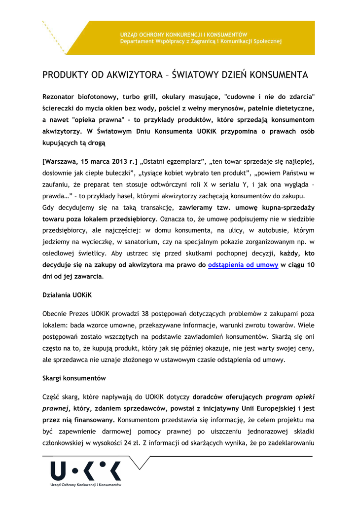 PRODUKTY OD AKWIZYTORA – ŚWIATOWY DZIEŃ KONSUMENTA Rezonator biofotonowy, turbo grill, okulary masujące, "cudowne i nie do zdarcia" ściereczki do mycia okien bez wody, pościel z wełny merynosów, patelnie dietetyczne, a nawet "opieka prawna" - to przykłady produktów, które sprzedają konsumentom akwizytorzy. W Światowym Dniu Konsumenta UOKiK przypomina o prawach osób kupujących tą drogą [Warszawa, 15 marca 2013 r.] „Ostatni egzemplarz”, „ten towar sprzedaje się najlepiej, dosłownie jak ciepłe bułeczki”, „tysiące kobiet wybrało ten produkt”, „powiem Państwu w zaufaniu, że preparat ten stosuje odtwórczyni roli X w serialu Y, i jak ona wygląda – prawda…” – to przykłady haseł, którymi akwizytorzy zachęcają konsumentów do zakupu. Gdy decydujemy się na taką transakcję, zawieramy tzw. umowę kupna-sprzedaży towaru poza lokalem przedsiębiorcy. Oznacza to, że umowę podpisujemy nie w siedzibie przedsiębiorcy, ale najczęściej: w domu konsumenta, na ulicy, w autobusie, którym jedziemy na wycieczkę, w sanatorium, czy na specjalnym pokazie zorganizowanym np. w osiedlowej świetlicy. Aby ustrzec się przed skutkami pochopnej decyzji, każdy, kto decyduje się na zakupy od akwizytora ma prawo do odstąpienia od umowy w ciągu 10 dni od jej zawarcia. Działania UOKiK Obecnie Prezes UOKiK prowadzi 38 postępowań dotyczących problemów z zakupami poza lokalem: bada wzorce umowne, przekazywane informacje, warunki zwrotu towarów. Wiele postępowań zostało wszczętych na podstawie zawiadomień konsumentów. Skarżą się oni często na to, że kupują produkt, który jak się później okazuje, nie jest warty swojej ceny, ale sprzedawca nie uznaje złożonego w ustawowym czasie odstąpienia od umowy. Skargi konsumentów Część skarg, które napływają do UOKiK dotyczy doradców oferujących program opieki prawnej, który, zdaniem sprzedawców, powstał z inicjatywny Unii Europejskiej i jest przez nią finansowany. Konsumentom przedstawia się informację, że celem projektu ma być zapewnienie darmowej pomocy prawnej po uiszczeniu jednorazowej składki członkowskiej w wysokości 24 zł. Z informacji od skarżących wynika, że po zadeklarowaniu członkowstwa otrzymują wezwania do zapłaty kwoty 99 zł. Prezes UOKiK prowadzi postępowanie wyjaśniające w sprawie praktyk przedsiębiorcy oraz zawiadomiła Prokuraturę Okręgową w Gdańsku o możliwości popełnienia przestępstwa. Skargi dotyczą także produktów. Wynika z nich, że często już po zakupie okazuje się, że konsumenci przepłacili za nabyty towar, niejednokrotnie nie jest im potrzebny, a kupując ulegli sprzedawcy, jakość budzi duże wątpliwości kupującego, a dodatkowo na zakup produktu zaciągnięto kredyt. Odstąpienie od umowy Tego typu kłopoty najczęściej spotykają starsze osoby, które są podatne na różne techniki wywierania wpływu. Należy pamiętać, że od umowy sprzedaży zawartej poza lokalem przedsiębiorstwa można odstąpić bez podania przyczyny. Aby to zrobić, należy złożyć stosowne oświadczenie sprzedawcy na piśmie w terminie dziesięciu dni kalendarzowych od zawarcia umowy. Do zachowania tego terminu wystarczy wysłanie oświadczenia przed jego upływem listem poleconym za potwierdzeniem odbioru. Odstąpienie od zawartej umowy jest również skuteczne wobec umowy kredytowej, z którego to kredytu jest wyłącznie finansowane nabycie towaru lub usługi wskazanej w umowie sprzedaży (tzw. kredyt wiązany). Konsumencie pamiętaj, że: • nie podejmuj decyzji pod wpływem impulsu. Większe jest wtedy ryzyko podjęcia nieracjonalnych wyborów co do warunków, na jakich zostaje zawarta umowa, nie mówiąc już o faktycznej potrzebie posiadania danego towaru natychmiast, • poczekaj z zakupem, daj sobie więcej czasu na zastanowienie, porozmawiaj z kimś bliskim, • ostateczną decyzję podejmij po sprawdzeniu towaru i porównaniu cen np. w internecie lub w sklepie, pamiętaj: jeżeli towar jest dostępny dziś, będzie dostępny także jutro, • jeżeli po zastanowieniu się nadal chcesz kupić produkt, zapytaj sprzedającego o termin najbliższej prezentacji, • 800 007 707 – pod tym bezpłatnym numerem telefonu udzielane są porady prawne. Wiele informacji o zakupach od akwizytora można znaleźć w poradniku UOKiK. W przypadku indywidualnego sporu z przedsiębiorcą konsumenci mogą zwrócić się o bezpłatną poradę do miejskiego lub powiatowego rzecznika konsumentów lub zadzwonić pod bezpłatny numer infolinii 800 007 707. Porady udzielane są także w oddziałach Federacji Konsumentów. Z bezpłatnej pomocy ekspertów można skorzystać także wysyłając pytania na adres [email protected], który obsługuje Stowarzyszenie Konsumentów Polskich. Dodatkowe informacje dla mediów: Małgorzata Cieloch, Rzecznik prasowy UOKiK Departament Współpracy z Zagranicą i Komunikacji Społecznej Pl. Powstańców Warszawy 1, 00-950 Warszawa Tel. 22 827 28 92, 55 60 314 Fax 22 826 11 86 E-mail: [email protected]