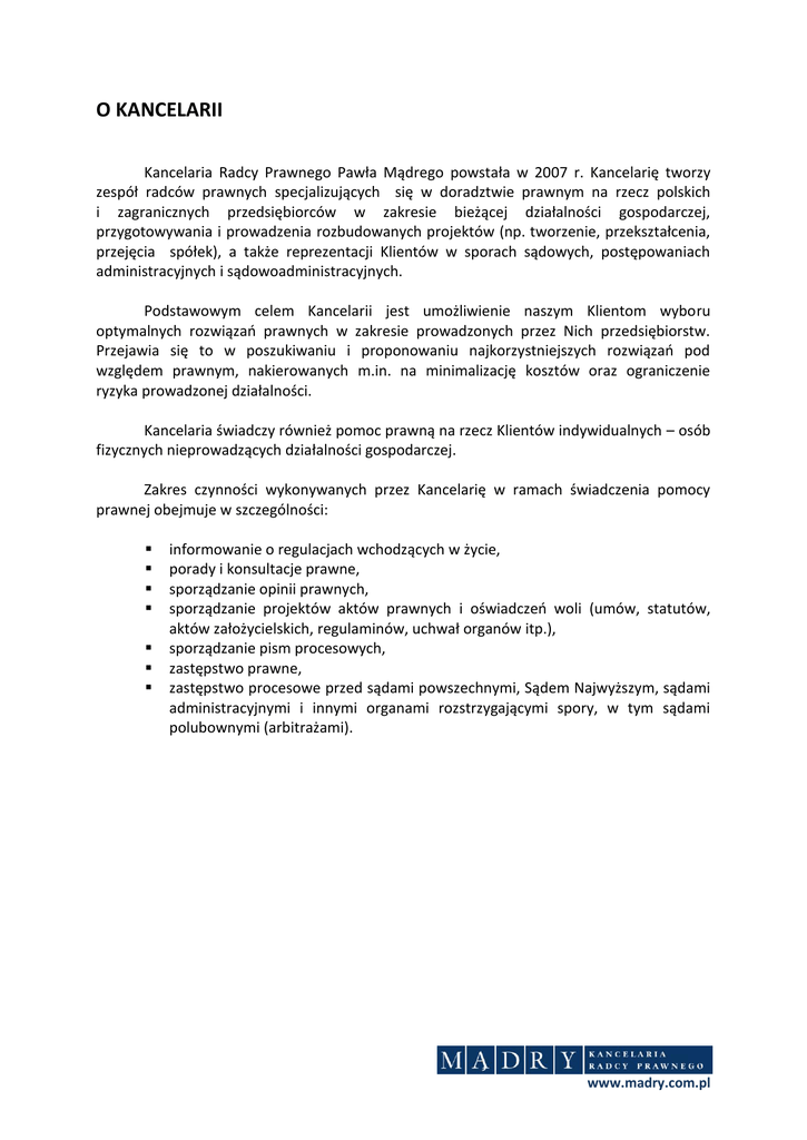 O KANCELARII Kancelaria Radcy Prawnego Pawła Mądrego powstała w 2007 r. Kancelarię tworzy zespół radców prawnych specjalizujących się w doradztwie prawnym na rzecz polskich i zagranicznych przedsiębiorców w zakresie bieżącej działalności gospodarczej, przygotowywania i prowadzenia rozbudowanych projektów (np. tworzenie, przekształcenia, przejęcia spółek), a także reprezentacji Klientów w sporach sądowych, postępowaniach administracyjnych i sądowoadministracyjnych. Podstawowym celem Kancelarii jest umożliwienie naszym Klientom wyboru optymalnych rozwiązao prawnych w zakresie prowadzonych przez Nich przedsiębiorstw. Przejawia się to w poszukiwaniu i proponowaniu najkorzystniejszych rozwiązao pod względem prawnym, nakierowanych m.in. na minimalizację kosztów oraz ograniczenie ryzyka prowadzonej działalności. Kancelaria świadczy również pomoc prawną na rzecz Klientów indywidualnych – osób fizycznych nieprowadzących działalności gospodarczej. Zakres czynności wykonywanych przez Kancelarię w ramach świadczenia pomocy prawnej obejmuje w szczególności: informowanie o regulacjach wchodzących w życie, porady i konsultacje prawne, sporządzanie opinii prawnych, sporządzanie projektów aktów prawnych i oświadczeo woli (umów, statutów, aktów założycielskich, regulaminów, uchwał organów itp.), sporządzanie pism procesowych, zastępstwo prawne, zastępstwo procesowe przed sądami powszechnymi, Sądem Najwyższym, sądami administracyjnymi i innymi organami rozstrzygającymi spory, w tym sądami polubownymi (arbitrażami). www.madry.com.pl PODSTAWOWY ZAKRES ŚWIADCZONEJ OBSŁUGI PRAWNEJ: WINDYKACJA NALEŻNOŚCI: - w postępowaniu przedsądowym, obejmującym negocjacje z dłużnikiem, zawarcie ugody, zawezwanie do próby ugodowej przed sądem, - w postępowaniu sądowym, - w postępowaniu zabezpieczającym, - w postępowaniu egzekucyjnym. DOCHODZENIE ODSZKODOWAO: - likwidacja szkód komunikacyjnych i innych w postępowaniu przesądowym, obejmująca zgłoszenie szkody, ewentualne zawarcie ugody pozasądowej, - dochodzenie odszkodowao w postępowaniu sądowym, w tym w postępowaniu pojednawczym. PRAWO KONTRAKTÓW I ZAMÓWIEO PUBLICZNYCH: - sporządzanie projektów umów, - udział w negocjacjach, - opiniowanie umów, - sporządzanie projektów zmian w umowach, - pomoc w zakresie rozwiązywania i wypowiadania umów, - pomoc w wyborze formy i przygotowaniu zabezpieczenia wykonania umowy, - doradztwo w sprawach z zakresu zamówieo publicznych. PRAWO OBROTU NIERUCHOMOŚCIAMI: - ustalenie stanu prawnego nieruchomości i sporządzanie raportów, - przygotowanie projektów umów, których przedmiotem są nieruchomości, - prawne zabezpieczenie transakcji, przedmiotem których są nieruchomości, - ustanawianie obciążeo nieruchomości, - projektowanie umów najmu, dzierżawy, służebności, timeshering’u oraz umów o tzw. prawo drogi, - pomoc prawna w zakresie inwestycji, przedmiotem których są nieruchomości. PRAWO KORPORACYJNE: - pomoc w wyborze odpowiedniej formy prowadzenia działalności gospodarczej, - sporządzanie umów spółek cywilnych, jawnych, komandytowych, komandytowo-akcyjnych, www.madry.com.pl - sporządzanie umów, aktów założycielskich i statutów spółek z ograniczoną odpowiedzialnością i akcyjnych, - sporządzanie statutów stowarzyszeo, fundacji, - sporządzanie projektów aktów organizacyjnych (regulaminów) organów spółek, stowarzyszeo, fundacji, - rejestracja spółek, stowarzyszeo, fundacji i innych podmiotów, w tym organizacji pożytku publicznego, - wpis do ewidencji działalności gospodarczej w przypadku spółek cywilnych, - protokołowanie posiedzeo organów spółek, stowarzyszeo i fundacji, - sporządzanie uchwał podejmowanych przez organy spółek, stowarzyszeo i fundacji, - due diligence (DD), - sporządzanie umów nabycia udziałów lub akcji w spółkach, - dokonywanie zabezpieczeo na udziałach lub akcjach, - przekształcenia, łączenia, podziały spółek, - likwidacja pomiotów. PRAWO DZIAŁALNOŚCI GOSPODARCZEJ: - pomoc w wyborze właściwej formy prowadzenia działalności gospodarczej, - pomoc w uzyskaniu koncesji, zezwoleo, wpisu do rejestru działalności regulowanej. PRAWO PRACY: - przygotowywanie umów o pracę, - przygotowywanie umów o zakazie konkurencji w trakcie i po ustaniu stosunku pracy, - przygotowywanie kontraktów (umów) menedżerskich, - projektowanie systemów tzw. akcji (udziałów) pracowniczych, - przygotowywanie projektów regulaminów pracy, regulaminów wynagradzania, - pomoc z zakresie rozwiązywania stosunków pracy, - przejęcia pracowników przez pomiędzy zakładami pracy na mocy porozumieo oraz poprzez przejęcie majątku. PRAWO UBEZPIECZEO GOSPODARCZYCH: - likwidacja szkód wyrządzonych w związku z prowadzeniem przedsiębiorstwa, w tym także z polisy OC. PRAWO PROCESOWE (SĄDOWE): - reprezentacja przed sądami powszechnymi (sądami rejonowymi, okręgowymi i apelacyjnymi), w sprawach cywilnych, gospodarczych oraz z zakresu prawa pracy, - reprezentacja przed Sądem Najwyższym, www.madry.com.pl - reprezentacja przed sądami administracyjnymi (wojewódzkie sądy administracyjne) oraz Naczelnym Sądem Administracyjnym, w postępowaniach ze skargi na decyzje organów administracji, - reprezentacja przed organami administracji publicznej. POZASĄDOWE ROZWIĄZYWANIE SPORÓW: - prowadzenie negocjacji, - projektowanie treści ugód, - projektowanie rozwiązao w zakresie zabezpieczenia wykonania ugód. ZASADY WSPÓŁPRACY Przyjęcie określonego modelu współpracy z Kancelarią zdeterminowane jest potrzebami Klienta. W ramach działalności Kancelarii oferujemy: stałą współpracę, w ramach której Kancelaria prowadzi obsługę prawną przedsiębiorców działających we wszelkich dopuszczalnych formach prawnych (działalnośd indywidualna, spółki), współpracę doraźną, w ramach której pozostajemy do dyspozycji Klienta, wykonując na jego rzecz jednora