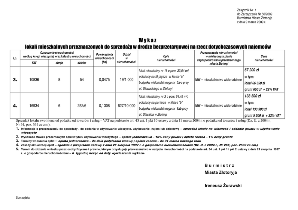 Załącznik Nr 1 do Zarządzenia Nr 56/2009 Burmistrza Miasta Złotoryja z dnia 9 marca 2009 r. Wykaz lokali mieszkalnych przeznaczonych do sprzedaży w drodze bezprzetargowej na rzecz dotychczasowych najemców Lp. Oznaczenie nieruchomości według księgi wieczystej oraz katastru nieruchomości KW obręb działka Powierzchnia nieruchomości [ha] Udział w nieruchomości Opis nieruchomości Przeznaczenie nieruchomości w miejscowym planie zagospodarowania przestrzennego miasta Złotoryi 67 200 zł lokal mieszkalny nr 11 o pow. 32,04 m², 3. 4. 10836 16934 8 6 54 252/6 0,0475 0,1308 19/1 000 627/10 000 położony na III piętrze w klatce “c” budynku wielorodzinnego nr 5a-c przy Cena nieruchomości MW – mieszkalnictwo wielorodzinne w tym: lokal 66 550 zł ul. Słowackiego w Złotoryi grunt 650 zł + 22% VAT lokal mieszkalny nr 3 o pow. 64,49 m², 138 500 zł położony na parterze w klatce “b” budynku wielorodzinnego nr 8ab przy MW – mieszkalnictwo wielorodzinne w tym: lokal 133 300 zł ul. Staszica w Złotoryi grunt 5 200 zł + 22% VAT Sprzedaż lokalu zwolniona od podatku od towarów i usług – VAT na podstawie art. 43 ust. 1 pkt 10 ustawy z dnia 11 marca 2004 r. o podatku od towarów i usług (Dz. U. z 2004 r., Nr 54, poz. 535 ze zm.). 1. Informacje o przeznaczeniu do sprzedaży , do oddania w użytkowanie wieczyste, użytkowanie, najem lub dzierżawę – sprzedaż lokalu na własność i oddanie gruntu w użytkowanie wieczyste 2. 3. 4. 5. Wysokość stawek procentowych opłat z tytułu użytkowania wieczystego – opłata jednorazowa – 15% ceny gruntu ; opłata roczna – 1% ceny gruntu Terminy wnoszenia opłat – opłata jednorazowa – do dnia podpisania umowy ; opłata roczna – do 31 marca każdego roku Zasady aktualizacji opłat – zgodnie z przepisami ustawy z dnia 21 sierpnia 1997 r. o gospodarce nieruchomościami (Dz. U. z 2004 r., Nr 261, poz. 2603 ze zm.) Termin do złożenia wniosku przez osoby fizyczne i prawne, którym przysługuje pierwszeństwo w nabyciu nieruchomości na podstawie art. 34 ust. 1 pkt 1 i pkt 2 ustawy z dnia 21 sierpnia 1997 r. o gospodarce nieruchomościami – 6 tygodni, licząc od daty wywieszenia wykazu. Burmistrz Miasta Złotoryja Ireneusz Żurawski Sporządziła: