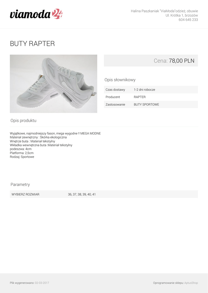 Halina Paszkaniak "ViaModa"odzież, obuwie Ul. Krótka 1, brzozów 604 645 233 BUTY RAPTER Cena: 78,00 PLN Opis słownikowy Czas dostawy 1-2 dni robocze Producent RAPTER Zastosowanie BUTY SPORTOWE Opis produktu Wyjątkowe, najmodniejszy fason, mega wygodne !! MEGA MODNE Materiał zewnętrzny : Skórka ekologiczna Wnętrze buta : Materiał tekstylny Wkładka wewnętrzna buta :Materiał tekstylny podeszwa: 4cm Platforma: 2,5cm Rodzaj: Sportowe Parametry WYBIERZ ROZMIAR Plik wygenerowano: 02-03-2017 36, 37, 38, 39, 40, 41 Oprogramowanie sklepu: AptusShop Halina Paszkaniak "ViaModa"odzież, obuwie Ul. Krótka 1, brzozów 604 645 233 Galeria Plik wygenerowano: 02-03-2017 Powered by TCPDF (www.tcpdf.org) Oprogramowanie sklepu: AptusShop