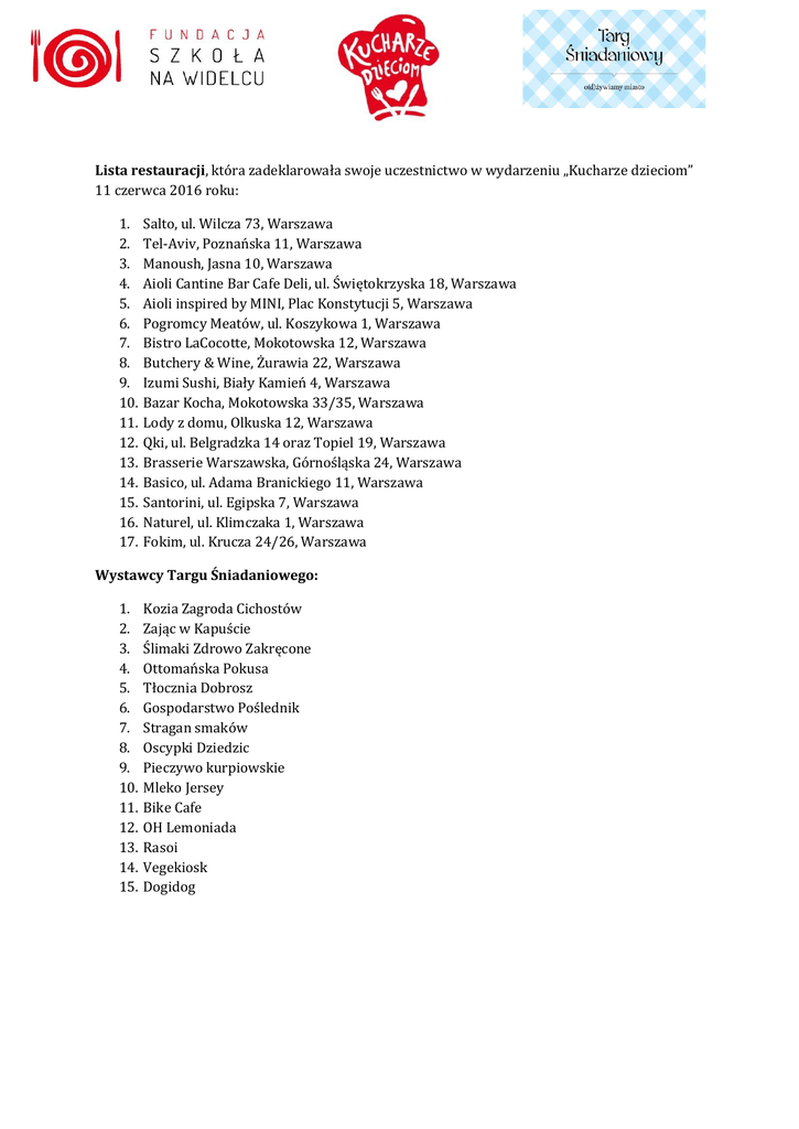 Lista restauracji, która zadeklarowała swoje uczestnictwo w wydarzeniu „Kucharze dzieciom” 11 czerwca 2016 roku: 1. 2. 3. 4. 5. 6. 7. 8. 9. 10. 11. 12. 13. 14. 15. 16. 17. Salto, ul. Wilcza 73, Warszawa Tel-Aviv, Poznańska 11, Warszawa Manoush, Jasna 10, Warszawa Aioli Cantine Bar Cafe Deli, ul. Świętokrzyska 18, Warszawa Aioli inspired by MINI, Plac Konstytucji 5, Warszawa Pogromcy Meatów, ul. Koszykowa 1, Warszawa Bistro LaCocotte, Mokotowska 12, Warszawa Butchery & Wine, Żurawia 22, Warszawa Izumi Sushi, Biały Kamień 4, Warszawa Bazar Kocha, Mokotowska 33/35, Warszawa Lody z domu, Olkuska 12, Warszawa Qki, ul. Belgradzka 14 oraz Topiel 19, Warszawa Brasserie Warszawska, Górnośląska 24, Warszawa Basico, ul. Adama Branickiego 11, Warszawa Santorini, ul. Egipska 7, Warszawa Naturel, ul. Klimczaka 1, Warszawa Fokim, ul. Krucza 24/26, Warszawa Wystawcy Targu Śniadaniowego: 1. 2. 3. 4. 5. 6. 7. 8. 9. 10. 11. 12. 13. 14. 15. Kozia Zagroda Cichostów Zając w Kapuście Ślimaki Zdrowo Zakręcone Ottomańska Pokusa Tłocznia Dobrosz Gospodarstwo Poślednik Stragan smaków Oscypki Dziedzic Pieczywo kurpiowskie Mleko Jersey Bike Cafe OH Lemoniada Rasoi Vegekiosk Dogidog