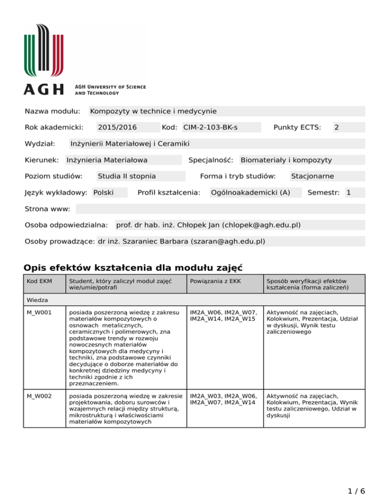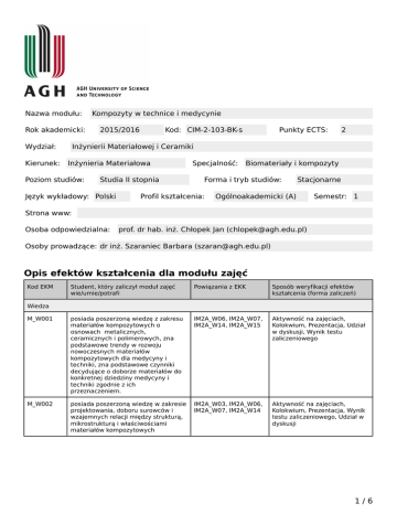 Nazwa modułu: Rok akademicki: Wydział: Kierunek: Kompozyty w technice i medycynie 2015/2016 Kod: CIM-2-103-BK-s Punkty ECTS: 2 Inżynierii Materiałowej i Ceramiki Inżynieria Materiałowa Poziom studiów: Studia II stopnia Język wykładowy: Polski Specjalność: Biomateriały i kompozyty Forma i tryb studiów: Profil kształcenia: Stacjonarne Ogólnoakademicki (A) Semestr: 1 Strona www: Osoba odpowiedzialna: prof. dr hab. inż. Chłopek Jan ([email protected]) Osoby prowadzące: dr inż. Szaraniec Barbara ([email protected]) Opis efektów kształcenia dla modułu zajęć Kod EKM Student, który zaliczył moduł zajęć wie/umie/potrafi Powiązania z EKK Sposób weryfikacji efektów kształcenia (forma zaliczeń) M_W001 posiada poszerzoną wiedzę z zakresu materiałów kompozytowych o osnowach metalicznych, ceramicznych i polimerowych, zna podstawowe trendy w rozwoju nowoczesnych materiałów kompozytowych dla medycyny i techniki, zna podstawowe czynniki decydujące o doborze materiałów do konkretnej dziedziny medycyny i techniki zgodnie z ich przeznaczeniem. IM2A_W06, IM2A_W07, IM2A_W14, IM2A_W15 Aktywność na zajęciach, Kolokwium, Prezentacja, Udział w dyskusji, Wynik testu zaliczeniowego M_W002 posiada poszerzoną wiedzę w zakresie projektowania, doboru surowców i wzajemnych relacji między strukturą, mikrostrukturą i właściwościami materiałów kompozytowych IM2A_W03, IM2A_W06, IM2A_W07, IM2A_W14 Aktywność na zajęciach, Kolokwium, Prezentacja, Wynik testu zaliczeniowego, Udział w dyskusji Wiedza 1/6 Karta modułu - Kompozyty w technice i medycynie M_W003 zna podstawowe uwarunkowania konstrukcyjno-materiałowe wyrobów kompozytowych stosowanych w chirurgii kostnej, w chirurgii miękkiej, neurochirurgii, kardiochirurgii, chirurgii naczyniowej, w zaopatrzeniu ortopedycznym i sprzęcie rehabilitacyjnym, w przemyśle samochodowym, w lotnictwie i w budownictwie. IM2A_W03, IM2A_W06, IM2A_W07 Aktywność na zajęciach, Kolokwium, Udział w dyskusji, Prezentacja, Wynik testu zaliczeniowego M_W004 posiada wiedzę na temat pozyskiwania i przygotowania projektów badawczych uczelnianoprzemysłowych oraz możliwości wdrożeń nowych rozwiązań materiałowych i technologicznych IM2A_W06, IM2A_W15 Aktywność na zajęciach, Kolokwium, Prezentacja, Udział w dyskusji, Wynik testu zaliczeniowego M_W005 rozumie znaczenie i potrzebę wdrażania zaawansowanych konstrukcji kompozytowych oraz współpracy na płaszczyźnie naukaprzemysł IM2A_K05 Aktywność na zajęciach, Kolokwium, Prezentacja, Udział w dyskusji, Wynik testu zaliczeniowego M_U001 potrafi wytypować i zaprojektować materiał kompozytowy dla określonej funkcji w medycynie i technice IM2A_U09, IM2A_U13 Aktywność na zajęciach, Kolokwium, Prezentacja, Udział w dyskusji, Wynik testu zaliczeniowego M_U002 potrafi łączyć zagadnienia dotyczące właściwości mechanicznych, cieplnych, elektrycznych, trybologicznych, magnetycznych i biologicznych z konkretnymi materiałami, uwzględniając zapotrzebowanie i dostępność surowców oraz technologie IM2A_U09, IM2A_U15, IM2A_U17 Aktywność na zajęciach, Kolokwium, Prezentacja, Udział w dyskusji, Wynik testu zaliczeniowego Umiejętności Kompetencje społeczne M_K001 ma świadomość zagrożeń wynikających z produkcji, stosowania i utylizacji materiałów kompozytowych IM2A_K01, IM2A_K03, IM2A_K06 Aktywność na zajęciach, Kolokwium, Prezentacja, Udział w dyskusji, Wynik testu zaliczeniowego M_K002 rozumie znaczenie i potrzebę wdrażania zaawansowanych konstrukcji kompozytowych oraz współpracy na płaszczyźnie naukaprzemysł IM2A_K05 Aktywność na zajęciach, Kolokwium, Prezentacja, Udział w dyskusji, Wynik testu zaliczeniowego Matryca efektów kształcenia w odniesieniu do form zajęć E-learning Inne Zajęcia warsztatowe Zajęcia terenowe Zajęcia praktyczne Zajęcia seminaryjne Konwersatori um Ćwiczenia projektowe Ćwiczenia laboratoryjne Forma zajęć Ćwiczenia audytoryjne Student, który zaliczył moduł zajęć wie/umie/potrafi Wykład Kod EKM Wiedza 2/6 Karta modułu - Kompozyty w technice i medycynie M_W001 posiada poszerzoną wiedzę z zakresu materiałów kompozytowych o osnowach metalicznych, ceramicznych i polimerowych, zna podstawowe trendy w rozwoju nowoczesnych materiałów kompozytowych dla medycyny i techniki, zna podstawowe czynniki decydujące o doborze materiałów do konkretnej dziedziny medycyny i techniki zgodnie z ich przeznaczeniem. + - - - - + - - - - - M_W002 posiada poszerzoną wiedzę w zakresie projektowania, doboru surowców i wzajemnych relacji między strukturą, mikrostrukturą i właściwościami materiałów kompozytowych + - - - - + - - - - - M_W003 zna podstawowe uwarunkowania konstrukcyjno-materiałowe wyrobów kompozytowych stosowanych w chirurgii kostnej, w chirurgii miękkiej, neurochirurgii, kardiochirurgii, chirurgii naczyniowej, w zaopatrzeniu ortopedycznym i sprzęcie rehabilitacyjnym, w przemyśle samochodowym, w lotnictwie i w budownictwie. + - - - - + - - - - - M_W004 posiada wiedzę na temat pozyskiwania i przygotowania projektów badawczych uczelniano-przemysłowych oraz możliwości wdrożeń nowych rozwiązań materiałowych i technologicznych + - - - - + - - - - - M_W005 rozumie znaczenie i potrzebę wdrażania zaawansowanych konstrukcji kompozytowych oraz współpracy na płaszczyźnie nauka-przemysł + - - - - + - - - - - potrafi wytypować i zaprojektować materiał kompozytowy dla określonej funkcji w medycynie i technice - - - - - + - - - - - Umiejętności M_U001 3/6 Karta modułu - Kompozyty w technice i medycynie M_U002 potrafi łączyć zagadnienia dotyczące właściwości mechanicznych, cieplnych, elektrycznych, trybologicznych, magnetycznych i biologicznych z konkretnymi materiałami, uwzględniając zapotrzebowanie i dostępność surowców oraz technologie - - - - - + - - - - - Kompetencje społeczne M_K001 ma świadomość zagrożeń wynikających z produkcji, stosowania i utylizacji m