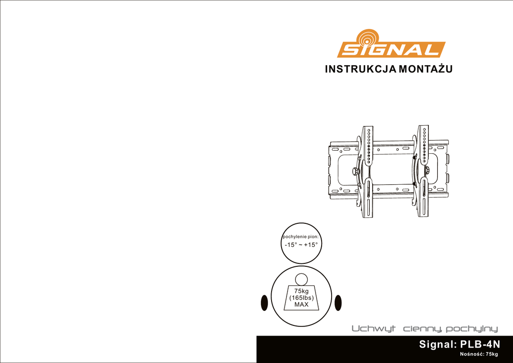 INSTRUKCJA MONTAŻU pochylenie pion: -15° ~ +15° 75kg (165lbs) MAX Uchwyt ścienny, pochylny Signal: PLB-4N Nośność: 75kg UWAGA: Przed przystąpieniem do montażu uchwytu, należy zapoznać się z instrukcją. Lista komponentów Ważne: Upewnij się, że w opakowaniu znajdują się wszystkie wymienione elementy. W przypadku ich braku lub uszkodzenia należy skontaktować się z dystrybutorem. UWAGA • Przed przystąpieniem do montażu uchwytu należy dokładni zapoznać się z niniejszą instrukcją. W przypadku jakichkolwiek wątpliwości lub spostrzeżeń dotyczących instalacji produktu należy skontaktować się z lokalnym dystrybutorem uchwytów Signal. • Należy przestrzegać zaleceń producenta odnośnie wymaganej odległości od ściany. W przeciwnym wypadku można doprowadzić do uszkodzeń telewizora bądź uchwytu. Lewy wspornik (x1) B Uchwyt ścienny (x1) A Prawy wspornik (x1) C • Montaż uchwytu powinien zostać wykonany przez osobę upoważnioną. • Nale ży się upewnić, że ściana nośna wytrzyma obciążenie uchwytu z zamontowanym do niego urządzeniem. Opakowanie M • Nigdy nie przekraczaj dopuszczalnego obci ążenia uchwytu. • Podczas monta żu zawsze używaj pomocy drugiej osoby. Szczególnie podczas podnoszenia i ustawiania urządzenia. M4x14 (x4) M-A M5x14 (x4) M-B M6x14 (x4) M-C • Śruby powinny być odpowiednio dokręcone. Zbyt mocne dokręcenie może spowodować ich uszkodzenie lub osłabienie. M8x15 (x4) M-D • Produkt przeznaczony jest do u żytku wewnętrznego. Montaż uchwytów w środowisku zewnętrznym może doprowadzić do jego uszkodzenia. podkładka (x4) Śrubokręt 5mm (x1) M-F M-E Opakowanie W ST6.3X55 śruba (x6) Kołek rozporowy (x6) ø6.5xø24 podkładka r (x6) W-A W-B W-C Wymagane narzędzia •Śrubokręt gwiazdkowy (o długości minimum 200mm) •Klucz M6 •Wiertarka z wiertłami •Marker •Młotek 1 2 1a • Przyłóż do ściany uchwyt ścienny i zaznacz markerem 6 punktów wskazujących miejsce mocowań. Cztery z nich powinny znajdować się w górnej części uchwytu, dwa w dolnej. • Używając wiertła do betonu o średnicy 10 mm nawierć otwory o głębokości przynajmniej 60 mm. W każdym otworze umieść kołek rozporowy (W-B). Zamontuj uchwyt ścienny używając 6 śrub (W-A) oraz podkładek (W-C). MONTAŻ DO ŚCIANY DREWNIANEJ: UWAGA W-B • Należy się upewnić, że ściana nośna wytrzyma obciążenie uchwytu wraz z zamontowanym urządzeniem. • Śruby powinny zostać odpowiednio dokręcone. Zbyt mocne dokręcenie śrub może doprowadzić do ich uszkodzenia lub osłabienia. • Zestaw narzędzi pozwala na zamontowanie uchwytu do ściany gipsowo-kartonowej lub drewnianej. W przypadku innej sytuacji montażowej, instalator jest odpowiedzialny za dostarczenie niezbędnych narzędzi instalacyjnych. W-A W-C • Przed rozpoczęciem montażu należy zlokalizować wzmocnienia ściany. • Przyłóż do ściany uchwyt ścienny i zaznacz markerem cztery punkty wiercenia otworów. Śruby nie powinny być mocowane na wzmocnieniach ściany. • Używając wiertła o średnicy 3 mm nawierć otwory o głębokości 30 mm. Przymocuj uchwyt ścienny używając czterech śrub (W-A) i podkładek (W-C) w sposób pokazany na obrazku 1.1. Stud W-A fig. 1.2 2 fig. 1.3 Montaż wsporników • Wsporniki należy zamontować z tyłu telewizora. W tym celu telewizor należy położyć na płaskiej powierzchni, ekranem w dół. W celu uniknięcia zarysowania ekranu umieść pod telewizorem miękką tkaninę. • Ustaw wsporniki z tyłu telewizora w sposób pokazany na obrazku 2.1, wyrównaj poziom otworów w telewizorze i wspornikach. • Zamontuj wsporniki do telewizora używając odpowiednich śrub I podkładek pokazanych na obrazku 2.2. W-C Zachowaj takie same odległości fig. 1.1 1b Montaż do ściany z cegły lub betonu: UWAGA • Nie należy wiercić otworów w zaprawie murarskiej. Śruby powinny być mocowane minimum 1 cm od krawędzi bloku. Do wykonania otworów zaleca się użycie wiertarki elektrycznej na wolnych obrotach. Nie jest zalecane stosowanie wiertarki udarowej. • Należy się upewnić, że ściana nośna wytrzyma obciążenie uchwytu wraz z zamontowanym urządzeniem. Zachowaj takie same odległości fig. 2.1 3 4 • Montaż wsporników do telewizora należy rozpocząć od przykręcenia najkrótszych śrub z podkładkami w sposób pokazany na obrazku 2.2. • Śruby powinny być dokręcone minimum trzema pełnymi obrotami, • Jeżeli długość śruby nie pozwala na dokręcenie jej trzema pełnymi obrotami należy dobrać odpowiednio dłuższą śrubę. Nie dokręcaj śrub z nadmierną siłą. Powtórz czynność dla pozostałych mocowań. 3 2 Ustawianie kąta pochylenia Do ustawienia kąta pochylenia należy użyć pokręteł umieszczonych na wspornikach. Kąt nachylenia można ustawiać w zakresie -15°… 15°, w sposób pokazany na obrazku 3.2. Ściana Ściana M-E M-A/M-B/M-C/M-D Pokrętło fig. 2.2 fig. 3.2 Montaż telewizora na uchwycie ściennym 3 1 UWAGA: Do montażu telewizora potrzebne są przynajmniej dwie osoby. • Zahacz wsporniki z telewizorem na górnej części uchwytu ściennego w sposób pokazany na obrazku 3.1. • Dokręć śruby zabezpieczające umieszczone na dole wsporników. Ważne: Przed puszczeniem telewizora upewnij się, że został prawidłowo zamontowany. Ściana Ściana Użytkowanie Po zamontowaniu telewizora z odpowiednim kątem nachylenia należy jeszcze raz sprawdzić poprawność montażu. Aby zapewnić stabilną pozycję uchwytu należy okresowo, minimum co dwa miesiące, sprawdzać czy nie poluzowały się śruby i elementy ruchome. W przypadku wątpliwości dotyczących montażu uchwytu należy skontaktować się z lokalnym dystrybutorem uchwytów marki Signal. Ściana Śruby zabezpieczające Śruby zabezpieczające M-F fig. 3.1 5 6