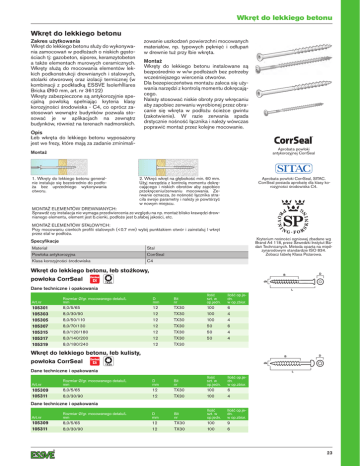 Wkręt do lekkiego betonu Wkręt do lekkiego betonu zowanie uszkodzeń powierzchni mocowanych materiałów, np. typowych pęknięć i odłupań w drewnie tuż przy łbie wkręta. Zakres użytkowania Wkręt do lekkiego betonu służy do wykonywania zamocowań w podłożach o niskich gęstościach tj: gazobeton, siporex, keramzytobeton a także elementach murowych ceramicznych. Wkręty służą do mocowania elementów lekkich podkonstrukcji drewnianych i stalowych, stolarki otworowej oraz izolacji termicznej (w kombinacji z podkładką ESSVE Isolerhĺllares Bricka Ø90 mm, art. nr 36122) Wkręty zabezpieczone są antykorozyjnie specjalną powłoką spełniając kryteria klasy korozyjności środowiska - C4, co oprócz zastosowań wewnątrz budynków pozwala stosować je w aplikacjach na zewnątrz budynków, również na terenach nadmorskich. Montaż Wkręty do lekkiego betonu instalowane są bezpośrednio w w/w podłożach bez potrzeby wcześniejszego wiercenia otworów. Dla bezepieczeństwa montażu zaleca się używania narzędzi z kontrolą momentu dokręcającego. Należy stosować niskie obroty przy wkręcaniu aby zapobiec zerwaniu wyrobionej przez obracanie się wkręta w podłożu ścieżce gwintu (zakotwienie). W razie zerwania spada drstycznie nośność łącznika i należy wówczas poprawić montaż przez kolejne mocowanie. Opis Łeb wkręta do lekkiego betonu wyposażony jest we frezy, które mają za zadanie zminimaliAprobata powłoki antykorozyjnej CorrSeal Montaż 1. Wkręty do lekkiego betonu generalnie instaluje się bezośrednio do podłoża bez uprzedniego wykonywania otworu. 2. Wkręć wkręt na głębokość min. 60 mm. Użyj narzędzia z kontrolą momentu dokręcającego i niskich obrotów aby zapobiec przekręceniu/zerwaniu mocowania. Zerwanie oznacza, że nośność łącznika straciła swoje parametry i należy je powtórzyć w nowym miejscu. Aprobata powłoki CorrSeal, SITAC. CorrSeal posiada aprobatę dla klasy korozyjności środowiska C4. MONTAŻ ELEMENTÓW DREWNIANYCH: Sprawdź czy instalacja nie wymaga przedwiercenia ze względu na np. montaż blisko krawędzi drewnianego elementu, element jest b.cienki, podłoże jest b.słabej jakości, etc. MONTAŻ ELEMENTÓW STALOWYCH: Przy mocowaniu cienkich profilii stalowych (<0.7 mm) wybij punktakiem otwór i zainstaluj l wkręt przez stal w podłożu. Kryterium nośności ogniowej zbadane wg Brand A4 118, przez Szwedzki Instytut Badań Technicznych. Metoda oparta na międzynarodowym standardzie ISO 834. Zobacz tabelę Klasa Pożarowa. Specyfikacje Materiał Stal Powłoka antykorozyjna CorrSeal Klasa korozyjności środowiska C4 Wkręt do lekkiego betonu, łeb stożkowy, powłoka CorrSeal C4 dk Dane techniczne i opakowania L Art.nr Rozmiar Ø/gr. mocowanego detalu/L mm D mm Bit nr 105301 105303 105305 105307 105315 105317 105319 8,0/5/65 8,0/30/90 8,0/50/110 8,0/70/130 8,0/120/180 8,0/140/200 8,0/180/240 12 12 12 12 12 12 12 TX30 TX30 TX30 TX30 TX30 TX30 TX30 IloĞü szt. w op.jedn. IloĞü op.jedn. w op.zbior. 100 100 100 50 50 50 6 4 4 6 4 4 Wkręt do lekkiego betonu, łeb kulisty, powłoka CorrSeal D B CorrSeal D B CorrSeal C4 dk Dane techniczne i opakowania L Art.nr Rozmiar Ø/gr. mocowanego detalu/L mm D mm Bit nr IloĞü szt. w op.jedn. IloĞü op.jedn. w op.zbior. 105309 105311 8,0/5/65 8,0/30/90 12 12 TX30 TX30 100 100 6 4 Art.nr Rozmiar Ø/gr. mocowanego detalu/L mm D mm Bit nr IloĞü szt. w op.jedn. IloĞü op.jedn. w op.zbior. 105309 105311 8,0/5/65 8,0/30/90 12 12 TX30 TX30 100 100 9 6 Dane techniczne i opakowania 23