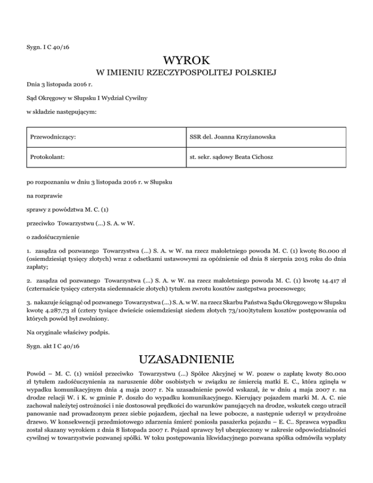 Sygn. I C 40/16 WYROK W IMIENIU RZECZYPOSPOLITEJ POLSKIEJ Dnia 3 listopada 2016 r. Sąd Okręgowy w Słupsku I Wydział Cywilny w składzie następującym: Przewodniczący: SSR del. Joanna Krzyżanowska Protokolant: st. sekr. sądowy Beata Cichosz po rozpoznaniu w dniu 3 listopada 2016 r. w Słupsku na rozprawie sprawy z powództwa M. C. (1) przeciwko Towarzystwu (...) S. A. w W. o zadośćuczynienie 1. zasądza od pozwanego Towarzystwa (...) S. A. w W. na rzecz małoletniego powoda M. C. (1) kwotę 80.000 zł (osiemdziesiąt tysięcy złotych) wraz z odsetkami ustawowymi za opóźnienie od dnia 8 sierpnia 2015 roku do dnia zapłaty; 2. zasądza od pozwanego Towarzystwa (...) S. A. w W. na rzecz małoletniego powoda M. C. (1) kwotę 14.417 zł (czternaście tysięcy czterysta siedemnaście złotych) tytułem zwrotu kosztów zastępstwa procesowego; 3. nakazuje ściągnąć od pozwanego Towarzystwa (...) S. A. w W. na rzecz Skarbu Państwa Sądu Okręgowego w Słupsku kwotę 4.287,73 zł (cztery tysiące dwieście osiemdziesiąt siedem złotych 73/100)tytułem kosztów postępowania od których powód był zwolniony. Na oryginale właściwy podpis. Sygn. akt I C 40/16 UZASADNIENIE Powód – M. C. (1) wniósł przeciwko Towarzystwu (...) Spółce Akcyjnej w W. pozew o zapłatę kwoty 80.000 zł tytułem zadośćuczynienia za naruszenie dóbr osobistych w związku ze śmiercią matki E. C., która zginęła w wypadku komunikacyjnym dnia 4 maja 2007 r. Na uzasadnienie powód wskazał, że w dniu 4 maja 2007 r. na drodze relacji W. i K. w gminie P. doszło do wypadku komunikacyjnego. Kierujący pojazdem marki M. A. C. nie zachował należytej ostrożności i nie dostosował prędkości do warunków panujących na drodze, wskutek czego utracił panowanie nad prowadzonym przez siebie pojazdem, zjechał na lewe pobocze, a następnie uderzył w przydrożne drzewo. W konsekwencji przedmiotowego zdarzenia śmierć poniosła pasażerka pojazdu – E. C.. Sprawca wypadku został skazany wyrokiem z dnia 8 listopada 2007 r. Pojazd sprawcy był ubezpieczony w zakresie odpowiedzialności cywilnej w towarzystwie pozwanej spółki. W toku postępowania likwidacyjnego pozwana spółka odmówiła wypłaty zadośćuczynienia. Powód wskazał, że tragiczna śmierć matki doprowadziła do naruszenia dóbr osobistych powoda w postaci prawa do niezakłóconego życia rodzinnego obejmującego szeroko rozumiane więzi pomiędzy członkami rodziny. Świadomość sieroctwa w tak młodym wieku niewątpliwie zwiększyła poczucie krzywdy moralnej powoda. Małoletniego łączyła z matką bardzo silna więź emocjonalna. Po tragicznej śmierci matki powód był niespokojny, płaczliwy, a w nocy budził się wołając mamę. Pojawiły się u niego koszmary senne i moczenie nocne. Obecnie powód jest wycofany z kontaktów międzyludzkich, nie przywiązuje się do otoczenia, Co więcej – jest w dużej mierze niesamodzielny, zaś jego zachowanie charakteryzują wybuchy emocji oraz agresja. Powód pozostaje pod stałą opieką pedagoga szkolnego i psychologa. Śmierć matki wywołała w nim poczucie krzywdy, żalu, smutku. Powód odczuwał i będzie odczuwać brak matki na każdym etapie swojego życia. Nie będzie ona bowiem obecna w ważnych dla niego wydarzeniach życiowych, został pozbawiony zwrócenia się do niej z problemami oraz wątpliwościami. Powód czuje się także gorszy od rówieśników, a obchody Dnia Matki zamiast spędzać w zaciszu domowego ogniska powód spędza składając na grobie matki kwiaty i znicze. Wg powoda w niniejszej sprawie rozmiar cierpienia strony powodowej był i jest wyjątkowo duży, a powód nie pogodził się z odejściem matki zaistniałych, tak bardzo niespodziewanych okolicznościach. Pozwany - Towarzystwo (...) Spółka Akcyjna w W. wniósł o oddalenie powództwa w całości. W pierwszej kolejności podniósł, że instytucja zadośćuczynienia za śmierć osoby bliskiej do dnia wejścia w życie art. 446 § 4 kc w polskim systemie prawnym nie istniała, a zatem nie mogła być podstawą zasądzania na tej podstawie zadośćuczynienia. W związku z powyższym działanie polegające na dochodzeniu zadośćuczynienia z tytułu śmierci osoby bliskiej stanowi działanie contra legem oraz rażące obejście prawa. Sam ustawodawca uznał brak instytucji zadośćuczynienia za śmierć osoby bliskiej za poważną lukę w polskim prawie w związku z czym dokonał wspomnianej nowelizacji kodeksu cywilnego. Okoliczność ta zdaniem pozwanego dobitnie wskazuje, że do czasu jednak wprowadzenia § 4 art. 446 kc ustawodawca nie przewidywał możliwości dochodzenia zadośćuczynienia za śmierć osoby bliskiej, gdyż w przeciwnym razie nowelizacja byłaby zbędna. Rzeczony przepis został wprowadzony do kodeksu cywilnego ustawą z dnia 30 maja 2008 r., a wszedł w życie 3 sierpnia 2008 r. i może być stosowany do zdarzeń mających miejsce po jego wejściu w życie. Przedmiotowy wypadek miał miejsce 4 maja 2007 r., a zatem przed wejściem w życie owej nowelizacji, tym samym roszczenie powoda dotyczące zadośćuczynienia jest bezpodstawne. Pozwany powołał w swojej argumentacji szereg orzeczeń z których wynika, że nie każdy uszczerbek niemajątkowy, nawet w postaci zerwania więzi rodzinnych na skutek śmierci osoby bliskiej, może być uznany za naruszenie dobra osobistego skutkującego możliwością zastosowania art. 448 kc. W drugiej kolejności pozwany podniósł, że zakład ubezpieczeń nie jest zobowiązany do naprawienia szkody powstałej wskutek naruszenia dóbr osobistych. Powołał się w tym zakresie na art. 34 ustawy o ubezpieczeniach obowiązkowych (…), z którego wynika, że z ubezpieczenia OC przysługuje odszkodowanie jeżeli posiadacz lub kierujący są obowiązani do odszkodowania za wyrządzoną w związku z ruchem tego pojazdu szkodę, której następstwem jest śmierć, uszkodzenia ciała, rozstrój zdrowia, bądź też utrata, zniszczenie lub uszkodzen