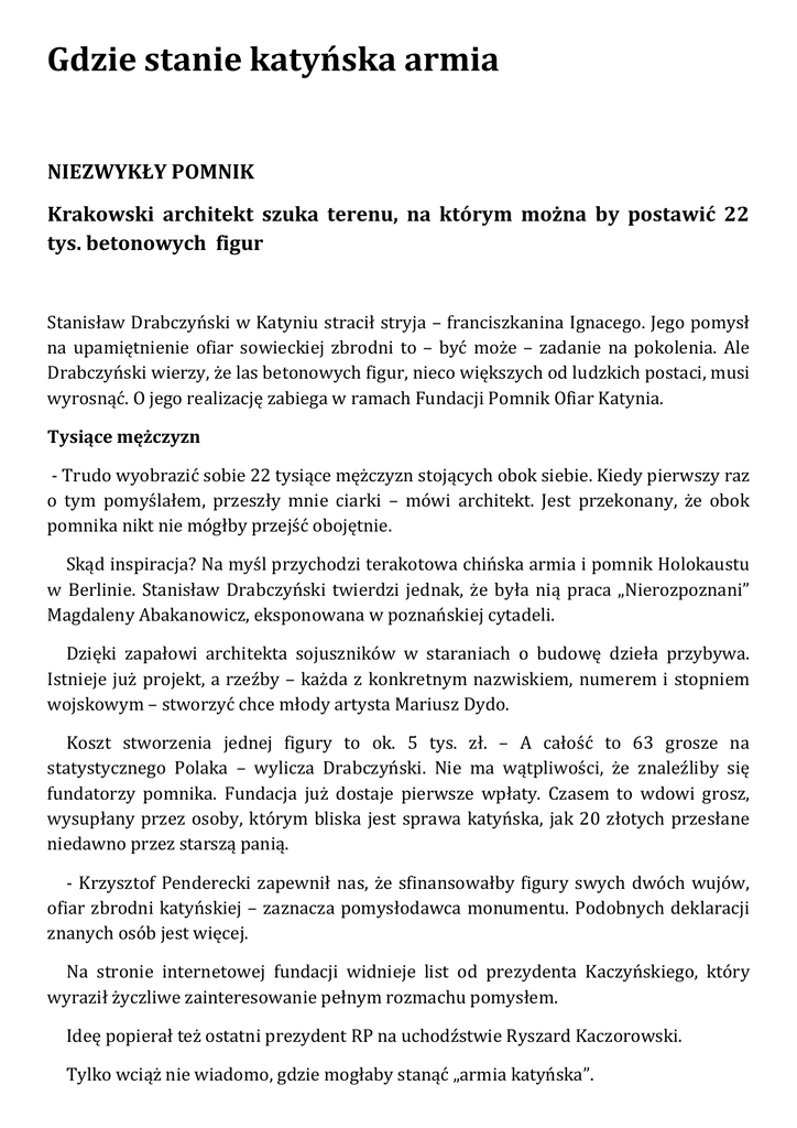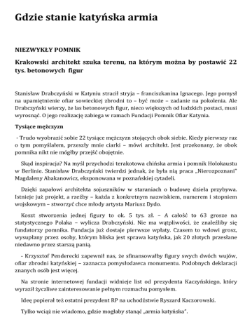 Gdzie stanie katyńska armia NIEZWYKŁY POMNIK Krakowski architekt szuka terenu, na którym można by postawić 22 tys. betonowych figur Stanisław Drabczyński w Katyniu stracił stryja – franciszkanina Ignacego. Jego pomysł na upamiętnienie ofiar sowieckiej zbrodni to – być może – zadanie na pokolenia. Ale Drabczyński wierzy, że las betonowych figur, nieco większych od ludzkich postaci, musi wyrosnąć. O jego realizację zabiega w ramach Fundacji Pomnik Ofiar Katynia. Tysiące mężczyzn - Trudo wyobrazić sobie 22 tysiące mężczyzn stojących obok siebie. Kiedy pierwszy raz o tym pomyślałem, przeszły mnie ciarki – mówi architekt. Jest przekonany, że obok pomnika nikt nie mógłby przejść obojętnie. Skąd inspiracja? Na myśl przychodzi terakotowa chińska armia i pomnik Holokaustu w Berlinie. Stanisław Drabczyński twierdzi jednak, że była nią praca „Nierozpoznani” Magdaleny Abakanowicz, eksponowana w poznańskiej cytadeli. Dzięki zapałowi architekta sojuszników w staraniach o budowę dzieła przybywa. Istnieje już projekt, a rzeźby – każda z konkretnym nazwiskiem, numerem i stopniem wojskowym – stworzyć chce młody artysta Mariusz Dydo. Koszt stworzenia jednej figury to ok. 5 tys. zł. – A całość to 63 grosze na statystycznego Polaka – wylicza Drabczyński. Nie ma wątpliwości, że znaleźliby się fundatorzy pomnika. Fundacja już dostaje pierwsze wpłaty. Czasem to wdowi grosz, wysupłany przez osoby, którym bliska jest sprawa katyńska, jak 20 złotych przesłane niedawno przez starszą panią. - Krzysztof Penderecki zapewnił nas, że sfinansowałby figury swych dwóch wujów, ofiar zbrodni katyńskiej – zaznacza pomysłodawca monumentu. Podobnych deklaracji znanych osób jest więcej. Na stronie internetowej fundacji widnieje list od prezydenta Kaczyńskiego, który wyraził życzliwe zainteresowanie pełnym rozmachu pomysłem. Ideę popierał też ostatni prezydent RP na uchodźstwie Ryszard Kaczorowski. Tylko wciąż nie wiadomo, gdzie mogłaby stanąć „armia katyńska”. Bo, aby postawić tak nietypowy pomnik, oprócz pieniędzy potrzeba co najmniej 6 hektarów terenu. Najlepiej sporo więcej – by zadbać o infrastrukturę dla zwiedzających, którzy oglądaliby taki obiekt. Być może znalazłoby się miejsce na muzeum i motel. Chęciny były chętne … Na początku roku wydawało się, że lokalizacja jest niemal przesądzona. W styczniu rada podkieleckich Chęcin zaprosiła przedstawicieli fundacji, na czele której stoi dziennikarz „Gazety Polskiej” Ryszard Kapuściński i z entuzjazmem przyjęła prezentację pomnika. Była mowa nawet o 38 hektarach, jakie Chęciny mogłyby zaoferować pod budowę. – To piękny teren – opowiada Stanisław Drabczyński. Dla tej lokalizacji powstał już nawet projekt inwestycji. Na początek wyrosłyby cokoły pod monumenty. Potem – figury ze specjalnego betonu. Według osób zaangażowanych w projekt budowa pomnika mogłaby przynieść dochody gminie. Ale Chęciny, na początku rozważające przekazanie fundacji ziemi nieodpłatnie, dotąd decyzji nie podjęły. - Sondujemy opinię mieszkańców – mówi „Rz” burmistrz Robert Jaworski. – Wiele osób wskazuje, że wartość ziemi na naszym terenie jest znaczna i rośnie – dodaje. Zaznacza też, że niektórzy mieszkańcy gminy uważają, iż pomnik skłaniający do zadumy, zlokalizowany niedaleko zamku, głównej atrakcji Chęcin, niekoniecznie współgra z walorami turystycznymi okolicy. Trudno więc przesądzi, czy radni ostatecznie zechcą, by „katyńska armia” wyrosła właśnie tam. - Jeśli będzie trzeba, przygotujemy kolejnych 20 projektów dla innych lokalizacji – zapewnia Drabczyński. Zdradza, że fundacji proponowano już inne tereny. Jeden – na ścianie wschodniej kraju, inny – pod Krakowem. Ten w gminie Chęciny wydawał się jednak najbardziej realny. Pomysłodawca pomnika pociesza się, że w Polsce jest tyle nieużytków, iż katyński pomnik na pewno gdzieś stanie. - Nie ma wątpliwości, że tak niezwykły projekt zostanie zrealizowany – zapewnia Barbara Hrynkiewicz – Długosz pracująca w fundacji. – Taka idea nie może się zmarnować. EWA ŁOSIŃSKA Rp.pl