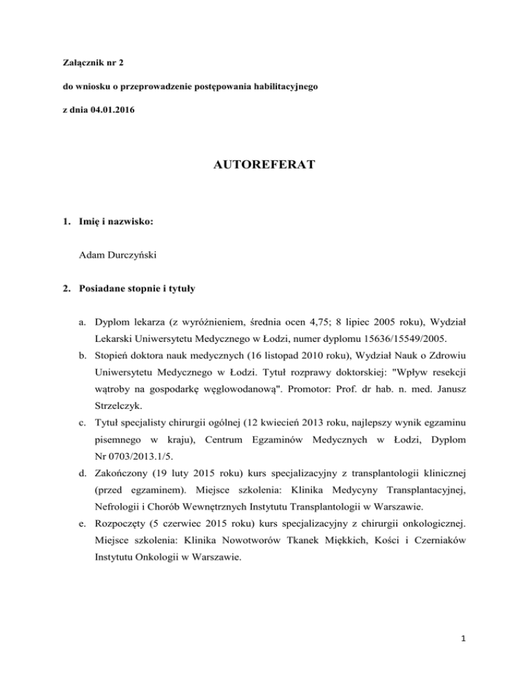 Załącznik nr 2 do wniosku o przeprowadzenie postępowania habilitacyjnego z dnia 04.01.2016 AUTOREFERAT 1. Imię i nazwisko: Adam Durczyński 2. Posiadane stopnie i tytuły a. Dyplom lekarza (z wyróżnieniem, średnia ocen 4,75; 8 lipiec 2005 roku), Wydział Lekarski Uniwersytetu Medycznego w Łodzi, numer dyplomu 15636/15549/2005. b. Stopień doktora nauk medycznych (16 listopad 2010 roku), Wydział Nauk o Zdrowiu Uniwersytetu Medycznego w Łodzi. Tytuł rozprawy doktorskiej: "Wpływ resekcji wątroby na gospodarkę węglowodanową". Promotor: Prof. dr hab. n. med. Janusz Strzelczyk. c. Tytuł specjalisty chirurgii ogólnej (12 kwiecień 2013 roku, najlepszy wynik egzaminu pisemnego w kraju), Centrum Egzaminów Medycznych w Łodzi, Dyplom Nr 0703/2013.1/5. d. Zakończony (19 luty 2015 roku) kurs specjalizacyjny z transplantologii klinicznej (przed egzaminem). Miejsce szkolenia: Klinika Medycyny Transplantacyjnej, Nefrologii i Chorób Wewnętrznych Instytutu Transplantologii w Warszawie. e. Rozpoczęty (5 czerwiec 2015 roku) kurs specjalizacyjny z chirurgii onkologicznej. Miejsce szkolenia: Klinika Nowotworów Tkanek Miękkich, Kości i Czerniaków Instytutu Onkologii w Warszawie. 1 3. Dotychczasowe zatrudnienie w jednostkach naukowych i artystycznych a. Klinika Chirurgii Ogólnej i Transplantacyjnej Uniwersytetu Medycznego w Łodzi, Uniwersytecki Szpital Kliniczny im. Norberta Barlickiego w Łodzi. - Doktorant, 1 maj 2008 – 30 wrzesień 2010 - Asystent, 1 październik 2010 – 31 październik 2013 - Adiunkt, 1 listopad 2013 – do chwili obecnej b. Klinika Chirurgii Onkologicznej Uniwersytetu Medycznego w Łodzi, Wojewódzki Szpital Specjalistyczny im. M. Kopernika w Łodzi. - Doktorant, 1 grudzień 2006 – 30 kwiecień 2008 c. Wojewódzki Szpital Specjalistyczny im. M. Kopernika w Łodzi. - Stażysta podyplomowy, 1 październik 2005 – 31 październik 2006 d. Erasmus MC, University Medical Center Rotterdam. - Stażysta, 2 wrzesień 2003 – 19 wrzesień 2003 - Stażysta, 1 sierpień 2004 – 31 sierpień 2004 4. Wskazanie osiągnięcia wynikającego z art. 16 ust. 2 ustawy z dnia 14 marca 2003 r. o stopniach naukowych i tytule naukowym oraz o stopniach i tytule w zakresie sztuki (Dz. U. nr 65, poz. 595 ze zm.) a) tytuł osiągnięcia naukowego Cykl 9 publikacji naukowych „Nowe metody diagnostyczne i terapeutyczne u chorych z guzami trzustki, ze szczególnym uwzględnieniem wykorzystania D-dimerów w rozpoznawaniu raka tego narządu”. 2 b) autorzy, tytuły publikacji, rok wydania, nazwa wydawnictwa* 1. Adam Durczyński, Marcin Wiszniewski, Witold Olejniczak, Marcin Polkowski, Stanisław Sporny, Janusz Strzelczyk. Asymptomatic solid pancreatic hamartoma. Arch. Med. Sci. 2011: 7, 6, 1082-1084. Wskaźnik Impact Factor ISI: 1.214, Punktacja Min. Nauki: 25.000. 2. Adam Durczyński, Piotr Hogendorf, Dariusz Szymański, Piotr Grzelak, Janusz Strzelczyk. Sentinel lymph node mapping in tumors of pancreatic body: preliminary report. Contemp. Oncol. (Współ. Onkol.) 2012: 16, 3, 206-209. Wskaźnik Impact Factor ISI: 0.211, Punktacja Min. Nauki: 15.000. 3. Adam Durczyński, Dariusz Szymański, Michał Nowicki, Piotr Hogendorf, Grażyna Poznańska, Janusz Strzelczyk. Very high concentration of D-dimers in portal blood in patients with pancreatic cancer. Pol. Prz. Chir. 2012: 84, 10, 521-525. Punktacja Min. Nauki: 4.000. 4. Dariusz Szymański, Adam Durczyński, Michał Nowicki, Janusz Strzelczyk. Gastrojejunostomy in patients with unresectable pancreatic head cancer - the use of Roux loop significantly shortens the hospital length of stay. World J. Gastroenterol. 2013: 19, 45, 8321-8325. Wskaźnik Impact Factor ISI: 2.433, Punktacja Min. Nauki: 25.000. 5. Adam Durczyński, Piotr Hogendorf, Dariusz Szymański, Witold Izdebski, Aleksandra Kaczka, Łukasz Durko, Janusz Strzelczyk. Insulinoma-rare, but important clinical problem. Analysis of a series of 530 patients who underwent surgical treatment for the pancreatic tumor. Pol. Przegl. Chir. 2014: 86, 11, 941-948. Punktacja Min. Nauki: 6.000 3 6. Adam Durczyński, Anna Kumor, Piotr Hogendorf, Dariusz Szymański, Grażyna Poznańska, Piotr Grzelak, Janusz Strzelczyk. D-dimers revisited: a new marker of pancreatic cancer. Am. J. Clin. Oncol. 2014: 37, 6, 642. Wskaźnik Impact Factor ISI: 3.062, Punktacja Min. Nauki: 20.000 7. Adam Durczyński, Anna Kumor, Piotr Hogendorf, Dariusz Szymański, Piotr Grzelak, Janusz Strzelczyk. Preoperative high level of D-dimers predicts unresectability of pancreatic head cancer. World J. Gastroenterol. 2014: 20, 36, 13167-13171. Wskaźnik Impact Factor ISI: 2.369, Punktacja Min. Nauki: 25.000 8. Adam Durczyński, Janusz Strzelczyk. Portal, but not peripheral, blood D-dimer level may help to differentiate malignant from benign pancreatic tumors. Blood Coagul. Fibrinolysis. 2015: 26, 1, 115-116. Wskaźnik Impact Factor ISI: 1.403, Punktacja Min. Nauki: 15.000 9. Adam Durczyński, Janusz Strzelczyk Is it occult cancer? Increased D-dimers in older patients with a non-high clinical probability of venous thromboembolism. Publikacja na stronie internetowej pisma BMJ: http://www.bmj.com/content/346/bmj.f2492/rr/657190 (z uwagi na brak numeru DOI, praca wykluczona w dalszej analizie bibliometrycznej). Całkowity Impact Factor powyższych prac wynosi 10,692, całkowita punktacja MNiSW 135 punktów, w tym 7 publikacji oryginalnych o wartości 110 punktów MNiSW oraz współczynniku IF wynoszącym 9,478 i 1 publikacja kazuistyczna o wartości 25 punktów MNiSW oraz współczynniku IF wynoszącym 1,214. *Powyższy cykl publikacji powiązanych tematycznie stanowi moje indywidualne osiągnięcie naukowe. Określenie mojego indywidualnego wkładu autorskiego w każdą z wyżej wymienionych prac znajduje się w załącznikach nr 4 i 5, a oświadczenia współautorów o ich indywidualnym wkładzie w publikacje wskazane, jako osiągnięcie naukowe – w załączniku nr 6, zaś pełne teksty tych prac w załączniku nr 7. 4 c) om