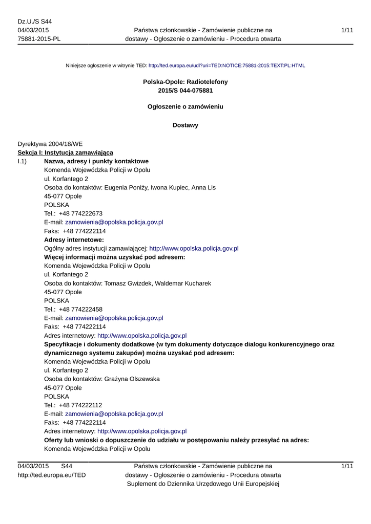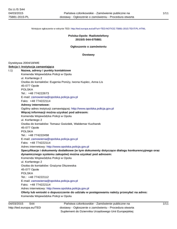 Dz.U./S S44 04/03/2015 75881-2015-PL Państwa członkowskie - Zamówienie publiczne na dostawy - Ogłoszenie o zamówieniu - Procedura otwarta 1/11 Niniejsze ogłoszenie w witrynie TED: http://ted.europa.eu/udl?uri=TED:NOTICE:75881-2015:TEXT:PL:HTML Polska-Opole: Radiotelefony 2015/S 044-075881 Ogłoszenie o zamówieniu Dostawy Dyrektywa 2004/18/WE Sekcja I: Instytucja zamawiająca I.1) Nazwa, adresy i punkty kontaktowe Komenda Wojewódzka Policji w Opolu ul. Korfantego 2 Osoba do kontaktów: Eugenia Poniży, Iwona Kupiec, Anna Lis 45-077 Opole POLSKA Tel.: +48 774222673 E-mail: [email protected] Faks: +48 774222114 Adresy internetowe: Ogólny adres instytucji zamawiającej: http://www.opolska.policja.gov.pl Więcej informacji można uzyskać pod adresem: Komenda Wojewódzka Policji w Opolu ul. Korfantego 2 Osoba do kontaktów: Tomasz Gwizdek, Waldemar Kucharek 45-077 Opole POLSKA Tel.: +48 774222458 E-mail: [email protected] Faks: +48 774222114 Adres internetowy: http://www.opolska.policja.gov.pl Specyfikacje i dokumenty dodatkowe (w tym dokumenty dotyczące dialogu konkurencyjnego oraz dynamicznego systemu zakupów) można uzyskać pod adresem: Komenda Wojewódzka Policji w Opolu ul. Korfantego 2 Osoba do kontaktów: Grażyna Olszewska 45-077 Opole POLSKA Tel.: +48 774222112 E-mail: [email protected] Faks: +48 774222114 Adres internetowy: http://www.opolska.policja.gov.pl Oferty lub wnioski o dopuszczenie do udziału w postępowaniu należy przesyłać na adres: Komenda Wojewódzka Policji w Opolu 04/03/2015 S44 http://ted.europa.eu/TED Państwa członkowskie - Zamówienie publiczne na dostawy - Ogłoszenie o zamówieniu - Procedura otwarta Suplement do Dziennika Urzędowego Unii Europejskiej 1/11 Dz.U./S S44 04/03/2015 75881-2015-PL Państwa członkowskie - Zamówienie publiczne na dostawy - Ogłoszenie o zamówieniu - Procedura otwarta 2/11 ul. Korfantego 2 Osoba do kontaktów: Grażyna Olszewska 45-077 Opole POLSKA Tel.: +48 774222112 E-mail: [email protected] Faks: +48 774222114 Adres internetowy: http://www.opolska.policja.gov.pl I.2) Rodzaj instytucji zamawiającej Agencja/urząd regionalny lub lokalny I.3) Główny przedmiot lub przedmioty działalności Porządek i bezpieczeństwo publiczne I.4) Udzielenie zamówienia w imieniu innych instytucji zamawiających Instytucja zamawiająca dokonuje zakupu w imieniu innych instytucji zamawiających: nie Sekcja II: Przedmiot zamówienia II.1) Opis II.1.1) Nazwa nadana zamówieniu przez instytucję zamawiającą: Dostawa oraz instalacja sprzętu do rozbudowy systemu DMR w Komendzie Wojewódzkiej Policji w Opolu. II.1.2) Rodzaj zamówienia oraz lokalizacja robót budowlanych, miejsce realizacji dostawy lub świadczenia usług Dostawy Kupno Główne miejsce lub lokalizacja robót budowlanych, miejsce realizacji dostawy lub świadczenia usług: Jednostki Policji podległe KWP w Opolu. Kod NUTS PL52 II.1.3) Informacje na temat zamówienia publicznego, umowy ramowej lub dynamicznego systemu zakupów (DSZ) Ogłoszenie dotyczy zamówienia publicznego II.1.4) Informacje na temat umowy ramowej II.1.5) Krótki opis zamówienia lub zakupu Przedmiotem zamówienia jest dostawa oraz instalacja sprzętu radiokomunikacyjnego przeznaczonego do rozbudowy, eksploatowanego przez KWP w Opolu, cyfrowego systemu łączności zgodnego ze standardem ETSI DMR Tier II w jednostkach podległych KWP w Opolu, który szczegółowo został opisany (m.in. ilościowo, asortymentowo) w Opisie przedmiotu zamówienia(OPZ) stanowiącym załącznik do specyfikacji istotnych warunków zamówienia (będącym równocześnie załącznikiem nr 1 do wzoru umowy). Z uwagi na to, iż w zakres zamówienia wchodzą prace przy instalacjach antenowych i montaż urządzeń retransmisyjnych, w celu zapoznania wykonawców z zakresem wymaganych prac, co ułatwi dokonanie ich wyceny i pozwoli na prawidłowe przygotowanie oferty, Zamawiający przewiduje dla wykonawców przeprowadzenie w obiektach wizji lokalnych. Zgłoszenie udziału w wizjach lokalnych należy dokonać w sposób opisany w OPZ (rozdział II pkt.2) w terminie do 10 dni kalendarzowych od dnia publikacji ogłoszenia o zamówieniu Zamawiający dopuszcza składanie ofert równoważnych przy zachowaniu warunku równoważności polegającego na tym, iż dostarczone urządzenia muszą zapewnić pełną współpracę pod względem przekazywania głosu, szyfrowania, maskowania, przekazywania danych telemetrycznych, przekazywania 04/03/2015 S44 http://ted.europa.eu/TED Państwa członkowskie - Zamówienie publiczne na dostawy - Ogłoszenie o zamówieniu - Procedura otwarta Suplement do Dziennika Urzędowego Unii Europejskiej 2/11 Dz.U./S S44 04/03/2015 75881-2015-PL Państwa członkowskie - Zamówienie publiczne na dostawy - Ogłoszenie o zamówieniu - Procedura otwarta 3/11 wiadomości tekstowych oraz danych lokalizacyjnych GPS z wykorzystywanymi obecnie przez Zamawiającego radiotelefonami DM3601/4601, DP3601/4601, przemiennikami DR3000 firmy Motorola oraz współpracować w w/w zakresie z uruchomionym w KWP w Opolu oprogramowaniem dyspozytorskim TRBOnet w wersji 3.6.0.110 firmy Neocom. Na etapie wyboru oferty Zamawiający zastrzega sobie prawo do przeprowadzenia testów oferowanych radiotelefonów i stacji retransmisyjnych pod kątem ich pełnej współpracy z wykorzystywanym systemem radiokomunikacyjnym i posiadanym oprogramowaniem dyspozytorskim. Wykazanie równoważności przedmiotu zamówienia (zgodnie z art. 30 ust.5 Ustawy Pzp) spoczywa na wykonawcy. II.1.6) Wspólny Słownik Zamówień (CPV) 32236000, 32200000, 30214000, 48900000, 51330000 II.1.7) Informacje na temat Porozumienia w sprawie zamówień rządowych (GPA) Zamówienie jest objęte Porozumieniem w sprawie zamówień rządowych (GPA): tak II.1.8) Części To zamówienie podzielone jest na części: nie II.1.9) Informacje o ofertach wariantowych Dopuszcza się składanie ofert wariantowych: nie II.2) Wielkość lub zakres zamówienia II.2.1) Całkowita wielkość lub z