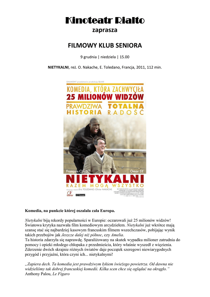 Kinoteatr Rialto zaprasza FILMOWY KLUB SENIORA 9 grudnia | niedziela | 15.00 NIETYKALNI, reż. O. Nakache, E. Toledano, Francja, 2011, 112 min. Komedia, na punkcie której oszalała cała Europa. Nietykalni biją rekordy popularności w Europie: oczarowali już 25 milionów widzów! Światowa krytyka nazwała film komediowym arcydziełem. Nietykalni już wkrótce mają szansę stać się najbardziej kasowym francuskim filmem wszechczasów, pobijając wynik takich przebojów jak Jeszcze dalej niż północ, czy Amelia. Ta historia zdarzyła się naprawdę. Sparaliżowany na skutek wypadku milioner zatrudnia do pomocy i opieki młodego chłopaka z przedmieścia, który właśnie wyszedł z więzienia. Zderzenie dwóch skrajnie różnych światów daje początek szeregowi niewiarygodnych przygód i przyjaźni, która czyni ich... nietykalnymi! „Zapiera dech. Ta komedia jest prawdziwym łykiem świeżego powietrza. Od dawna nie widzieliśmy tak dobrej francuskiej komedii. Kilka scen chce się oglądać na okrągło.” Anthony Palou, Le Figaro Bilety: 5 zł (emeryci i renciści), 12 zł (uczniowie i studenci), 14 zł (pozostali) 15 grudnia | sobota | 15.00 MÓJ TYDZIEŃ Z MARILYN, reż. S. Curtis, USA, 2011, 99 min. Marilyn Monroe (Michelle Williams) - ikona seksu i blichtru Hollywood przyjeżdża do Londynu, aby wystąpić w filmie u boku Laurence'a Oliviera (Kenneth Branagh). Towarzyszy jej świeżo poślubiony mąż, dramaturg Arthur Miller (Dougray Scott), który jednak szybko wyjeżdża. Podczas pobytu na Starym Kontynencie, gwiazdą zajmuje się młody asystent reżysera Colin (Eddie Redmayne), który spędzi z nią niezwykły tydzień, za który większość oddałaby całe życie. Nie wszystko, co się w tym czasie wydarzy, zapisze się w historii, ale z pewnością pozostanie w sercach dwójki ludzi. Bilety: 5 zł (emeryci i renciści), 12 zł (uczniowie i studenci), 14 zł (pozostali)