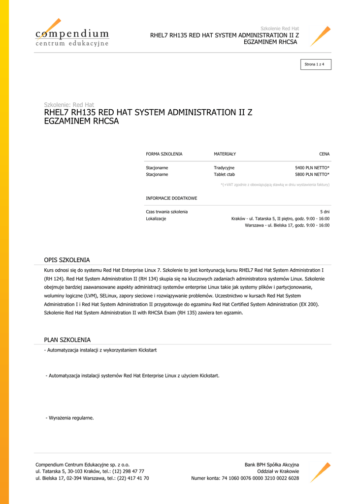 Szkolenie Red Hat RHEL7 RH135 RED HAT SYSTEM ADMINISTRATION II Z EGZAMINEM RHCSA Strona 1 z 4 Szkolenie: Red Hat RHEL7 RH135 RED HAT SYSTEM ADMINISTRATION II Z EGZAMINEM RHCSA FORMA SZKOLENIA MATERIAŁY CENA Stacjonarne Tradycyjne 5400 PLN NETTO* Stacjonarne Tablet ctab 5800 PLN NETTO* *(+VAT zgodnie z obowiązującą stawką w dniu wystawienia faktury) INFORMACJE DODATKOWE Czas trwania szkolenia 5 dni Lokalizacje Kraków - ul. Tatarska 5, II piętro, godz. 9:00 - 16:00 Warszawa - ul. Bielska 17, godz. 9:00 - 16:00 OPIS SZKOLENIA Kurs odnosi się do systemu Red Hat Enterprise Linux 7. Szkolenie to jest kontyunacją kursu RHEL7 Red Hat System Administration I (RH 124). Red Hat System Administration II (RH 134) skupia się na kluczowych zadaniach administratora systemów Linux. Szkolenie obejmuje bardziej zaawansowane aspekty administracji systemów enterprise Linux takie jak systemy plików i partycjonowanie, woluminy logiczne (LVM), SELinux, zapory sieciowe i rozwiązywanie problemów. Uczestnictwo w kursach Red Hat System Administration I i Red Hat System Administration II przygotowuje do egzaminu Red Hat Certified System Administration (EX 200). Szkolenie Red Hat System Administration II with RHCSA Exam (RH 135) zawiera ten egzamin. PLAN SZKOLENIA - Automatyzacja instalacji z wykorzystaniem Kickstart - Automatyzacja instalacji systemów Red Hat Enterprise Linux z użyciem Kickstart. - Wyrażenia regularne. Compendium Centrum Edukacyjne sp. z o.o. ul. Tatarska 5, 30-103 Kraków, tel.: (12) 298 47 77 ul. Bielska 17, 02-394 Warszawa, tel.: (22) 417 41 70 Bank BPH Spółka Akcyjna Oddział w Krakowie Numer konta: 74 1060 0076 0000 3210 0022 6028 Szkolenie Red Hat RHEL7 RH135 RED HAT SYSTEM ADMINISTRATION II Z EGZAMINEM RHCSA Strona 2 z 4 - Izolacja i wyszukiwanie zawartości plików tekstowych z wykorzystaniem wyrażeń regularnych i narzędzia grep. - Tworzenie i edycja plików tekstowych w vim. - Edytor vim. - Harmonogram zadań w Linux. - Planowanie zadań w celu automatycznego wykonania w przyszłości. - Zarządzanie priorytetami procesów w Linux. - Wpływ priorytetów na działanie procesów w Linux. - Kontrola dostępu do plików poprzez listy kontroli dostępu (ACL). - Zarządzanie bezpieczeństwem plików z wykorzystaniem list kontroli dostępu POSIX. - Zarządzanie SELinux. - Zarządzanie zachowaniem SELinux w celu zapewnienia bezpieczeństwa systemu. Compendium Centrum Edukacyjne sp. z o.o. ul. Tatarska 5, 30-103 Kraków, tel.: (12) 298 47 77 ul. Bielska 17, 02-394 Warszawa, tel.: (22) 417 41 70 Bank BPH Spółka Akcyjna Oddział w Krakowie Numer konta: 74 1060 0076 0000 3210 0022 6028 Szkolenie Red Hat RHEL7 RH135 RED HAT SYSTEM ADMINISTRATION II Z EGZAMINEM RHCSA Strona 3 z 4 - Podłączenie do sieciowych usług zarządzania tożsamością. - Konfiguracja systemu w celu użycia usług zarządzania tożsamością. - Tworzenie dysków, partycji i systemów plików w Linux. - Zarządzanie prostymi partycjami i systemami plików. - Zarządzanie woluminami logicznymi (LVM). - Zarządzanie LVM z poziomu wiersza poleceń. - Dostęp do usług udostępniania plików w sieci z wykorzystaniem NFS. - Bezpieczny dostęp do udziałów NFS. - Dostęp do usług udostępniania plików w sieci z wykorzystaniem SMB. - Wykorzystanie autofs i wiersza poleceń do montowania/odmontowania udziałów SMB. - Kontrola i rozwiązywanie problemów związanych z procesem startu systemu Red Hat Enterprise Linux. Compendium Centrum Edukacyjne sp. z o.o. ul. Tatarska 5, 30-103 Kraków, tel.: (12) 298 47 77 ul. Bielska 17, 02-394 Warszawa, tel.: (22) 417 41 70 Bank BPH Spółka Akcyjna Oddział w Krakowie Numer konta: 74 1060 0076 0000 3210 0022 6028 Szkolenie Red Hat RHEL7 RH135 RED HAT SYSTEM ADMINISTRATION II Z EGZAMINEM RHCSA Strona 4 z 4 - Ograniczenie komunikacji sieciowej z użyciem zapory sieciowej. - Konfiguracja podstawowej zapory sieciowej. - Obszerna powtórka. - Ćwiczenia praktyczne i przedstawienie wiedzy i umiejętności nabytych w trakcie szkolenia. - Egzamin RHCSA. WYMAGANIA DLA UCZESTNIKA - Uczestnictwo w kursie RHEL7 RH124 Red Hat System Administration I - Organizacja tematów w tym kursie powoduje, że nie powinien być on traktowany jako punkt startowy. Osoby bez wcześniejszego doświadczenia powinny rozpocząć od kursu RHEL7 RH124 Red Hat System Administration I lub kursu RHCSA Fast Track (RH200) w przypadku doświadczonych administratorów systemu Linux. - Istnieje możliwość bezpłatnego sprawdzenia swojej wiedzy na temat systemu Red Hat Enterprise Linux na stronie: https://www.redhat.com/rhtapps/assessment/?partner=compendium_centrum CERTYFIKATY Uczestnicy szkolenia otrzymują certyfikat sygnowany przez firmę Red Hat. PROWADZĄCY Red Hat Certified Instructor. Compendium Centrum Edukacyjne sp. z o.o. ul. Tatarska 5, 30-103 Kraków, tel.: (12) 298 47 77 ul. Bielska 17, 02-394 Warszawa, tel.: (22) 417 41 70 Bank BPH Spółka Akcyjna Oddział w Krakowie Numer konta: 74 1060 0076 0000 3210 0022 6028