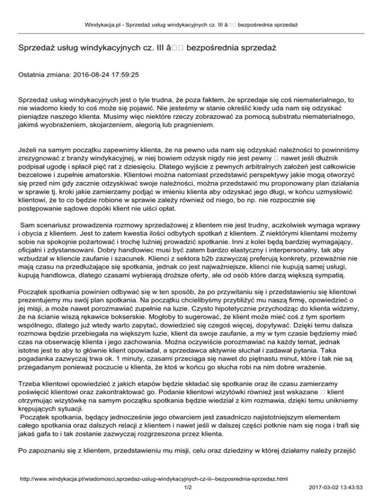 Windykacja.pl - Sprzedaż usług windykacyjnych cz. III â Sprzedaż usług windykacyjnych cz. III â bezpośrednia sprzedaż bezpośrednia sprzedaż Ostatnia zmiana: 2016-08-24 17:59:25 Sprzedaż usług windykacyjnych jest o tyle trudna, że poza faktem, że sprzedaje się coś niematerialnego, to nie wiadomo kiedy to coś może się pojawić. Nie jesteśmy w stanie określić kiedy uda nam się odzyskać pieniądze naszego klienta. Musimy więc niektóre rzeczy zobrazować za pomocą substratu niematerialnego, jakimś wyobrażeniem, skojarzeniem, alegorią lub pragnieniem. Jeżeli na samym początku zapewnimy klienta, że na pewno uda nam się odzyskać należności to powinniśmy zrezygnować z branży windykacyjnej, w niej bowiem odzysk nigdy nie jest pewny nawet jeśli dłużnik podpisał ugodę i spłacił pięć rat z dziesięciu. Dlatego wyjście z pewnych arbitralnych założeń jest całkowicie bezcelowe i zupełnie amatorskie. Klientowi można natomiast przedstawić perspektywy jakie mogą otworzyć się przed nim gdy zacznie odzyskiwać swoje należności, można przedstawić mu proponowany plan działania w sprawie tj. kroki jakie zamierzamy podjąć w imieniu klienta aby odzyskać jego długi, w końcu uzmysłowić klientowi, że to co będzie robione w sprawie zależy również od niego, bo np. nie rozpocznie się postępowanie sądowe dopóki klient nie uiści opłat. Sam scenariusz prowadzenia rozmowy sprzedażowej z klientem nie jest trudny, aczkolwiek wymaga wprawy i obycia z klientem. Jest to zatem kwestia ilości odbytych spotkań z klientem. Z niektórymi klientami możemy sobie na spokojnie pożartować i trochę luźniej prowadzić spotkanie. Inni z kolei będą bardziej wymagający, oficjalni i zdystansowani. Dobry handlowiec musi być zatem bardzo elastyczny i interpersonalny, tak aby wzbudzał w kliencie zaufanie i szacunek. Klienci z sektora b2b zazwyczaj preferują konkrety, przeważnie nie mają czasu na przedłużające się spotkania, jednak co jest najważniejsze, klienci nie kupują samej usługi, kupują handlowca, dlatego czasami wybierają droższe oferty, ale od osób które darzą większą sympatią. Początek spotkania powinien odbywać się w ten sposób, że po przywitaniu się i przedstawieniu się klientowi prezentujemy mu swój plan spotkania. Na początku chcielibyśmy przybliżyć mu naszą firmę, opowiedzieć o jej misji, a może nawet porozmawiać zupełnie na luzie. Czysto hipotetycznie przychodząc do klienta widzimy, że na ścianie wiszą rękawice bokserskie. Mogłoby to sugerować, że klient może mieć coś z tym sportem wspólnego, dlatego już wtedy warto zapytać, dowiedzieć się czegoś więcej, dopytywać. Dzięki temu dalsza rozmowa będzie przebiegała na większym luzie, klient da swoje zaufanie, a my w tym czasie będziemy mieć czas na obserwację klienta i jego zachowania. Można oczywiście porozmawiać na każdy temat, jednak istotne jest to aby to głównie klient opowiadał, a sprzedawca aktywnie słuchał i zadawał pytania. Taka pogadanka zazwyczaj trwa ok. 1 minuty, czasami przeciąga się nawet do piętnastu minut, które i tak nie są przegadanym ponieważ poczucie u klienta, że ktoś w końcu go słucha robi na nim dobre wrażenie. Trzeba klientowi opowiedzieć z jakich etapów będzie składać się spotkanie oraz ile czasu zamierzamy poświęcić klientowi oraz zakontraktować go. Podanie klientowi wizytówki również jest wskazane klient otrzymując wizytówkę na samym początku spotkania będzie wiedział z kim rozmawia, dzięki temu unikniemy krępujących sytuacji. Początek spotkania, będący jednocześnie jego otwarciem jest zasadniczo najistotniejszym elementem całego spotkania oraz dalszych relacji z klientem i nawet jeśli w dalszej części potknie nam się noga i trafi się jakaś gafa to i tak zostanie zazwyczaj rozgrzeszona przez klienta. Po zapoznaniu się z klientem, przedstawieniu mu misji, celu oraz dziedziny w której działamy należy przejść http://www.windykacja.pl/wiadomosci,sprzedaz-uslug-windykacyjnych-cz-iii--bezposrednia-sprzedaz.html 1/2 2017-03-02 13:43:53 Windykacja.pl - Sprzedaż usług windykacyjnych cz. III â bezpośrednia sprzedaż do etapu analizy potrzeb klienta. Na tym etapie powinniśmy dowiedzieć się jak najwięcej na temat tego czym klient się zajmuje, jak odbywają się płatności, jakie są najdłuższe terminy płatności, czy miał już jakieś poważniejsze problemy ze spłatą w związku z tym, że jemu kontrahenci nie zapłacili, z jakimi dłużnikami ma problemy, od kiedy próbuje odzyskać pieniądze, jakie kroki podjął w kierunku windykacji należności, czy rozmawiał na ten temat z innymi podmiotami, czy współpracuje z jakimiś innymi firmami zajmującymi się dochodzeniem należności itd., itd. Listę takich pytań można sobie przygotować nawet w formie ankiety, jednak osobiście uważam, że najlepiej posiadać ją w głowie. Analiza dostarczy nam cennych informacji na temat tego jakich spraw możemy się po kliencie spodziewać, po jakości i ilości spraw możemy obliczyć potencjalną dochodowość naszego klienta. Dobrze jest poprosić klienta o dokumenty spraw, które chciałby przekazać do windykacji celem ich wyceny i analizy. Dobrze mieć przygotowanych dla klienta kilka propozycji podjęcia windykacji na zlecenie. Mogą to być różne stawki prowizyjne uzależnione od rodzaju i ilości czynności podejmowanych w sprawach. Nie ma sensu proponowanie klientowi dwudziestu procent prowizji jeżeli nasza praca polegać ma tylko na wysłaniu wezwania do zapłaty byłoby to nieuczciwe z naszej strony. Ostatnim etapem jest finalizacja rozmowy. Jeżeli uda się podczas pierwszego spotkania ustalić konsensus dotyczący ceny oraz warunków współpracy nie ma przeszkód by od razu podpisać umowę oraz wziąć zlecenia windykacji. Przy czym informacja taka nie powinna pozostawać pusta, tzn. powinna być zapowiedziany kolejny kontakt n