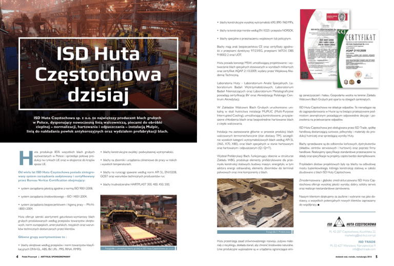 • blachy konstrukcyjne wysokiej wytrzymałości 690, 890 i 960 MPa, • blachy na konstrukcje morskie według EN 10225 i przepisów NORSOK, • blachy specjalne o przeznaczeniu wojskowym lub policyjnym. ISD Huta Częstochowa dzisiaj ISD Huta Częstochowa sp. z o.o. to największy producent blach grubych w Polsce, dysponujący nowoczesną linią walcowniczą, piecami do obróbki cieplnej – normalizacji, hartowania i odpuszczania – instalacją Mulpic, linią do nakładania powłok antykorozyjnych oraz wydziałem prefabrykacji blach. H uta produkuje 85% wszystkich blach grubych wytwarzanych w Polsce i sprzedaje połowę produkcji na rynkach UE oraz w eksporcie do krajów spoza UE. Od wielu lat ISD Huta Częstochowa posiada zintegrowany system zarządzania audytowany i certyfikowany przez Bureau Veritas Certification obejmujący: Blachy mają znak bezpieczeństwa CE oraz certyfikaty zgodności z przepisami dyrektywy 97/23/EG, przepisami VdTÜV, DBS 918002-2 oraz UDT. Huta posiada koncesję MSW, umożliwiającą projektowanie i wytwarzanie blach specjalnych stosowanych w wyrobach militarnych oraz certyfikat AQAP 2110:2009, wydany przez Wojskową Akademię Techniczną. Laboratoria Huty – Laboratorium Analiz Specjalnych, Laboratorium Badań Wytrzymałościowych, Laboratorium Badań Nieniszczących oraz Laboratorium Metalograficzne posiadają certyfikację BV oraz Akredytację Polskiego Centrum Akredytacji. W Zakładzie Walcowni Blach Grubych uruchomiono unikalną w skali hutnictwa instalację MUPLIC (Multi-Purpose Interrupted Cooling), umożliwiającą kontrolowane, przyspieszone chłodzenia blach oraz bezpośrednie hartowanie blach z ciepła walcowania. Instalacja ma zastosowanie głównie w procesie produkcji blach walcowanych termomechanicznie (stan dostawy TM), szczególnie wysokich kategorii wytrzymałościowych blach według API 5L (X65, X70, X80), oraz blach specjalnych w stanie hartowanym oraz hartowanym i odpuszczanym (Q i Q+T). • blachy konstrukcyjne zwykłej i podwyższonej wytrzymałości, • blachy na zbiorniki i urządzenia ciśnieniowe do pracy w niskich i wysokich temperaturach, • blachy na rurociągi spawane według norm API 5L, EN10208, GOST oraz warunków technicznych producentów rur, Wydział Prefabrykacji Blach, funkcjonujący obecnie w strukturze Zakładu WBG, produkuje elementy prefabrykowane dla przemysłu konstrukcji stalowych, budowy maszyn, energetyki, w tym sektora energii odnawialnej, elementy zbiorników do terminali paliwowych oraz inne komponenty z blach. • system zarządzania jakością zgodnie z normą ISO 9001:2008, • system zarządzania bezpieczeństwem i higieną pracy – PN-N18001:2004. Huta oferuje szeroki asortyment gatunkowo-wymiarowy blach grubych produkowanych według przepisów towarzystw okrętowych, norm europejskich, amerykańskich, rosyjskich oraz warunków technicznych dostarczanych przez klientów. Fotografia 2: Prefabrykaty Główne grupy asortymentowe to : Polski Przemysł | ARTYKUŁ SPONSOROWANY ISD Huta Częstochowa jest obsługiwana przez ISD Trade, spółkę handlową dostarczającą surowce, półwyroby i materiały do produkcji hutniczej oraz sprzedającą wyroby Huty. Blachy sprzedawane są do odbiorców końcowych, dystrybutorów (składów, centrów serwisowych i hurtowni) oraz poprzez firmy handlowe. Realizujemy specyfikacje standardowe przeznaczone na składy oraz specyfikacje na projekty, często bardzo skomplikowane. Przykładem dostaw projektowych były np. blachy na odbudowę mostu Łazienkowskiego, którego konstrukcję stalową w całości zbudowano z blach ISD Huty Częstochowa. Naszym klientom dziękujemy za zaufanie i wybranie nas jako dostawcy, a wszystkich potencjalnych nowych klientów zapraszamy do współpracy. ■ • system zarządzania środowiskowego – ISO 14001:2004, 4 ISD Huta Częstochowa nie składuje odpadów. Te nienadające się do zagospodarowania w Hucie są na bieżąco przekazywane podmiotom zewnętrznym posiadającym odpowiednie decyzje i pozwolenia na przetwarzanie odpadów. Zmodernizowana i głęboko zrestrukturyzowana ISD Huta Częstochowa oferuje wysokiej jakości wyroby, dobry, solidny serwis oraz realizuje niestandardowe zamówienia. • blachy trudnościeralne HARTPLAST 300, 400, 450, 500, • blachy okrętowe według przepisów i norm towarzystw klasyfikacyjnych DNV-GL, ABS, BV, LR’s , PRS, RINA, RMRS; sję zanieczyszczeń i hałasu. Gospodarka wodna na terenie Zakładu Walcowni Blach Grubych jest oparta na obiegach zamkniętych. Fotografia 1: produkcja blachy grubej w ISD Huta Częstochowa sp. z o.o. Huta przestrzega zasad zrównoważonego rozwoju, zużywa materiały z recyklingu, dokłada starań, aby chronić środowisko naturalne. Linie produkcyjne wyposażone są w urządzenia ograniczające emi- PL 42-207 Częstochowa, Kucelińska 22 [email protected] ISD TRADE PL 02-627 Warszawa, Naruszewicza 9 [email protected] dodatek stal, metale, metalurgia 2016 5