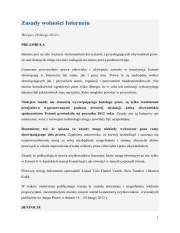 Zasady wolności Internetu Wersja z 29 lutego 2012 r. PREAMBUŁA Internet jest na tyle ważnym instrumentem korzystania z przysługujących obywatelom praw, że sam dostęp do niego również zasługuje na miano prawa podstawowego. Uznawane powszechnie prawa człowieka i obywatela zawarte w konstytucji Estonii obowiązują w Internecie tak samo, jak i poza nim. Prawa te są nadrzędne wobec obowiązujących jak i przyszłych ustaw, regulacji i porozumień międzynarodowych. Nie można komukolwiek ograniczyć praw tylko dlatego, że w celu ich realizacji wykorzystuje Internet lub jakiekolwiek inne narzędzia, które mogłyby powstać w przyszłości. Niniejsze zasady nie stanowią wyczerpującego katalogu praw, są tylko rezultatami przejściowo wypracowanymi podczas otwartej dyskusji, którą obywatelskie społeczeństwo Estonii prowadziło na początku 2012 roku. Zasady nie są końcowe ani ostateczne; wraz z rozwojem technologii mogą i powinny być uzupełniane. Rozumiemy też, że spisane tu zasady mogą niekiedy wykraczać poza ramy obowiązującego dziś prawa. Zajęliśmy stanowisko, że rozwój technologii i szerzące się rozpowszechnienie niosą ze sobą niezbędność uzupełnienia i zmiany obecnych aktów prawnych w celach zapewnienia trwałej ochrony praw człowieka i praw obywatelskich. Zasady te podkreślają te prawa użytkowników Internetu, które mogą obowiązywać nie tylko w Estonii (i w kontekście naszej konstytucji), ale również w innych częściach świata. Pierwszą wersję dokumentu sporządzili Linnar Viik, Daniel Vaarik, Sten Tamkivi i Marten Kokk. W trakcie omówienia publicznego wersja ta została zmieniona i uzupełniona wieloma propozycjami, zaczerpniętymi między innymi wśród komentarzy użytkowników wyrażanych publicznie na blogu Praxis w dniach 14 – 24 lutego 2012 r. DEFINICJE 1 Użytkownik – osoba, która korzysta z usług sieciowych w celu obcowania z innymi ludźmi lub w celu otrzymania dostępu do treści internetowych. Wszyscy obecni i ewentualni użytkownicy w tekście zasad są określeni wyrazem “każdy”. Dostawca usługi sieciowej – przedsiębiorca, który oferuje użytkownikom środki i usługi umożliwiające im obcowanie z innymi użytkownikami lub zapewniające dostęp do treści internetowych. Dostawca treści internetowych – osoba prywatna, firma lub instytucja państwowa, która oferuje użytkownikom usługi dotyczące przechowania danych lub ich opracowania bądź też udostępnia użytkownikom dostęp do zbioru swoich danych. Dostawca usługi internetowej – dostawca usługi sieciowej lub treści internetowych. Państwo – sektor publiczny, który obejmuje tak organy władzy ustawodawczej, wykonawczej i sądowniczej, jak również przedsiębiorstwa, które świadczą usługi publiczne na poziomie państwowym, a także lokalnym oraz międzynarodowym. Internet – zbiór usług sieciowych i treści internetowych dostępnych dla użytkowników. 1. KORZYSTANIE Z INTERNETU Każdy ma prawo do wejścia do Internetu i do korzystania z niego. • Dostawcy usługi internetowej są wolni od ograniczeń, które zmieniałyby usługi na droższe lub mogłyby w inny sposób wpłynąć na zmniejszenie ich dostępności dla użytkowników. 2. ROZPOWSZECHNIENIE Każdy ma prawo do swobodnego tworzenia, poszukiwania, przyjmowania oraz przekazania dalej informacji w Internecie. • Szeroka dostępność Internetu umożliwia pozytywny wpływ swobodnego rozpowszechnienia informacji. 3. TWÓRCZOŚĆ 2 Każdy ma prawo do wniesienia swego wkładu w rozpowszechnienie bogactwa zasobów kultury i wiedzy w Internecie oraz do uzupełnienia i wzbogacenia go własną twórczością. Każdy ma prawo do bycia uznanym za twórcę swego dzieła. Każdy ma prawo do robienia kopii ze znalezionych w Internecie opublikowanych zgodnie z obowiązującym prawem dzieł i innych opublikowanych zgodnie z obowiązującym prawem informacji w celu użytku własnego i użytku w swoim gospodarstwie domowym oraz do ich zmian, wykorzystania, jak również i do ich zniszczenia. Nie ograniczając wymienionych wyżej praw, każdy ma prawo do wprowadzenia w wyznaczonym przez ustawę terminie warunków korzystania i rozpowszechnienia swojej twórczości. Warunki te nie mogą być w sprzeczności z podstawowymi postulatami Internetu ani nie mogą stanowić przeszkody w swobodnym przepływie informacji. 4. WOLNOŚĆ SŁOWA W Internecie każdy ma prawo do wolności słowa i myśli. Każdy ma prawo do publikowania swoich opinii oraz do ujawnienia swojego światopoglądu w wirtualnych protestach i manifestacjach. Dostawca treści internetowych ma prawo do wprowadzenia szczegółowych warunków korzystania ze swojej usługi i do moderowania za ich pomocą wkładu użytkowników w swoje środowisko. 5. DANE OSOBOWE I IDENTYFIKACJA Każdy ma prawo do ochrony dotyczących go danych osobowych przechowywanych w Internecie. Ten, kto przetwarza dane osobowe, jest zobowiązany do wyjaśnienia użytkownikowi, w jakim celu i w jaki sposób te dane zostaną wykorzystane. Każdy ma prawo do poświadczenia swojej tożsamości i autoryzowania pod swoim imieniem i nazwiskiem czynności, używając podpisu elektronicznego. 3 Każdy ma prawo do żądania od dostawcy usługi skasowania lub usunięcia swoich archiwizowanych danych. 6. BEZPIECZEŃSTWO Każdy ma prawo do zachowania własnej wartości i bezpieczeństwa w Internecie. Każdy musi mieć możliwość korzystania z Internetu bez obawy cyberprzemocy i kradzieży tożsamości. Dzieci mają szczególne prawo do tego, by czuć się bezpiecznie w Internecie i nie obawiać się seksualnego lub jakiegokolwiek innego wykorzystania. 7. E-DEMOKRACJA Każdy ma prawo do tego, by otrzymywać usługi elektroniczne od państwa, którego jest obywatelem, a także od państwa, które odwiedza. Usługi państwowe są dostępne niezależnie od miejsca fizycznego przebywania użytkownika i każdy za pomocą kanałów elektronicznych może wziąć udział w